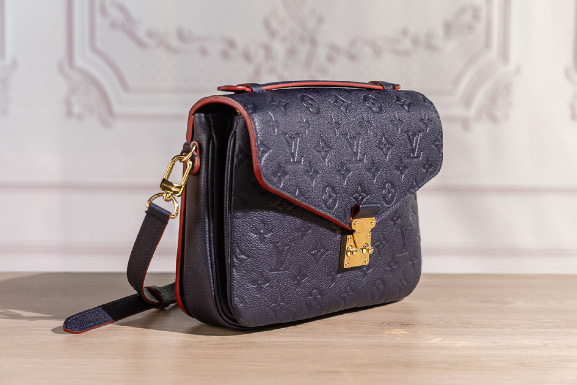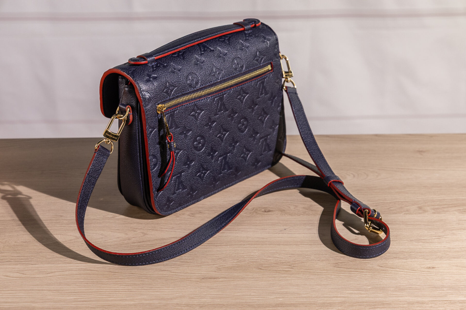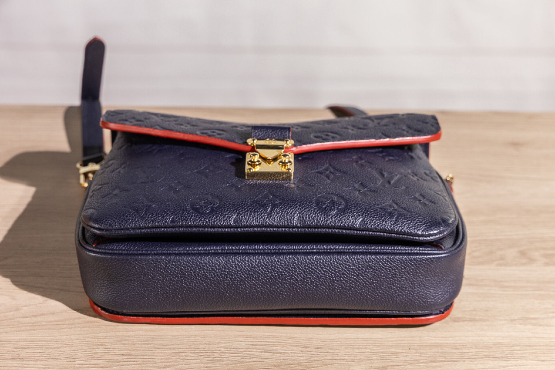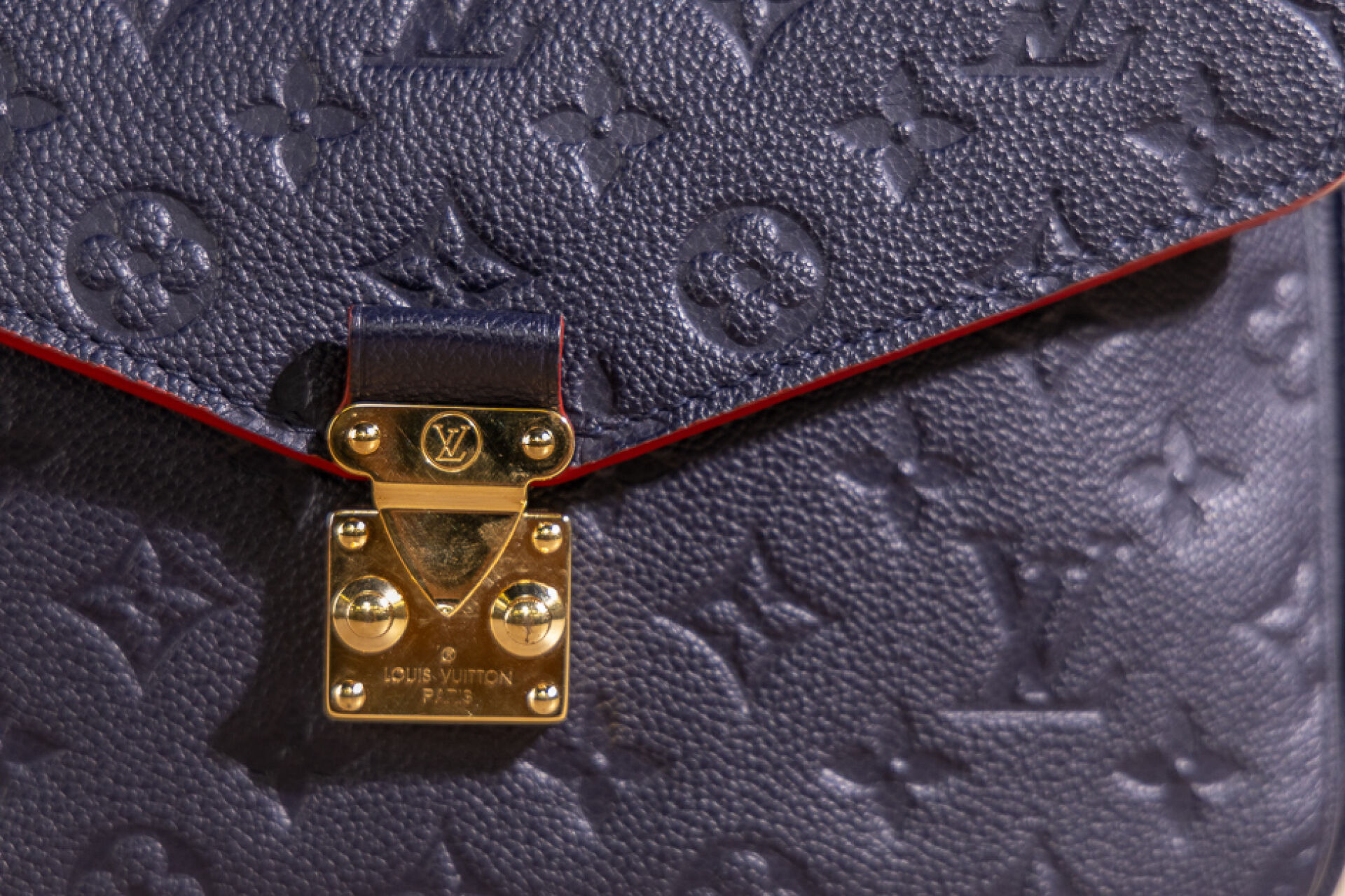 LOUIS VUITTON - Sac Metis en cuir grainé marine embossé au Monogram bord de tranche rouge coquelicot, fermoir cartable en métal doré sur rabat, poignée, poche zippée au dos, doublure principale à trois compartiments en coton rouge rayé noir, anse bandoulière amovible réglable. Tampon or Louis Vuitton Paris Made in Spain. (Bel état.) Haut. : 20,4 cm ; Long. : 24,9 cm ; Prof. : 6,6 cm Avec son dust bag et sa boîte.