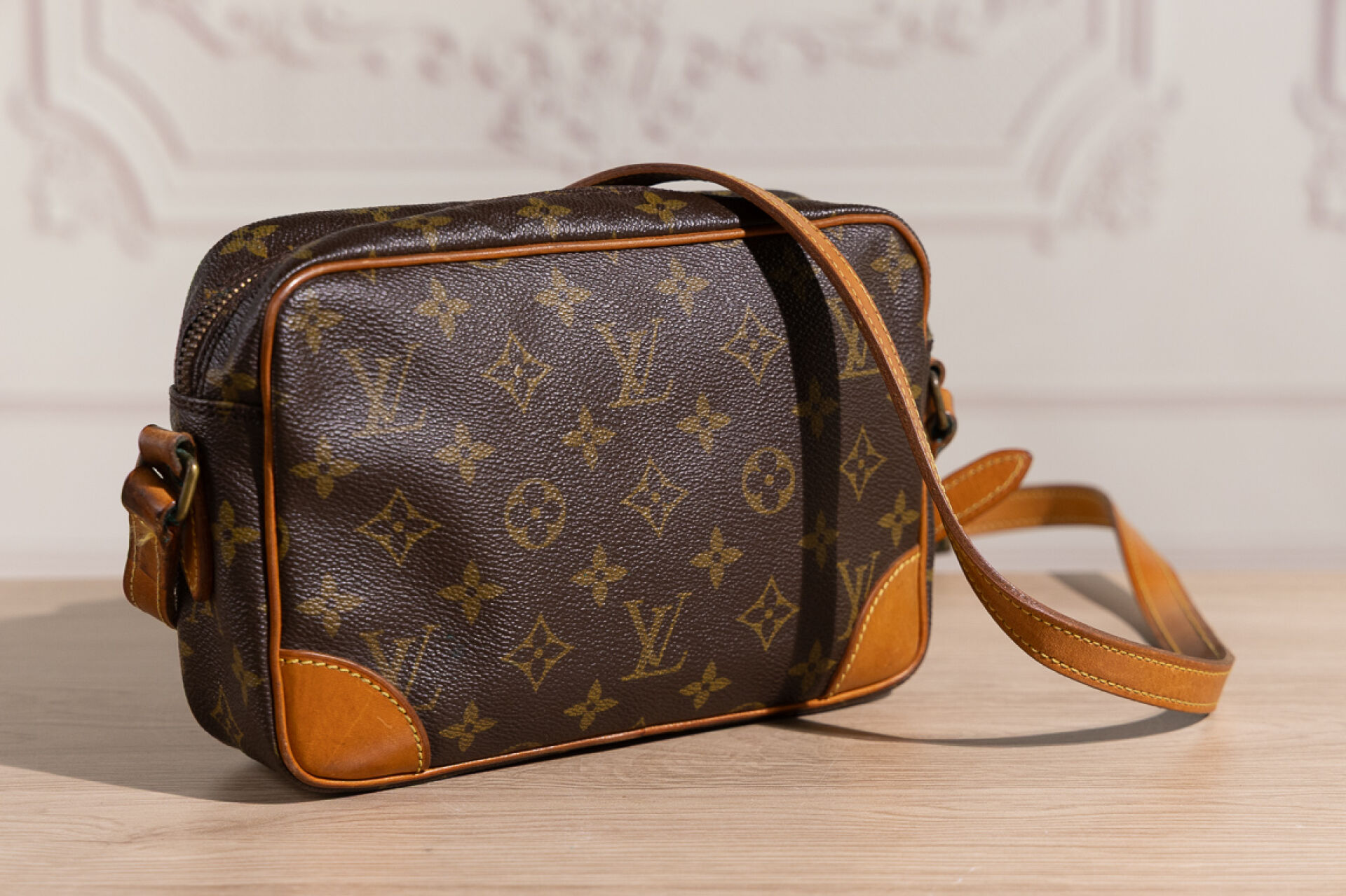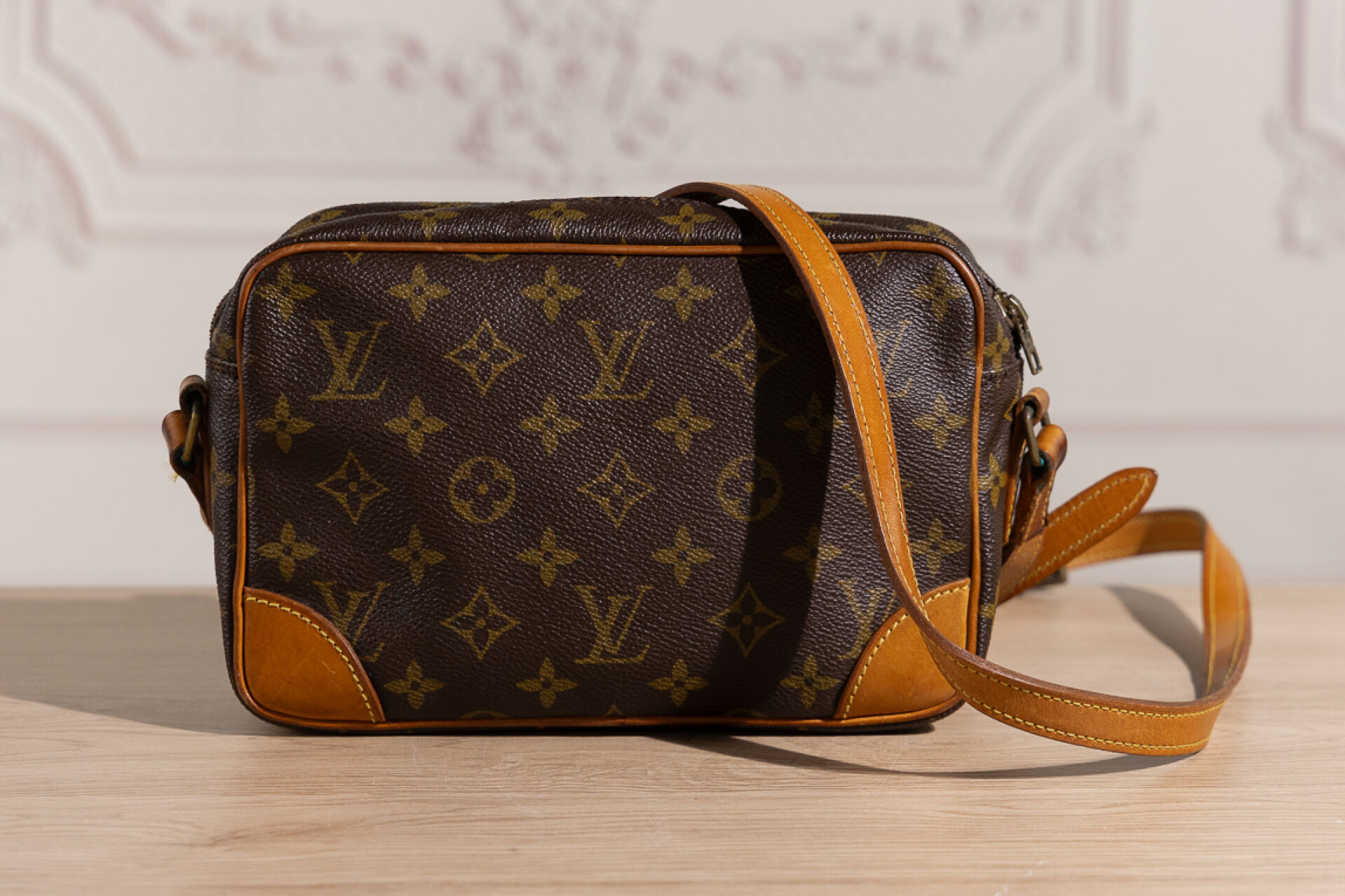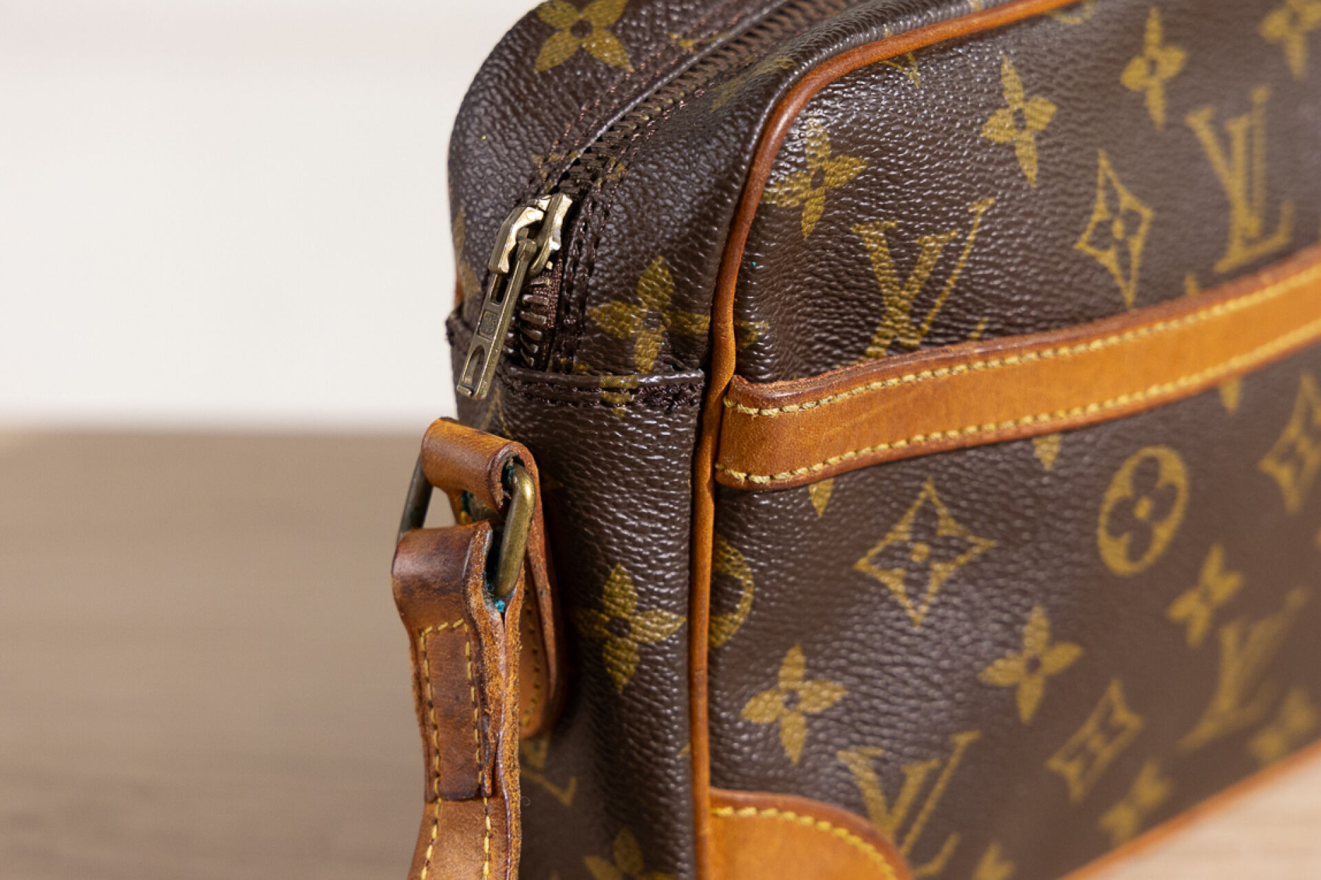 LOUIS VUITTON - Sac "Trocadéro", toile Monogram et cuir naturel, fermeture à glissière, anse bandoulière ajustable. fermeture intérieure zippée. Dustbag. Haut. : 15 cm - Long. : 22 cm Traces d'oxydation, patine au cuir