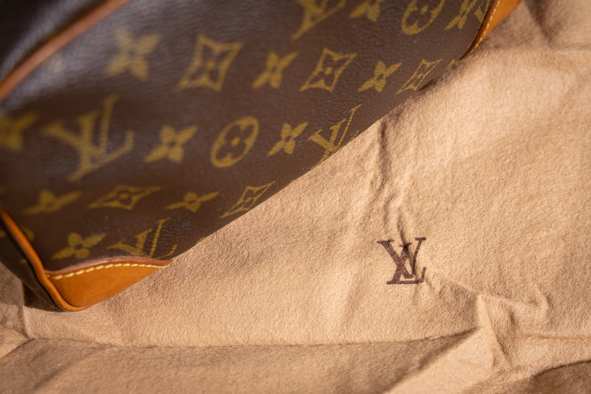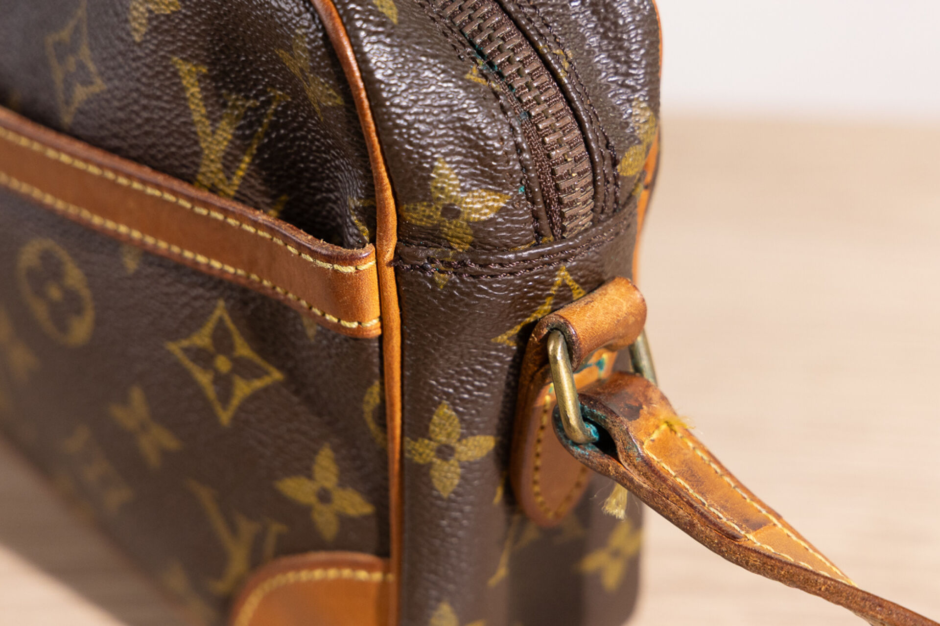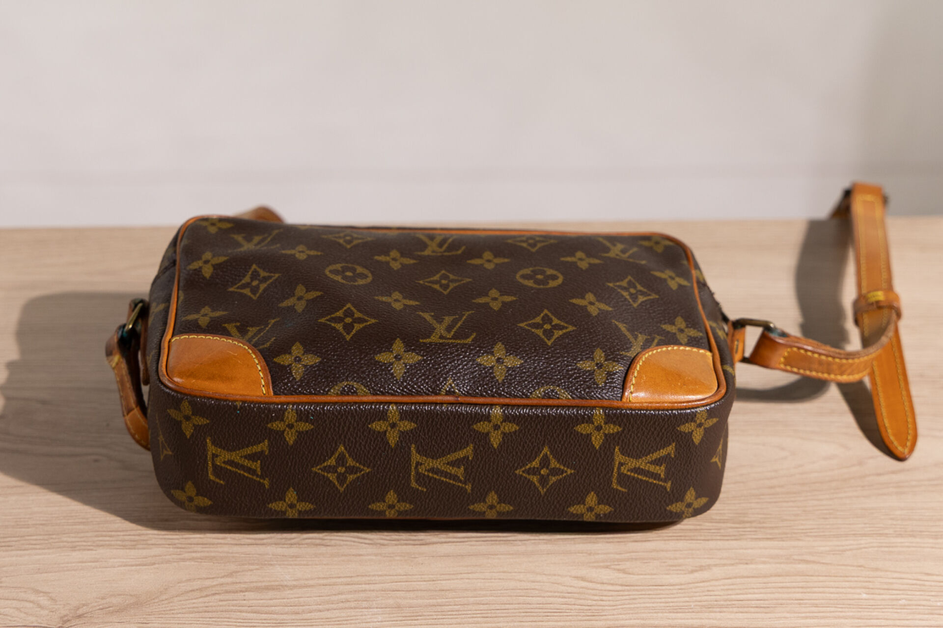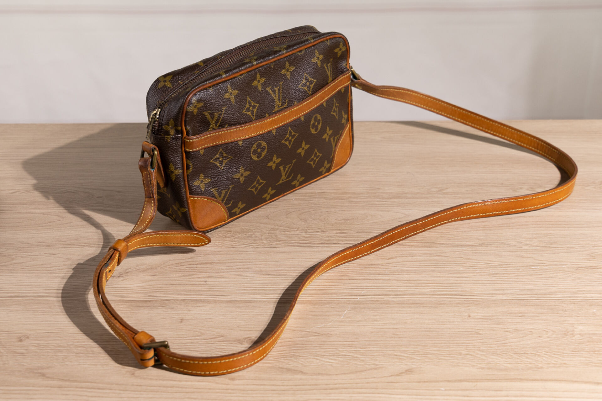 LOUIS VUITTON - Sac "Trocadéro", toile Monogram et cuir naturel, fermeture à glissière, anse bandoulière ajustable. fermeture intérieure zippée. Dustbag. Haut. : 15 cm - Long. : 22 cm Traces d'oxydation, patine au cuir