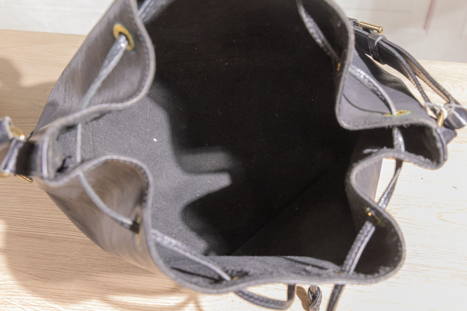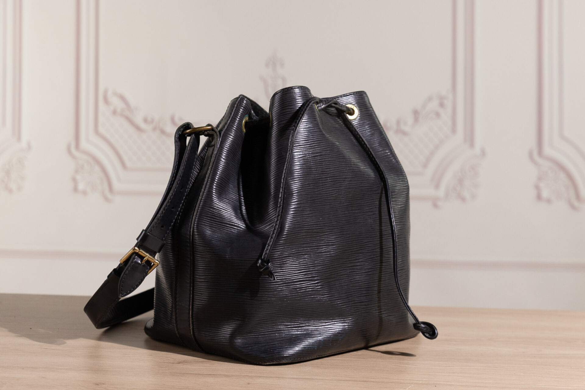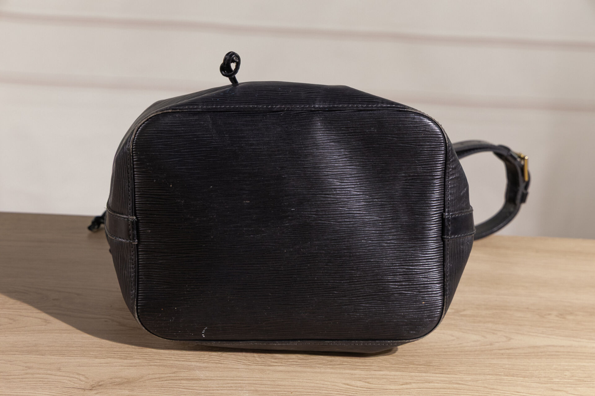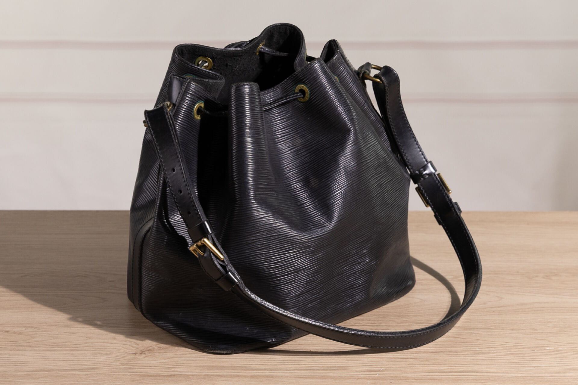 LOUIS VUITTON - Sac "Noé" en cuir épi noir, anse bandoulière ajustable, doublure tissu noir, lien coulissé sur œillets siglés. Haut. : 25 cm - Long. : 25 cm Usures à la doublure, oxydation aux œillets