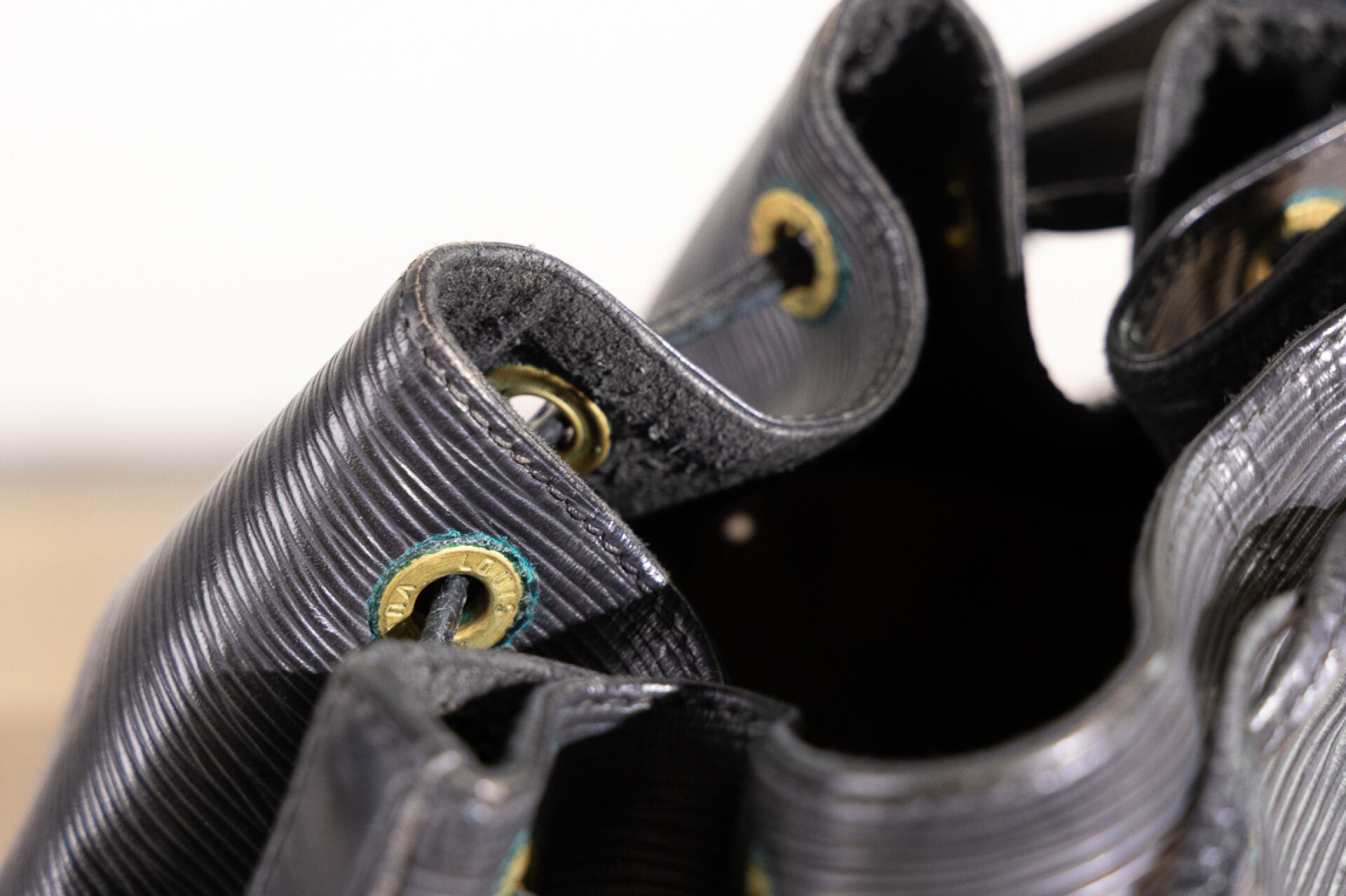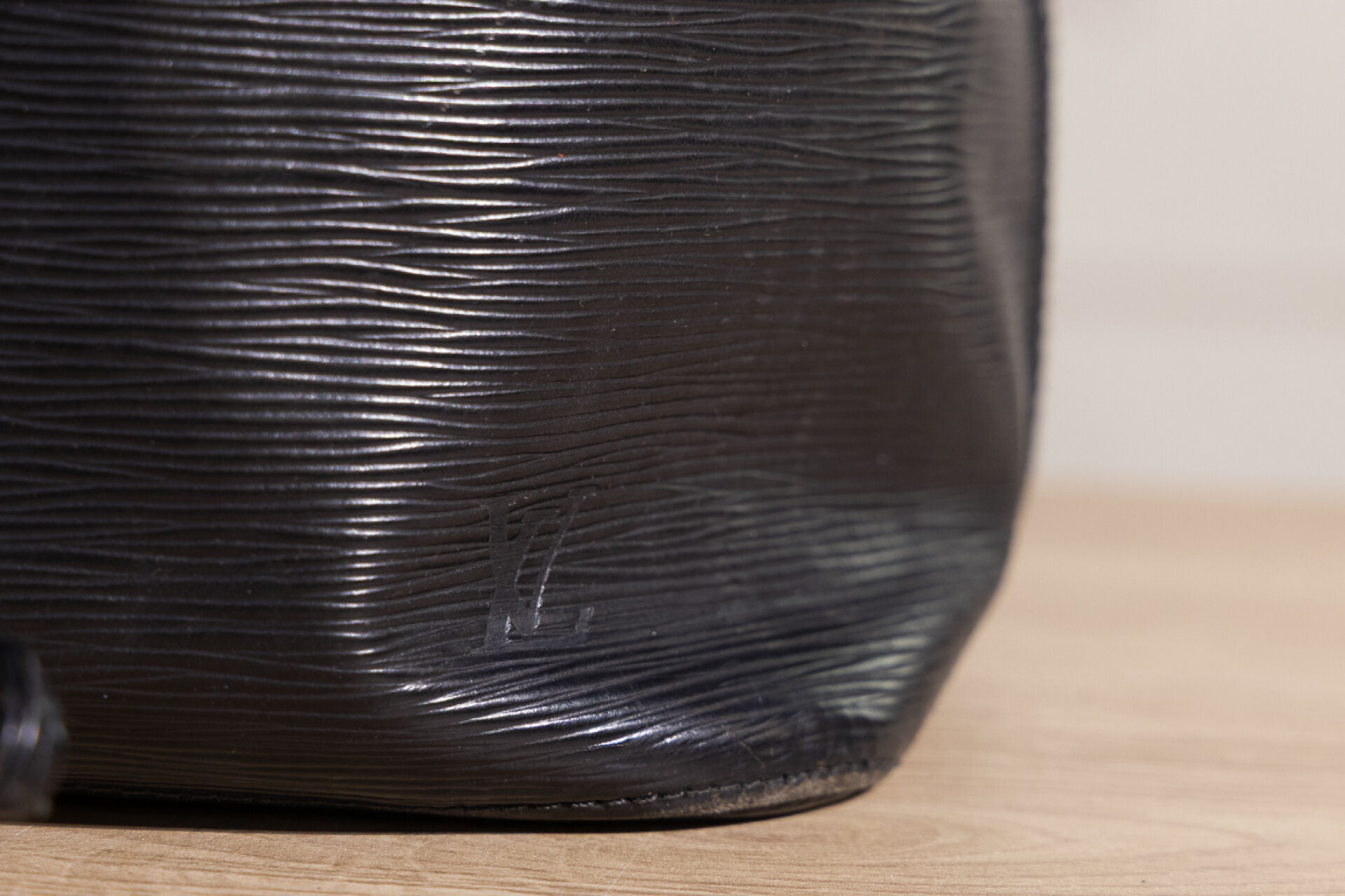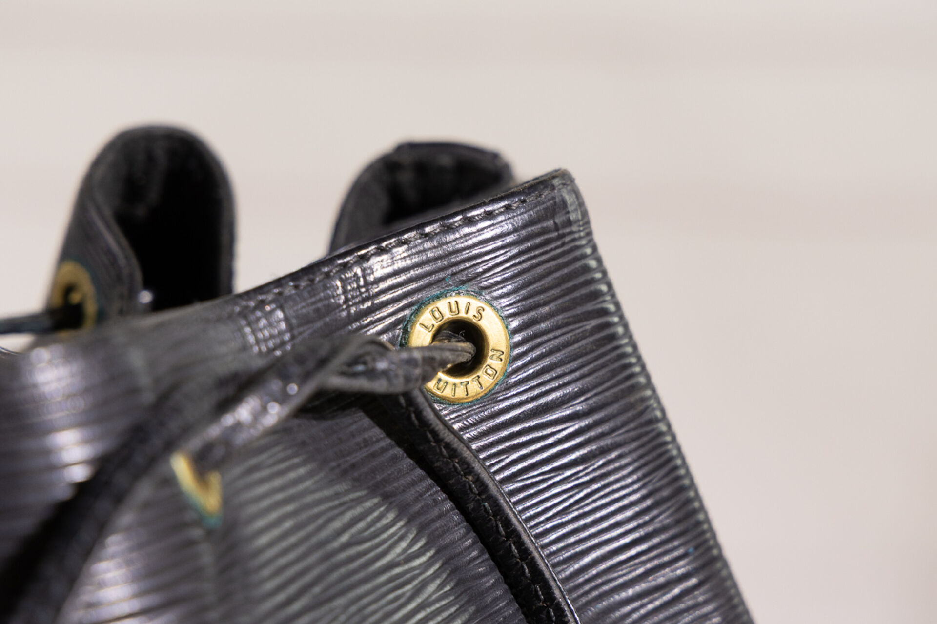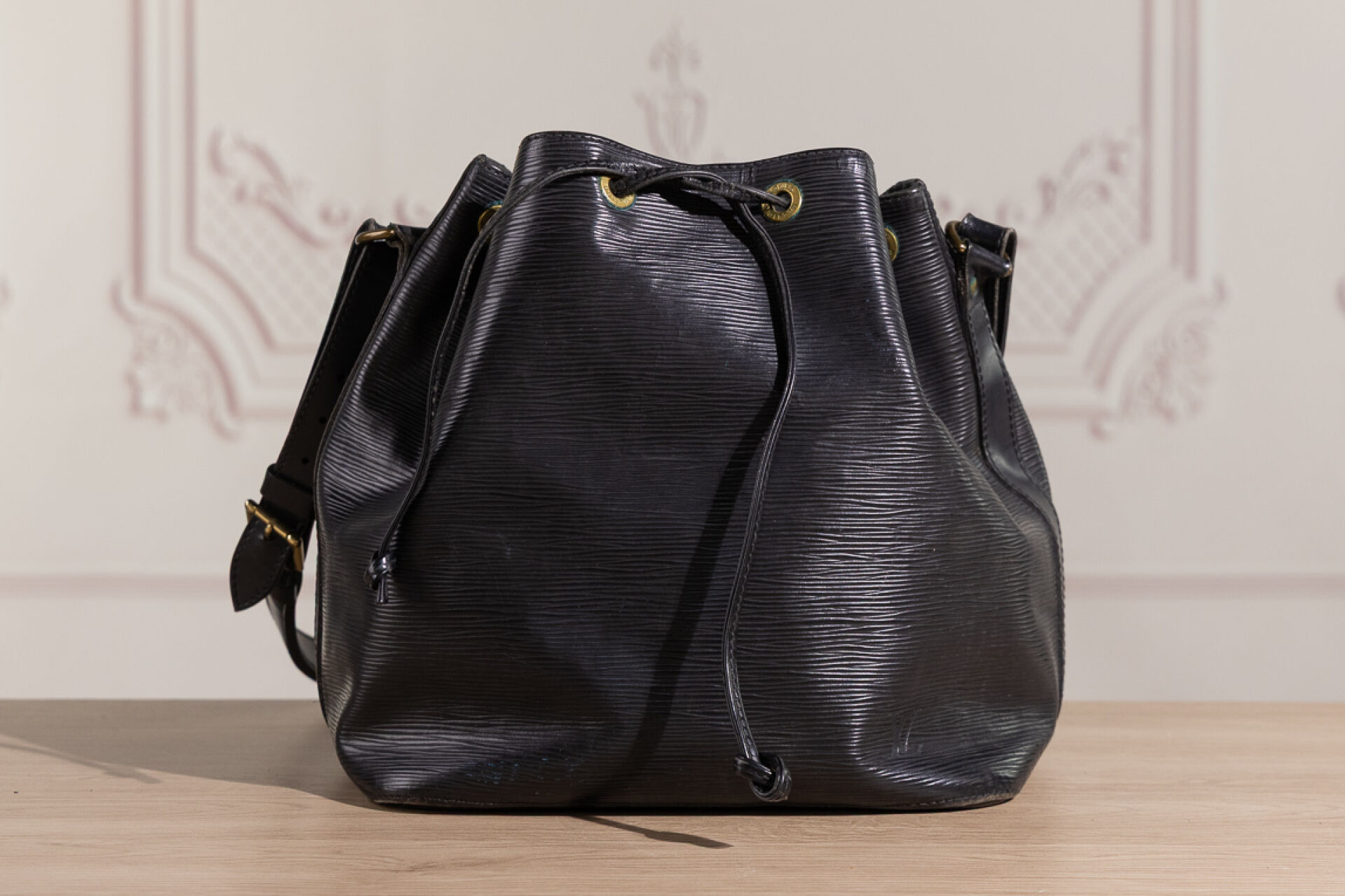 LOUIS VUITTON - Sac "Noé" en cuir épi noir, anse bandoulière ajustable, doublure tissu noir, lien coulissé sur œillets siglés. Haut. : 25 cm - Long. : 25 cm Usures à la doublure, oxydation aux œillets