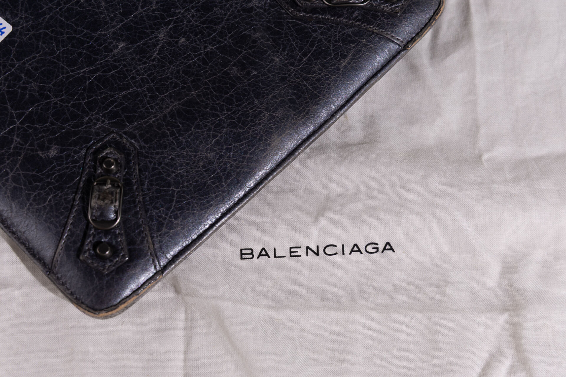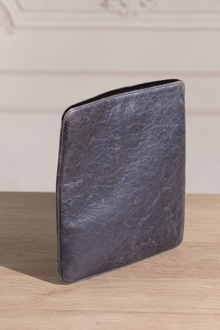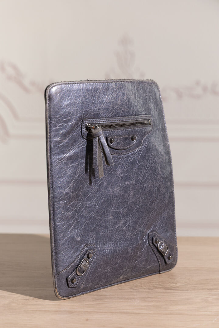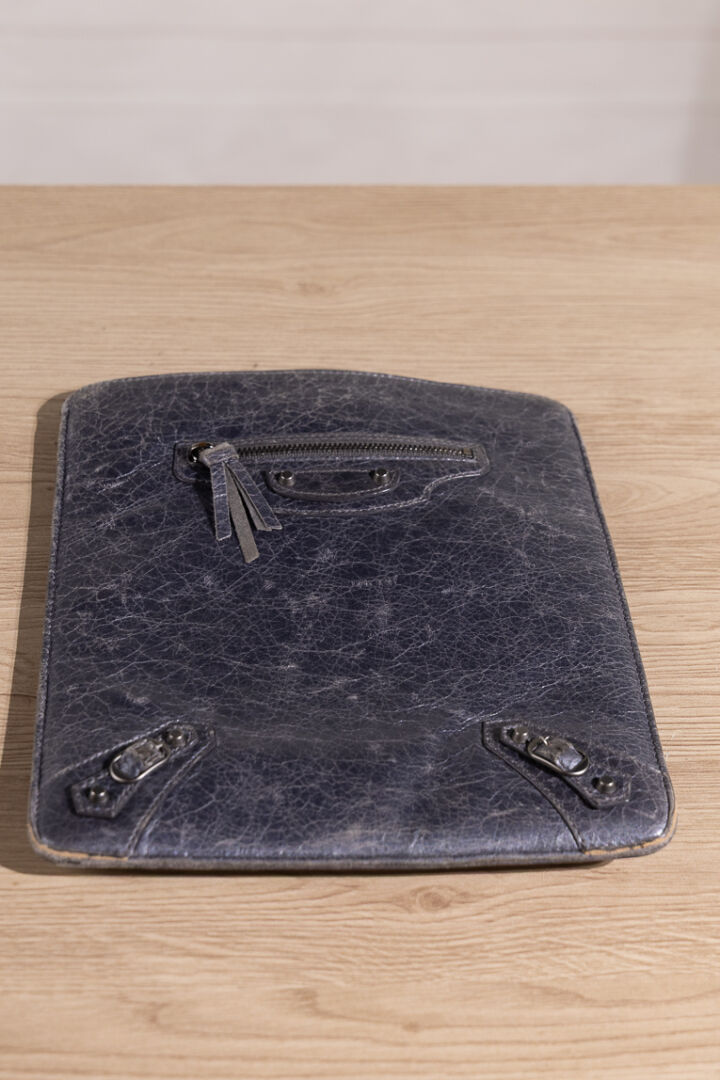 BALENCIAGA - Pochette pour tablette en cuir vieilli bleu/gris, poche extérieure zippée, clous et boucle en métal vieilli. Dustbag. Haut. : 25 cm - Long. : 21 cm Usures aux angles