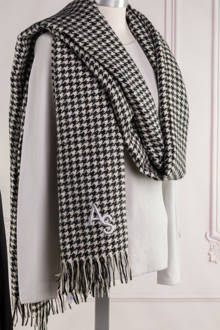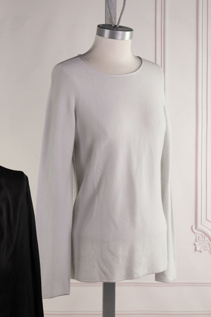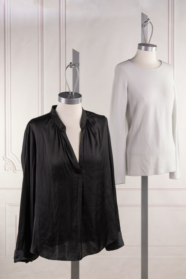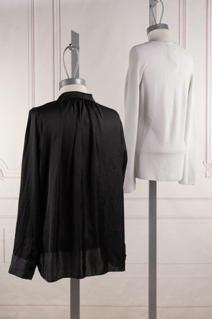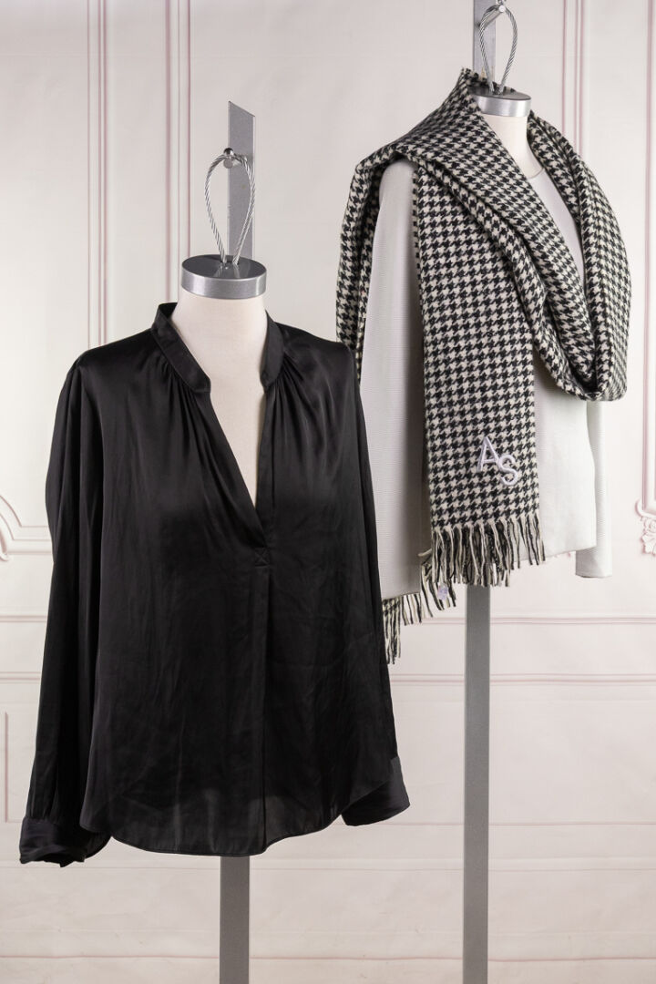 GIORGIO ARMANI, ZADIG & VOLTAIRE - Lot composé d'un top à manches longues finement côtelé gris et d'une blouse noire. Tailles fr 42 et M Nous joignons une large écharpe pied de coq noir/blanc et lurex doré à bords frangés et lettres AS.
