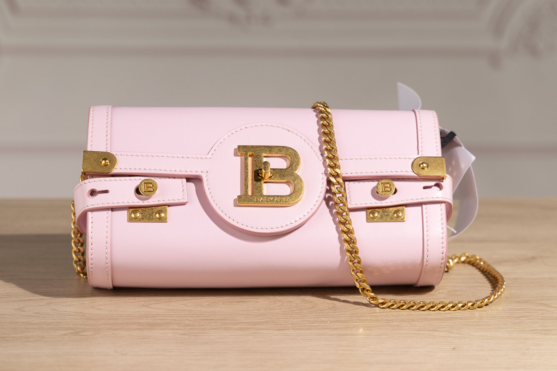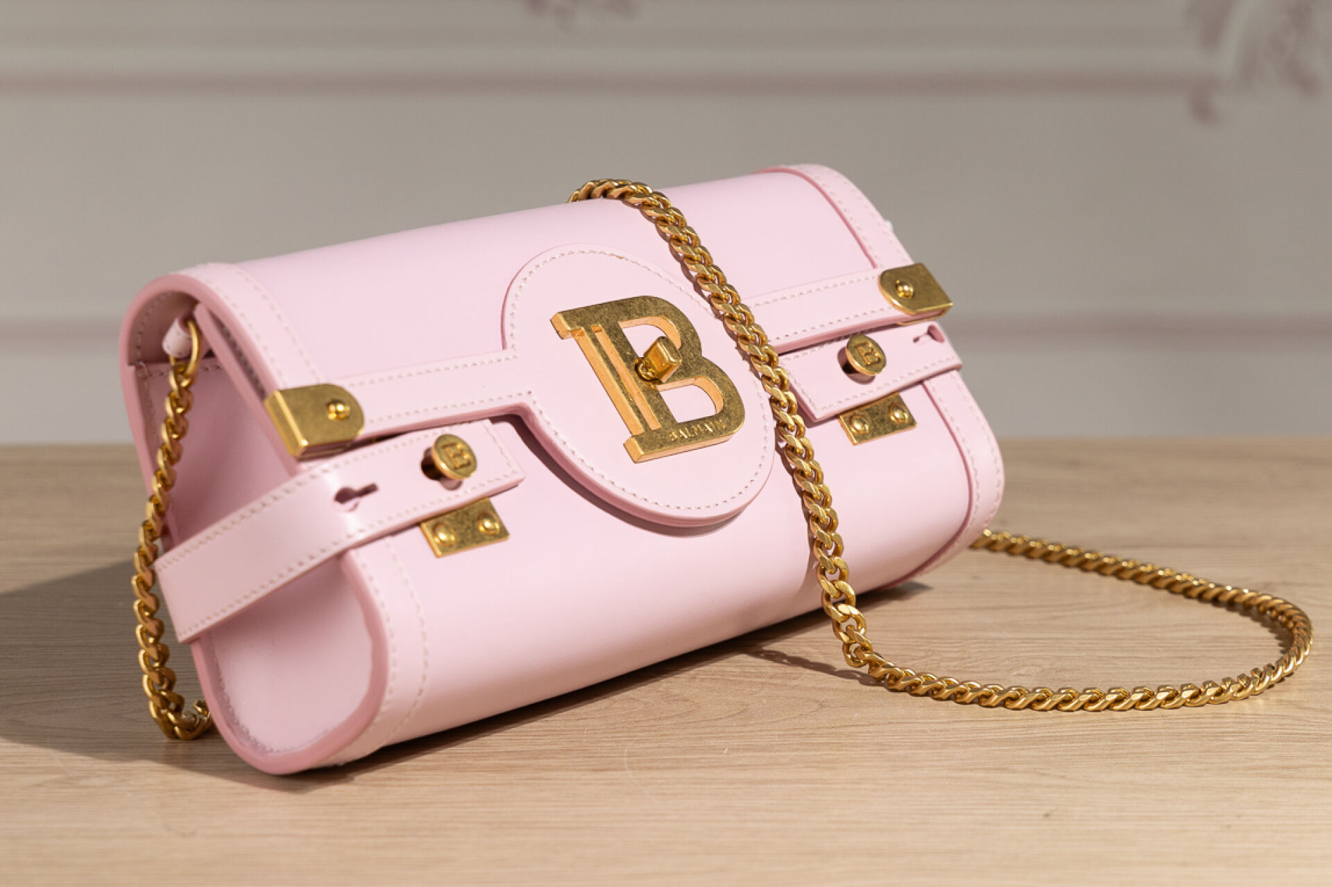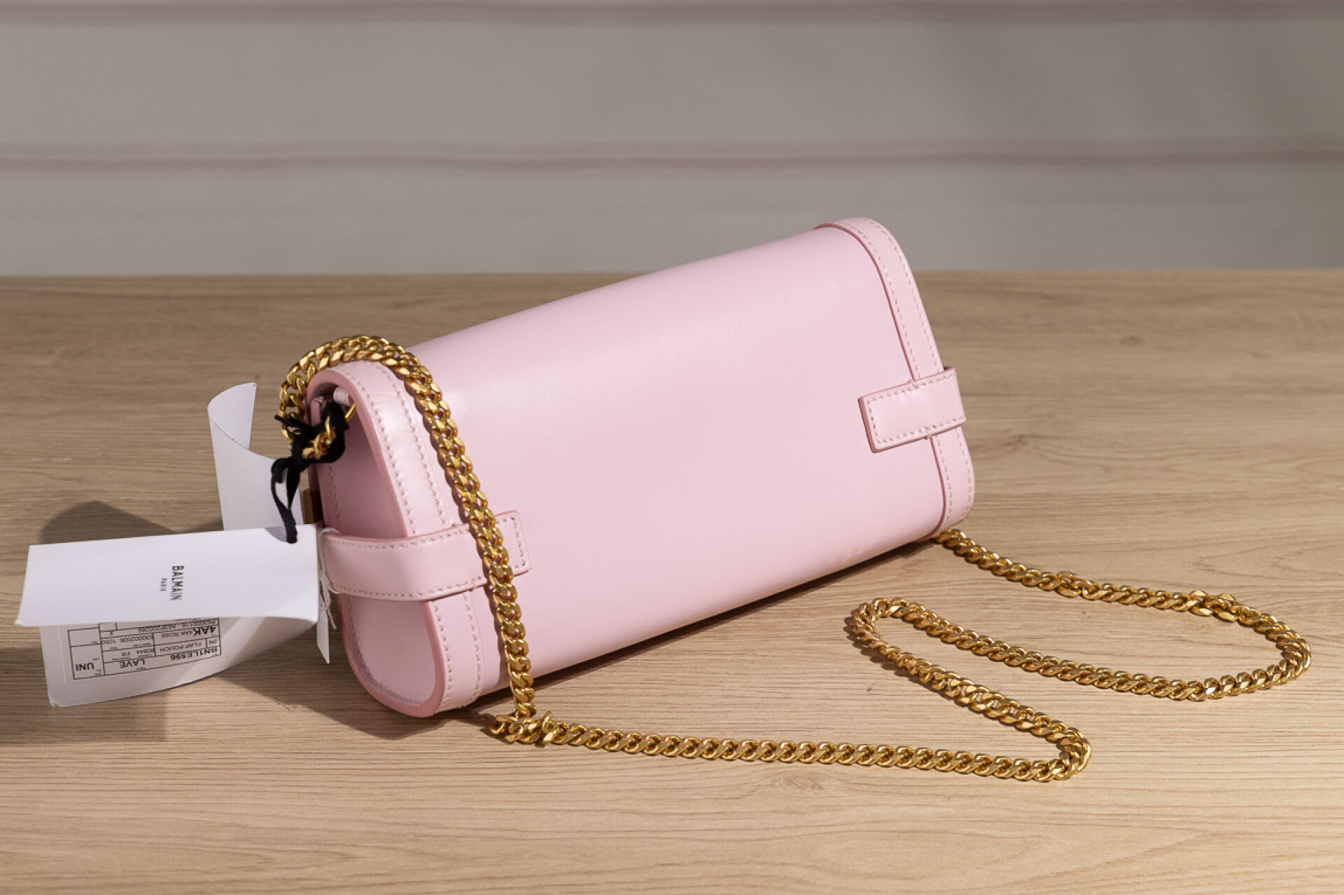 BALMAIN Paris - Sac "Flap Pouch" en veau rose poudré, doublure en suédine grise, bijouterie en métal doré, compartiment carte interne, anse bandoulière chaîne métal doré amovible. Dustbag et boite. Haut. : 11,5 cm - Long. : 23 cm Parfait état, avec étiquette, quelques légères traces sous le sac