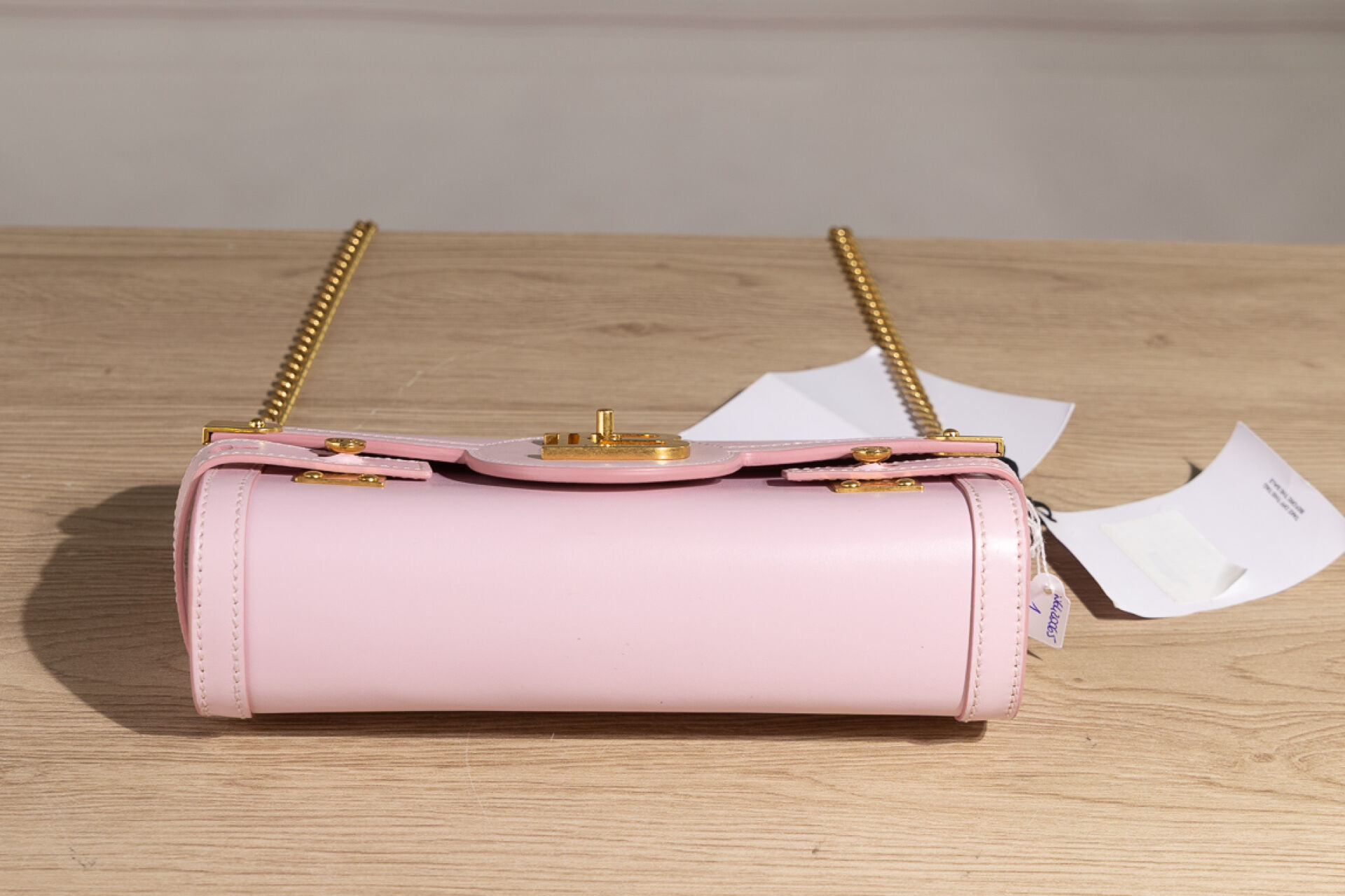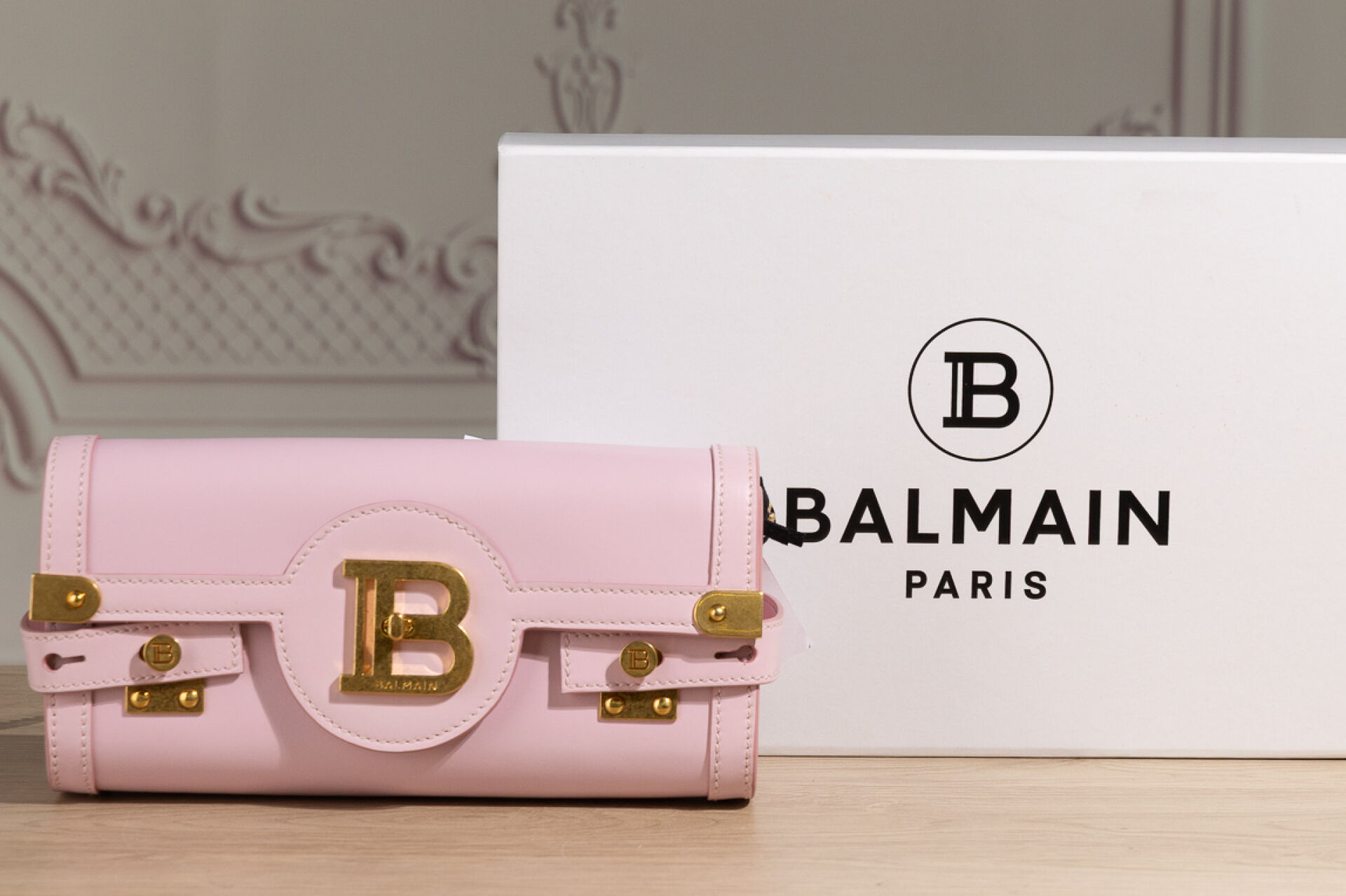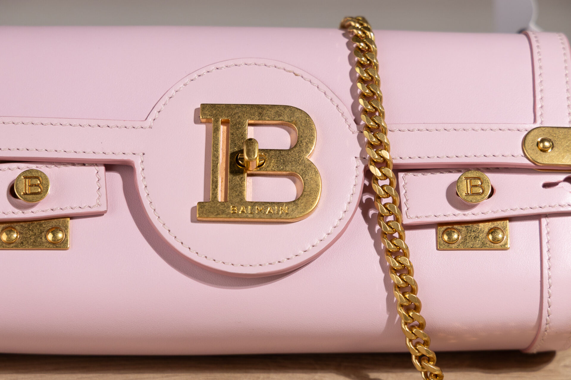 BALMAIN Paris - Sac "Flap Pouch" en veau rose poudré, doublure en suédine grise, bijouterie en métal doré, compartiment carte interne, anse bandoulière chaîne métal doré amovible. Dustbag et boite. Haut. : 11,5 cm - Long. : 23 cm Parfait état, avec étiquette, quelques légères traces sous le sac