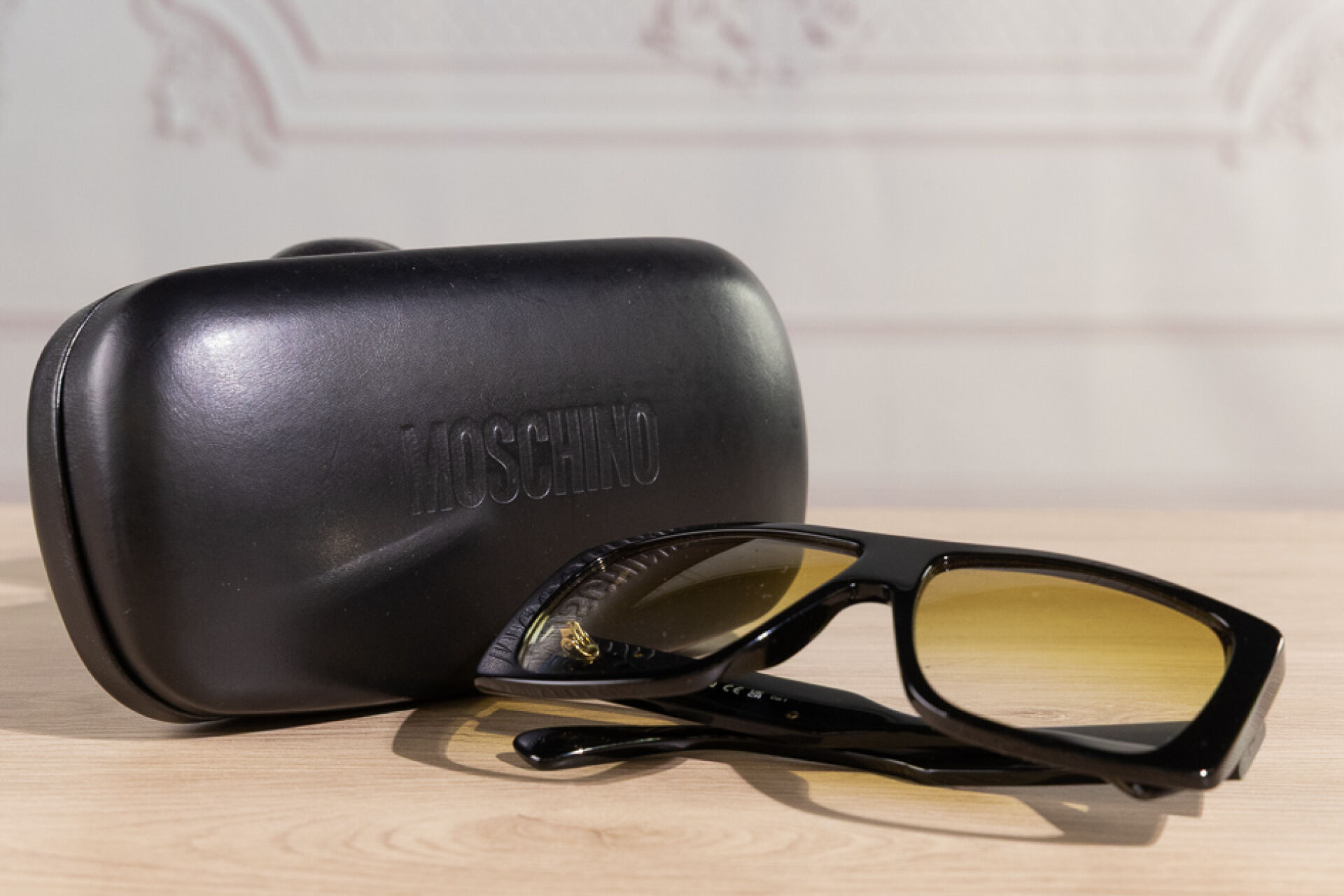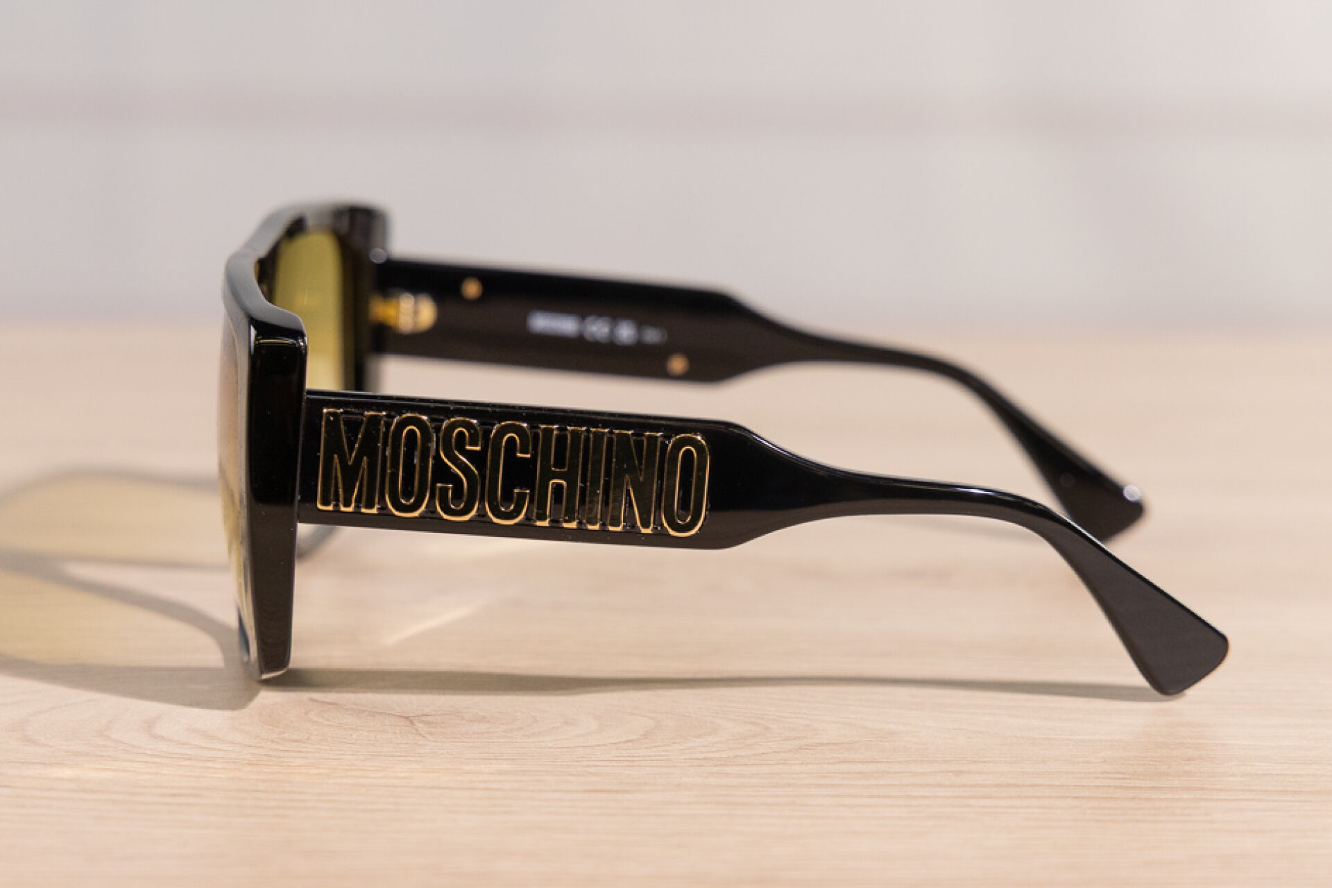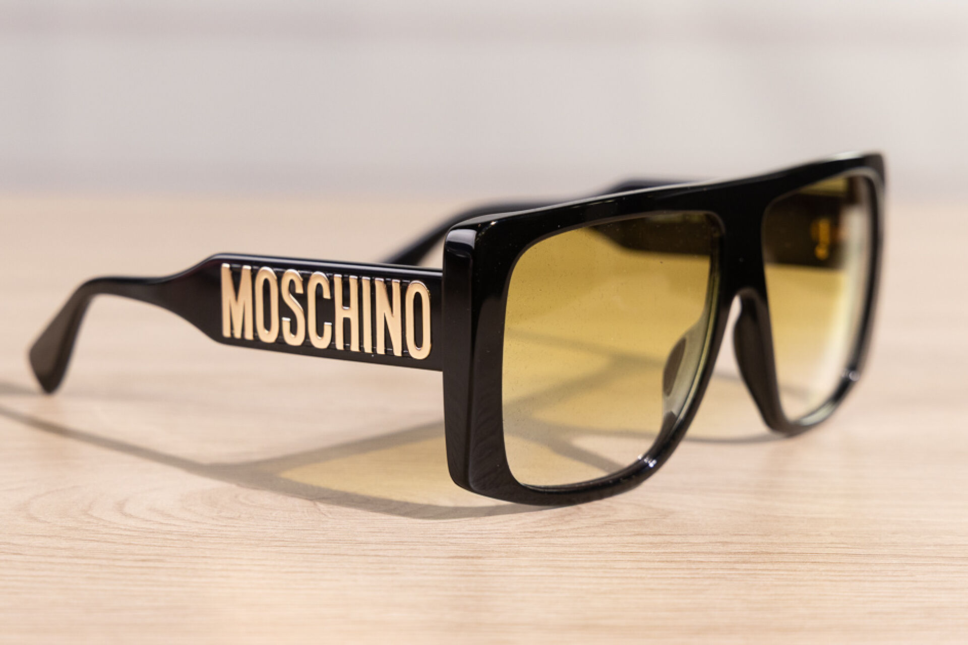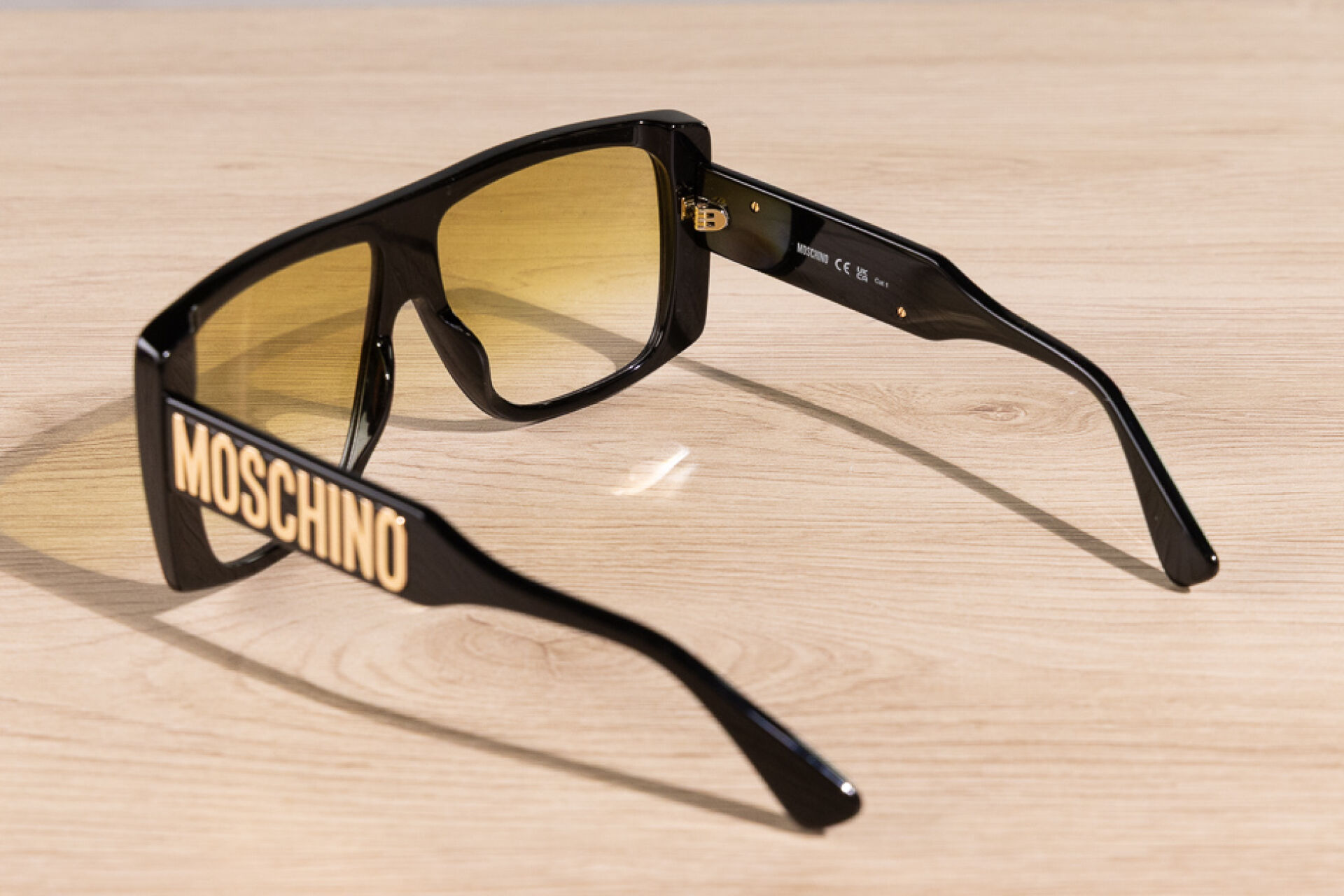 MOSCHINO - Paire de lunettes de soleil masque noir, branches aux lettres dorées, verres fumés jaune. Dans leur étui