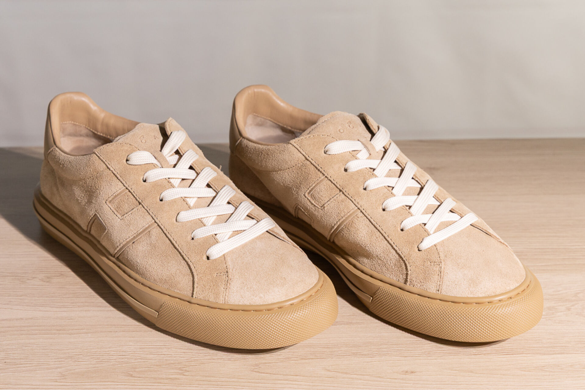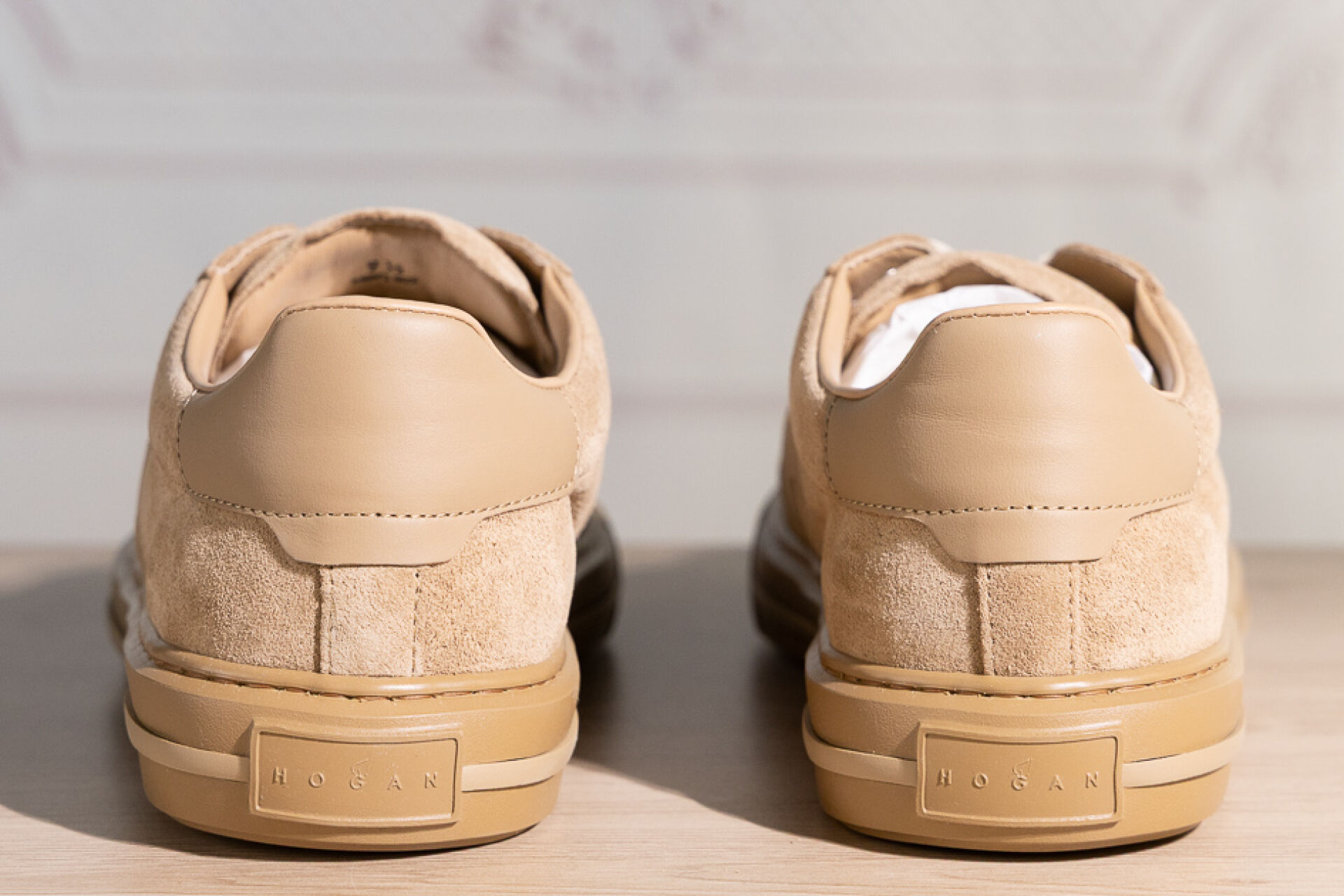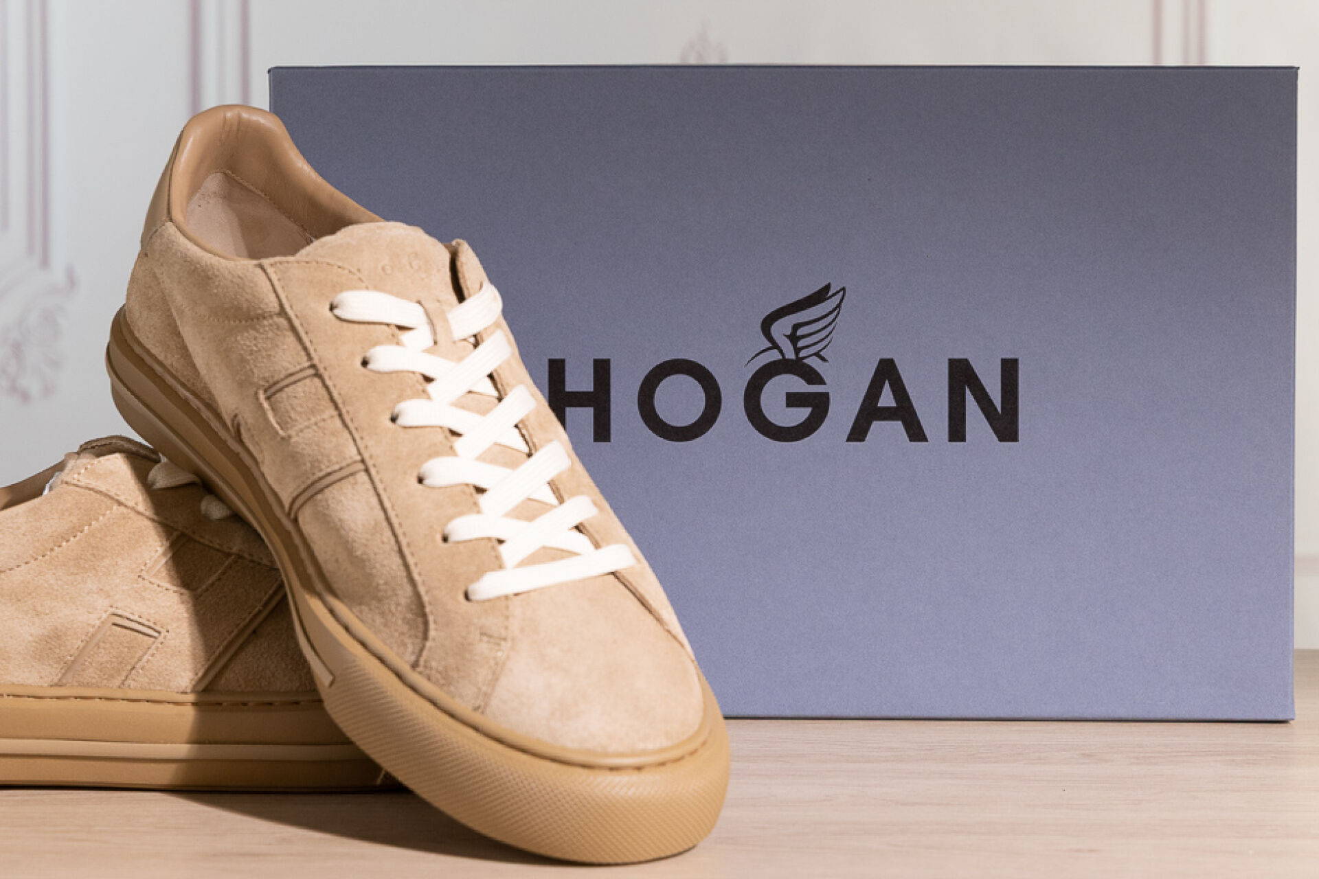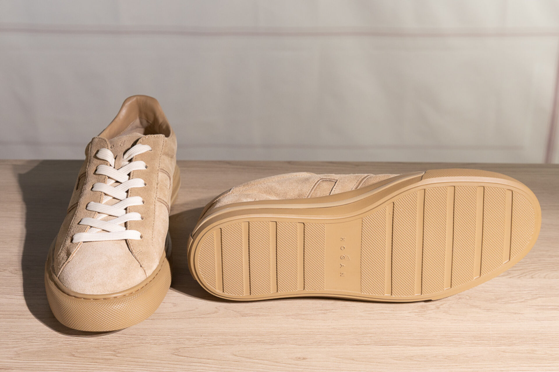 HOGAN - Paire de baskets homme en daim beige au H en surpiqures, lacets. Pointure 9,5 (soit 44 français) Non portées, boite, housse et lacets de rechange