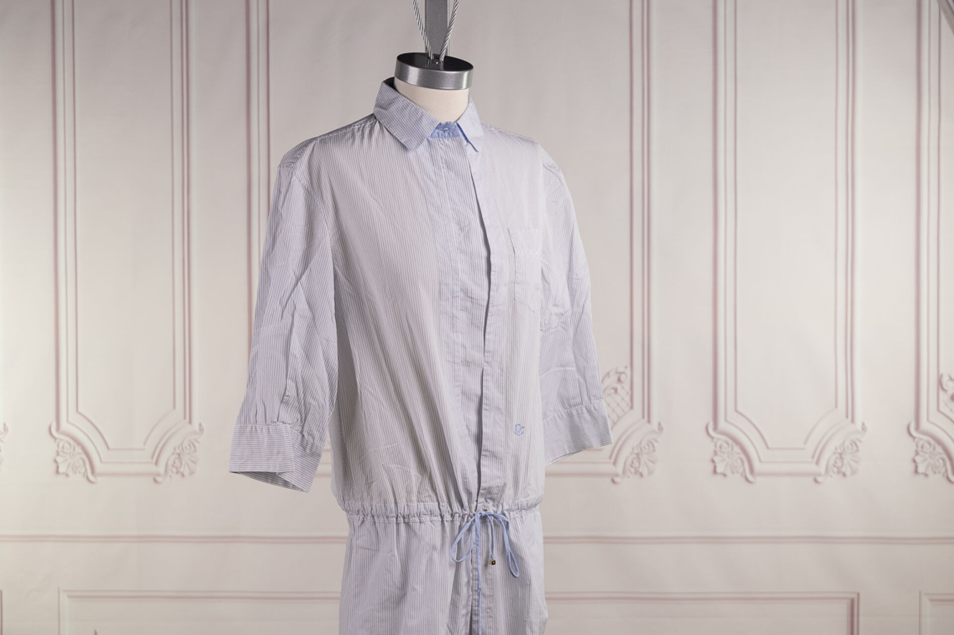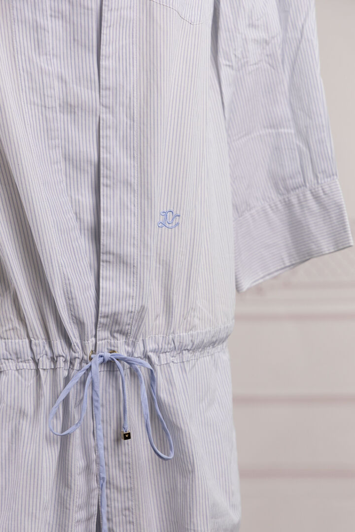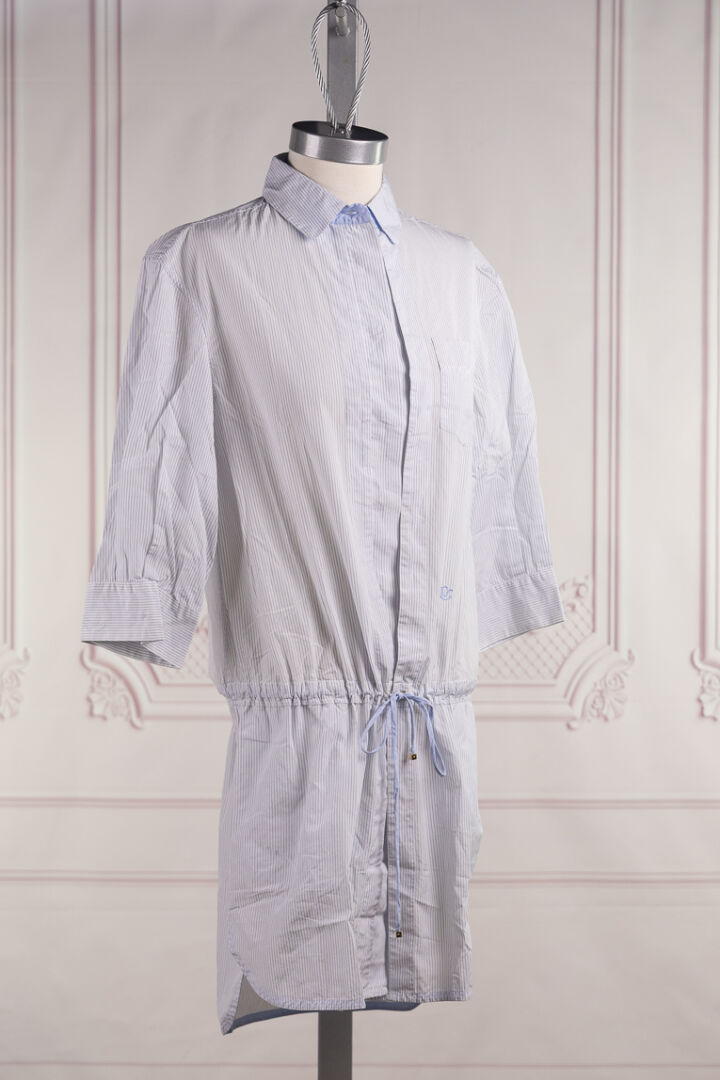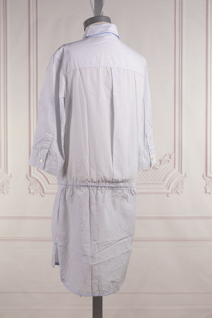LOUIS VUITTON - Robe/tunique en coton rayé bleu et blanc, petit col, simple boutonnage sous patte, lacet à la taille, deux poches en biais et poche poitrine, manches 3/4. Taille indiquée 36 Très bon état