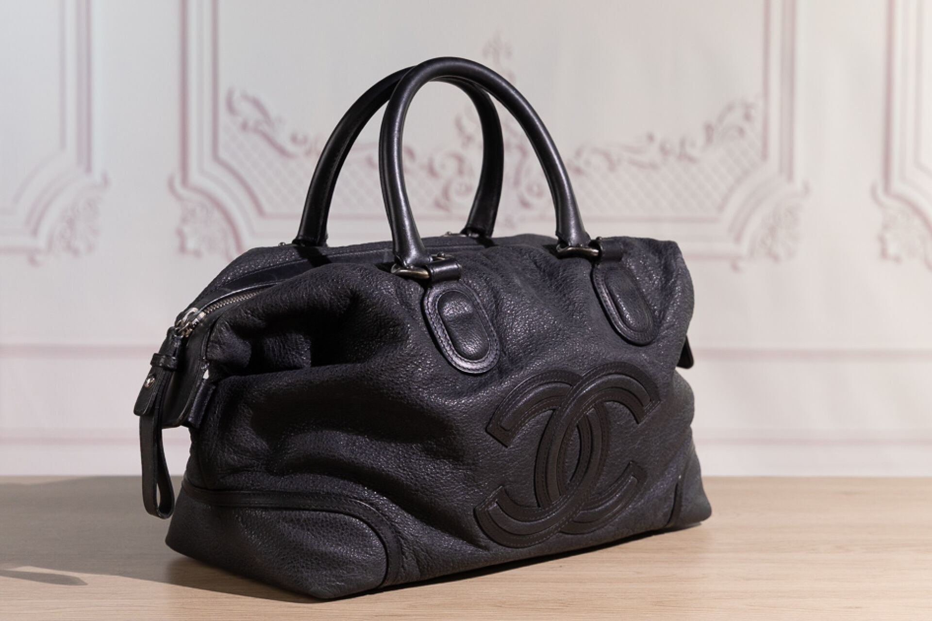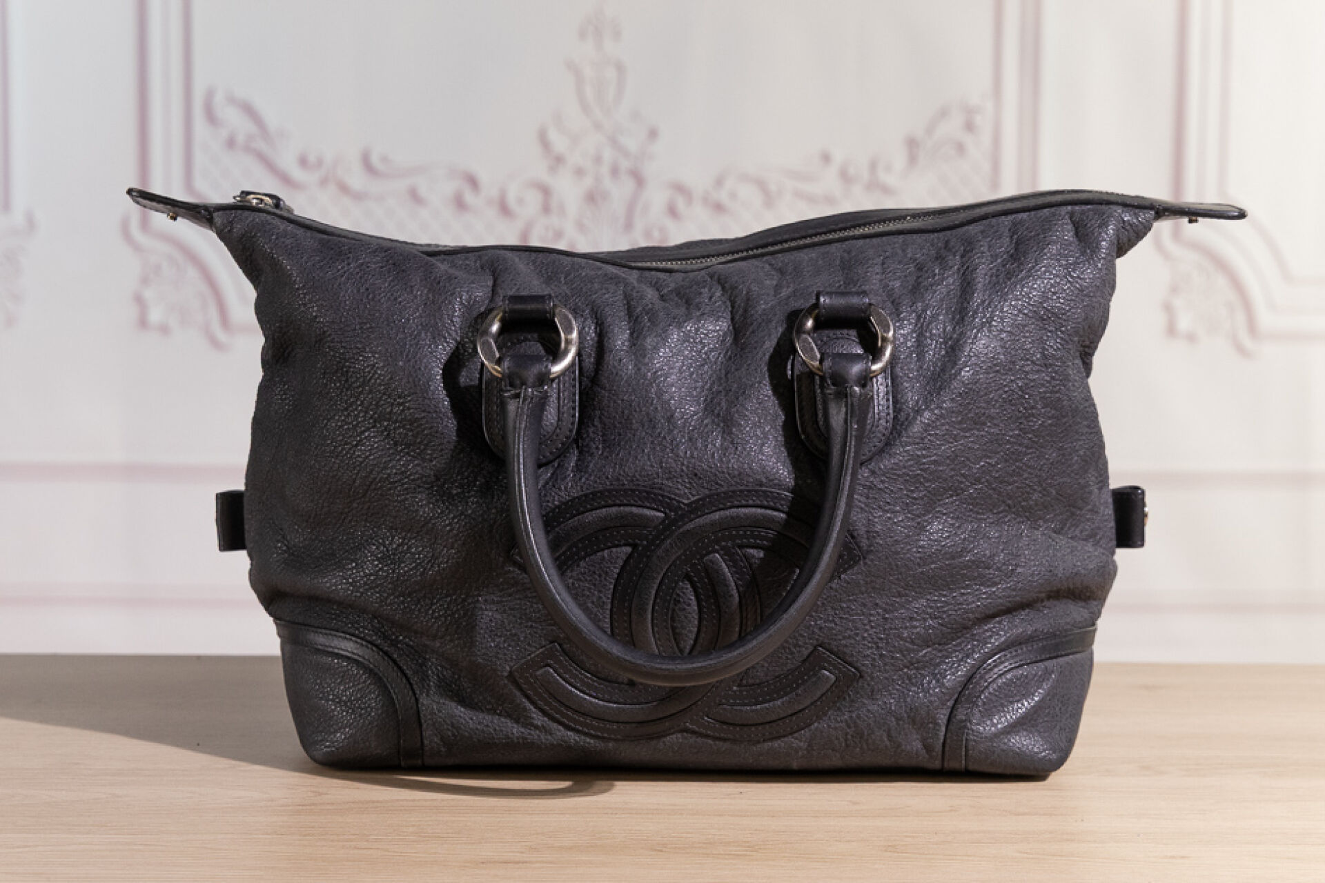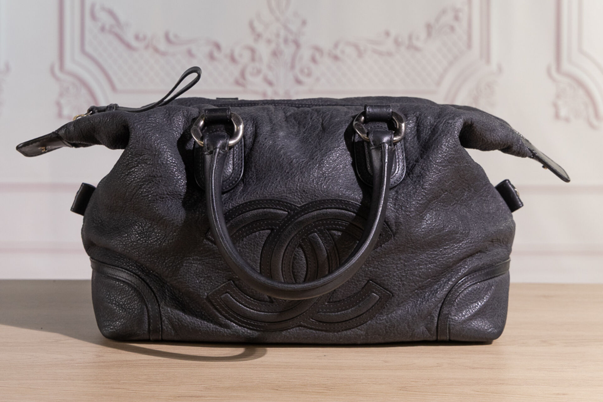 CHANEL - Sac bowling en cuir vieilli graphite et cuir lisse noir, sigle en surpiqûre devant, double poignées, fermeture à glissière, doublure en toile grise rayée. Tampon argent Chanel Made in Italy. Hologramme 14470777. (Bel état, infimes marques d'usage.) Haut. : 21 cm ; Long. : 35 cm ; Prof. : 14 cm (environ)