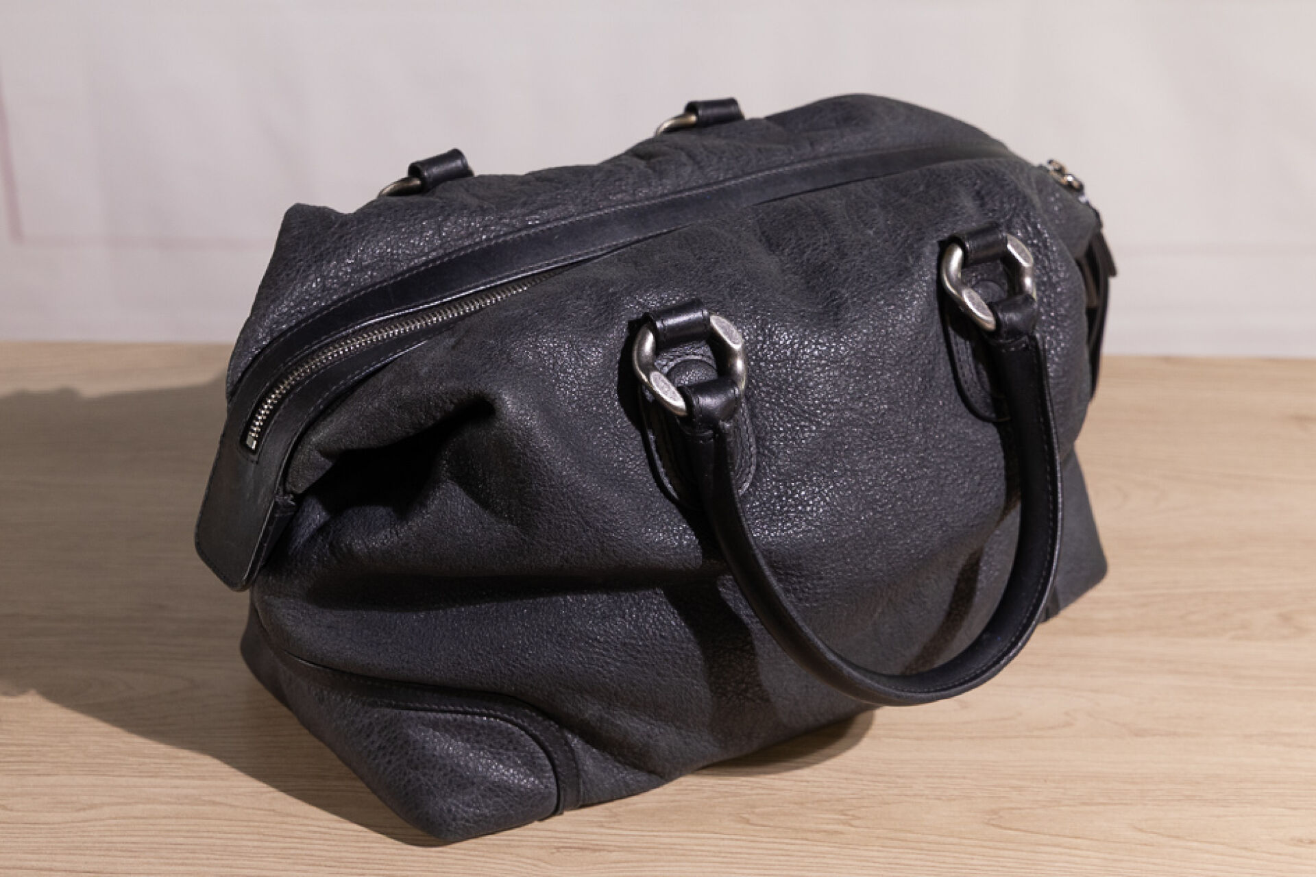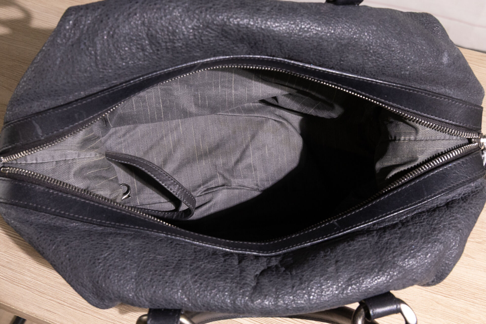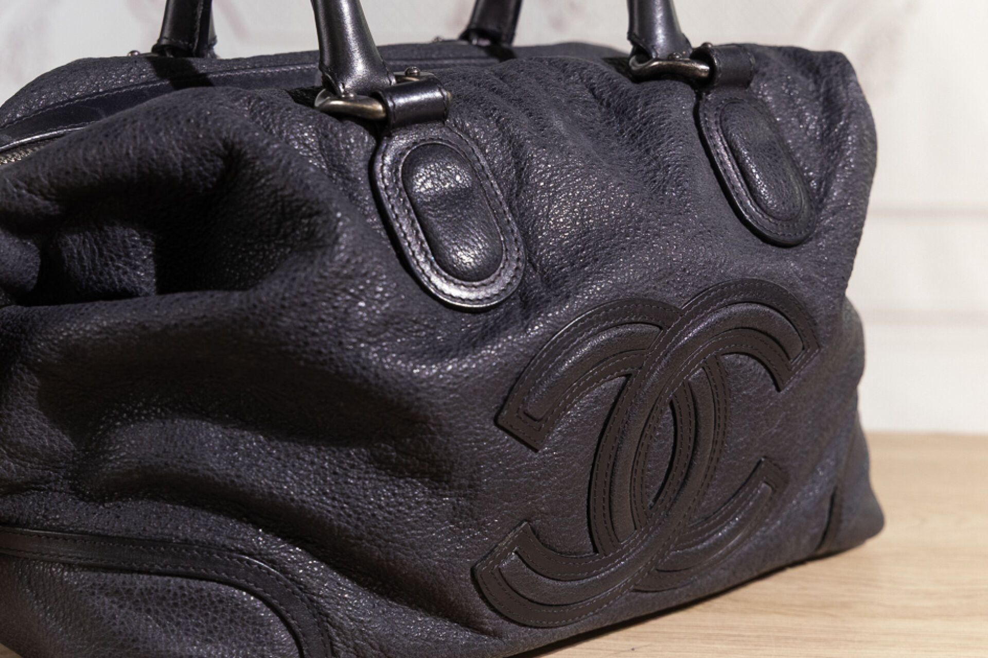 CHANEL - Sac bowling en cuir vieilli graphite et cuir lisse noir, sigle en surpiqûre devant, double poignées, fermeture à glissière, doublure en toile grise rayée. Tampon argent Chanel Made in Italy. Hologramme 14470777. (Bel état, infimes marques d'usage.) Haut. : 21 cm ; Long. : 35 cm ; Prof. : 14 cm (environ)
