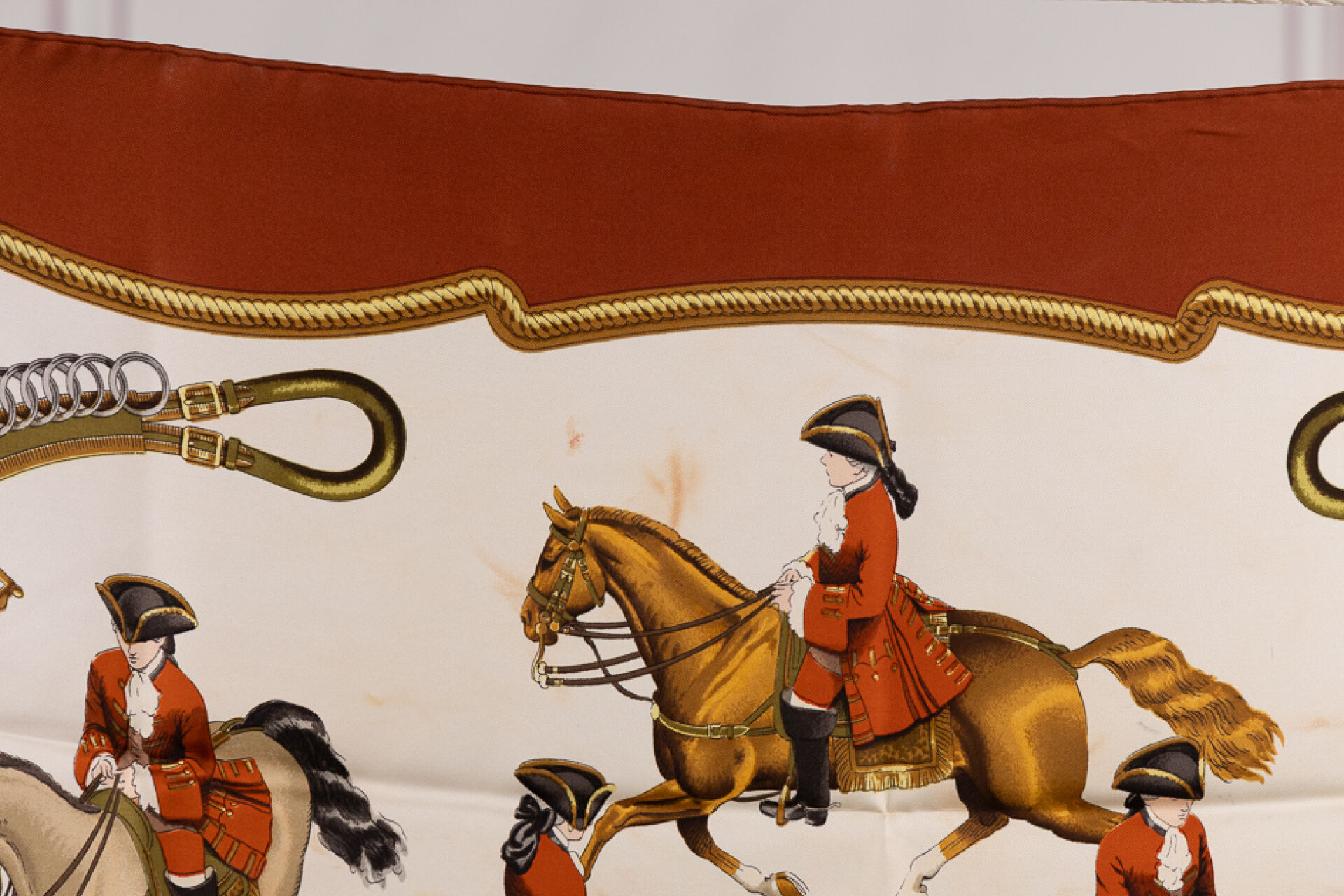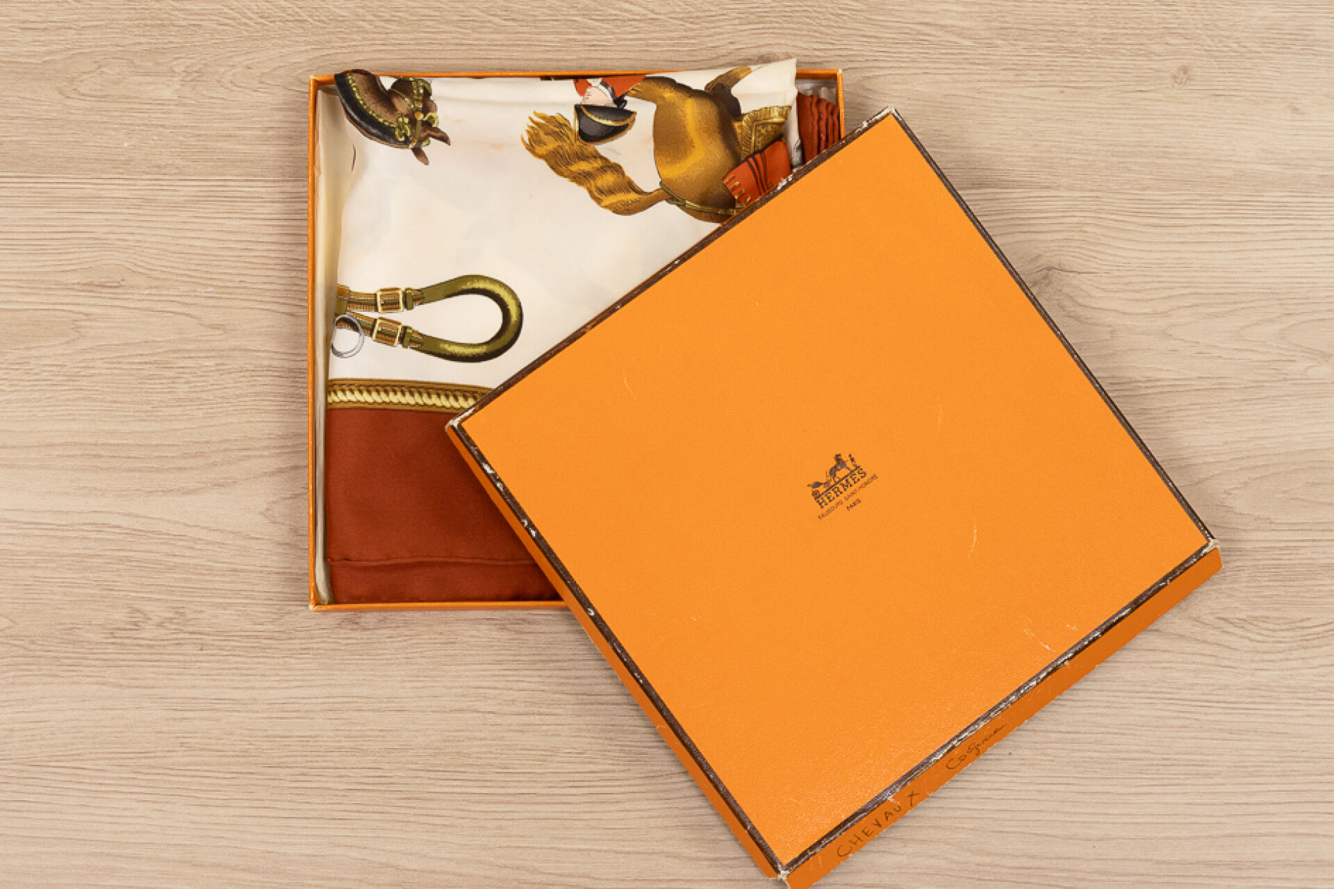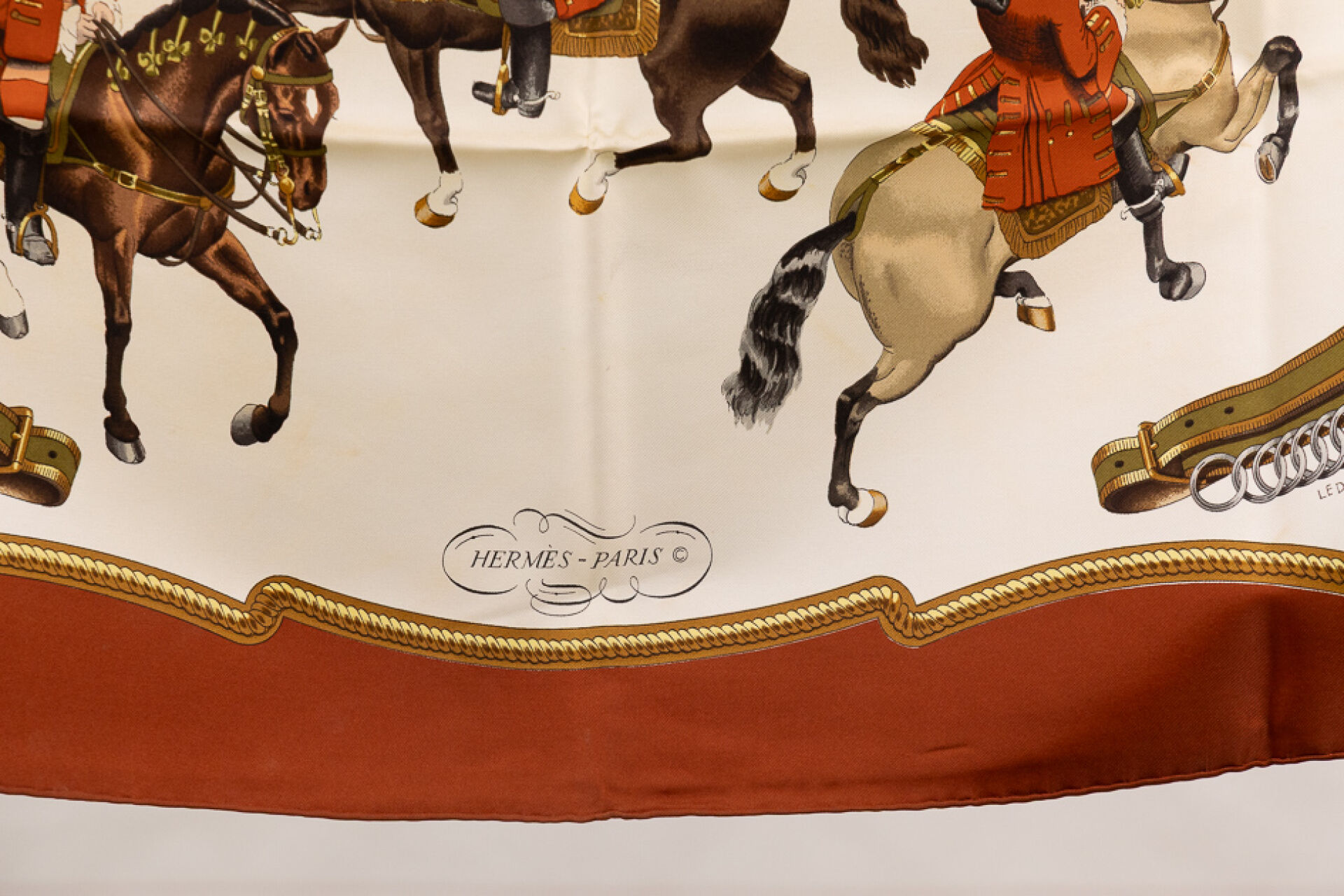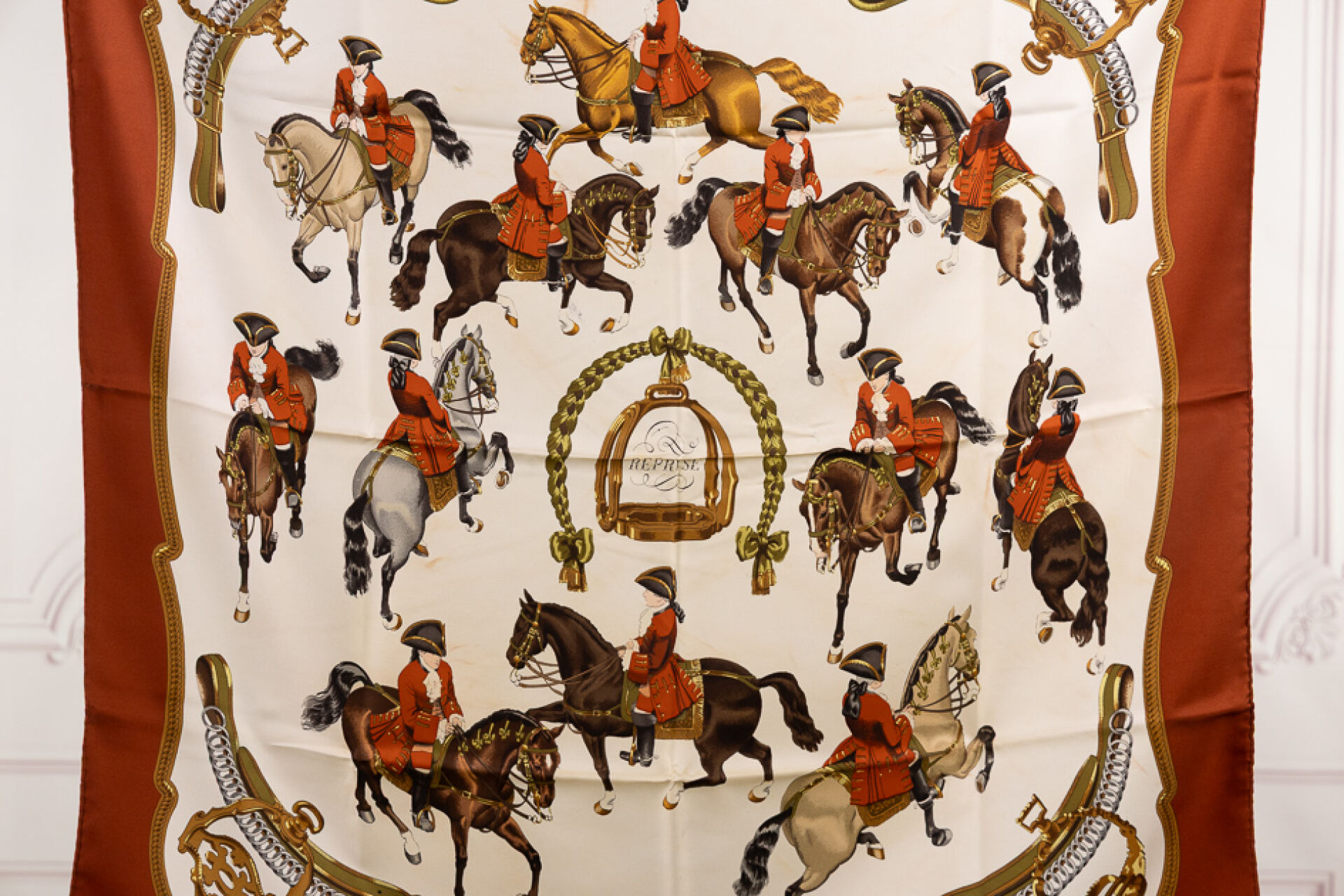 HERMES Paris - Carré en twill de soie imprimée, titré "Reprise", signé Ledoux, à dominantes marron et blanc. Dans une boite (abîmée). 90 x 90 cm Tâches, auréoles