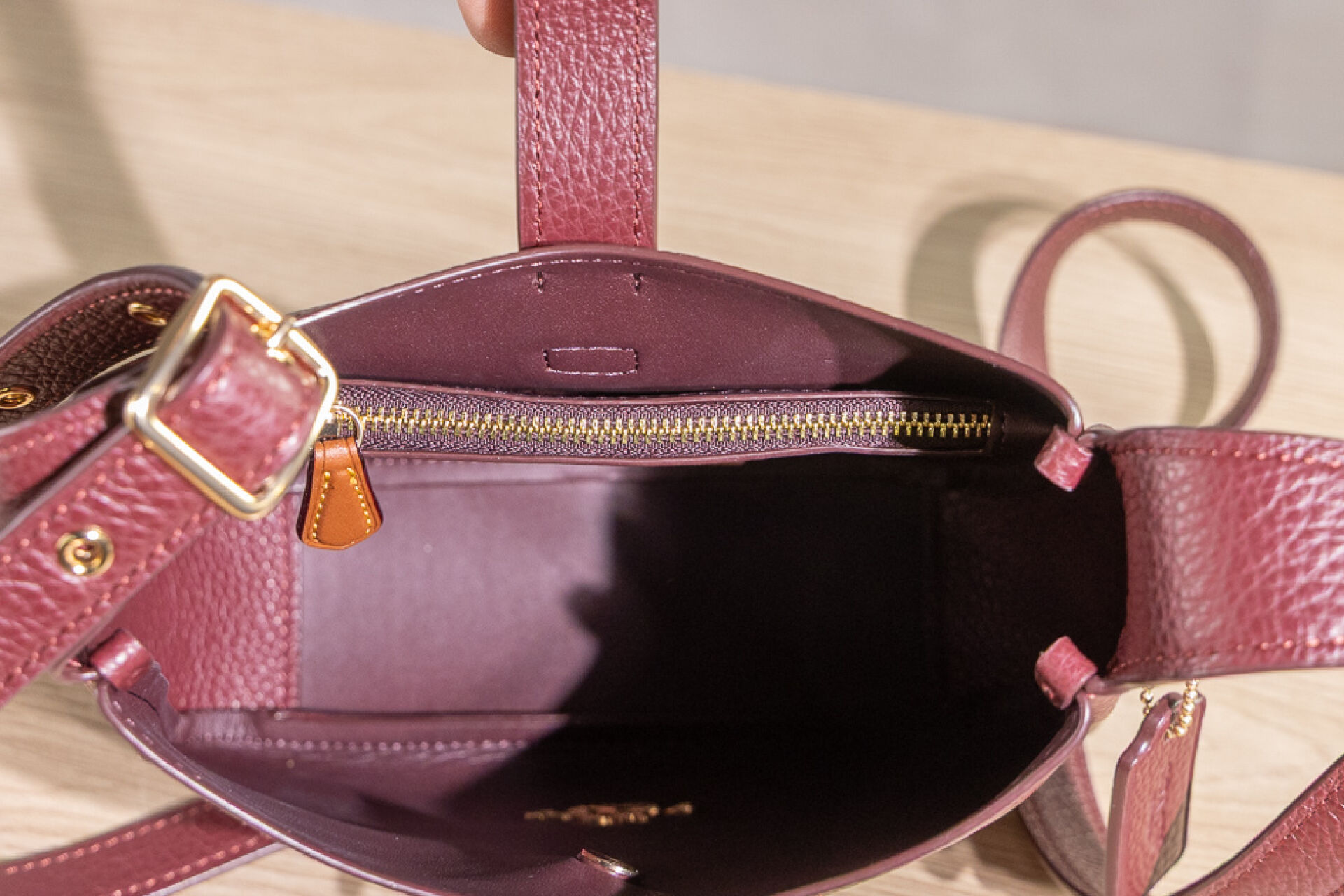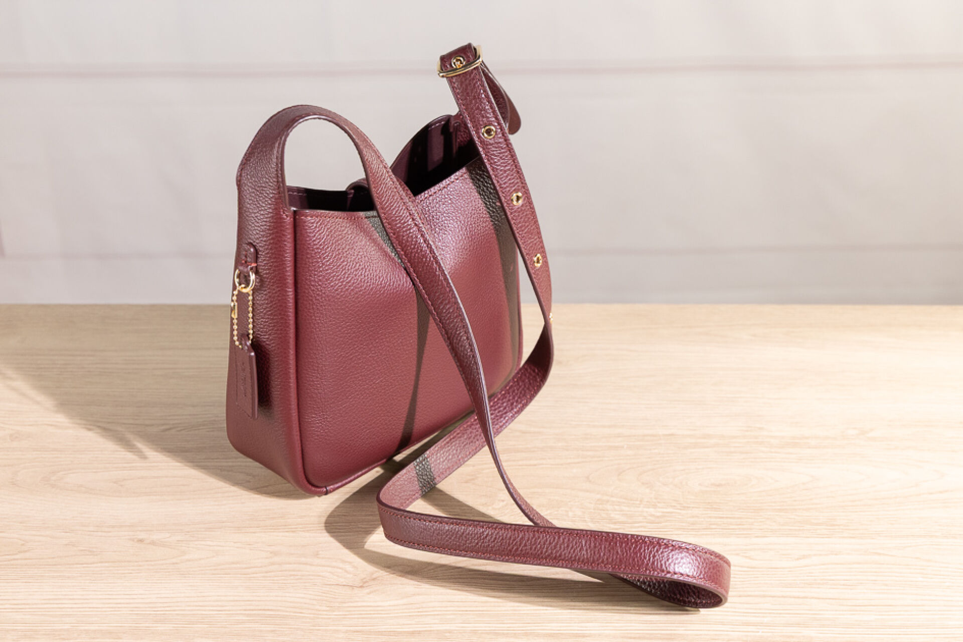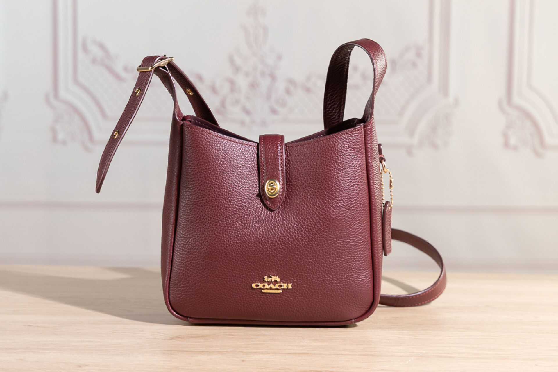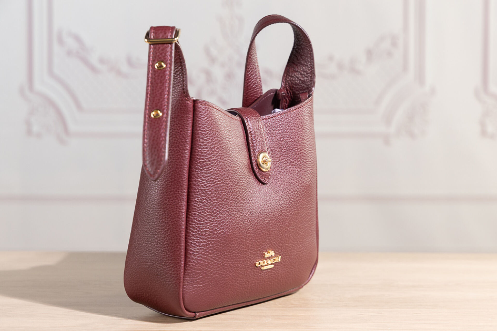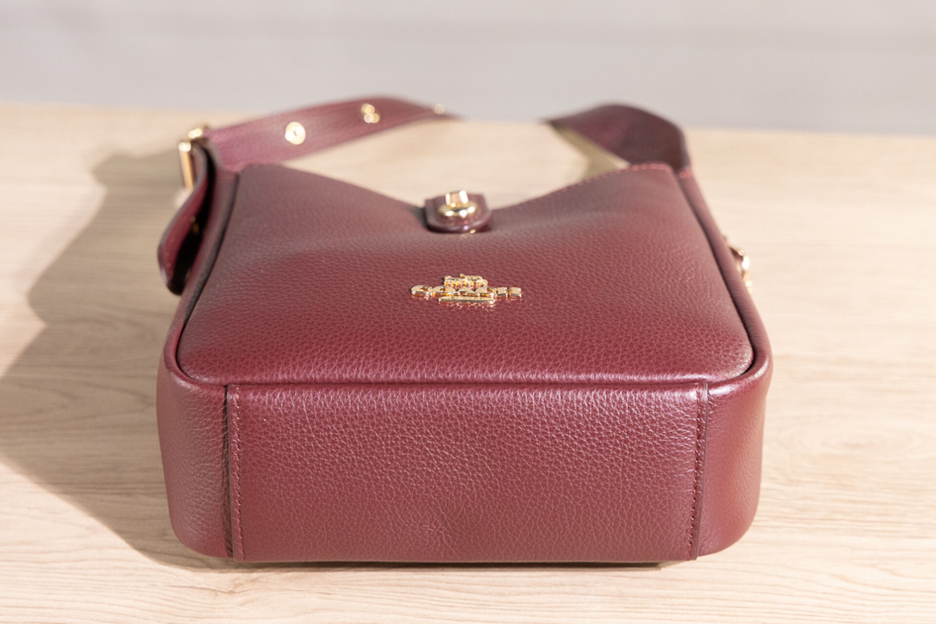 COACH - Petit sac en cuir grainé bordeaux, fermoir pivotant sur petite patte, anse bandoulière réglable. Haut. : 18 cm - Long. : 20 cm Non porté