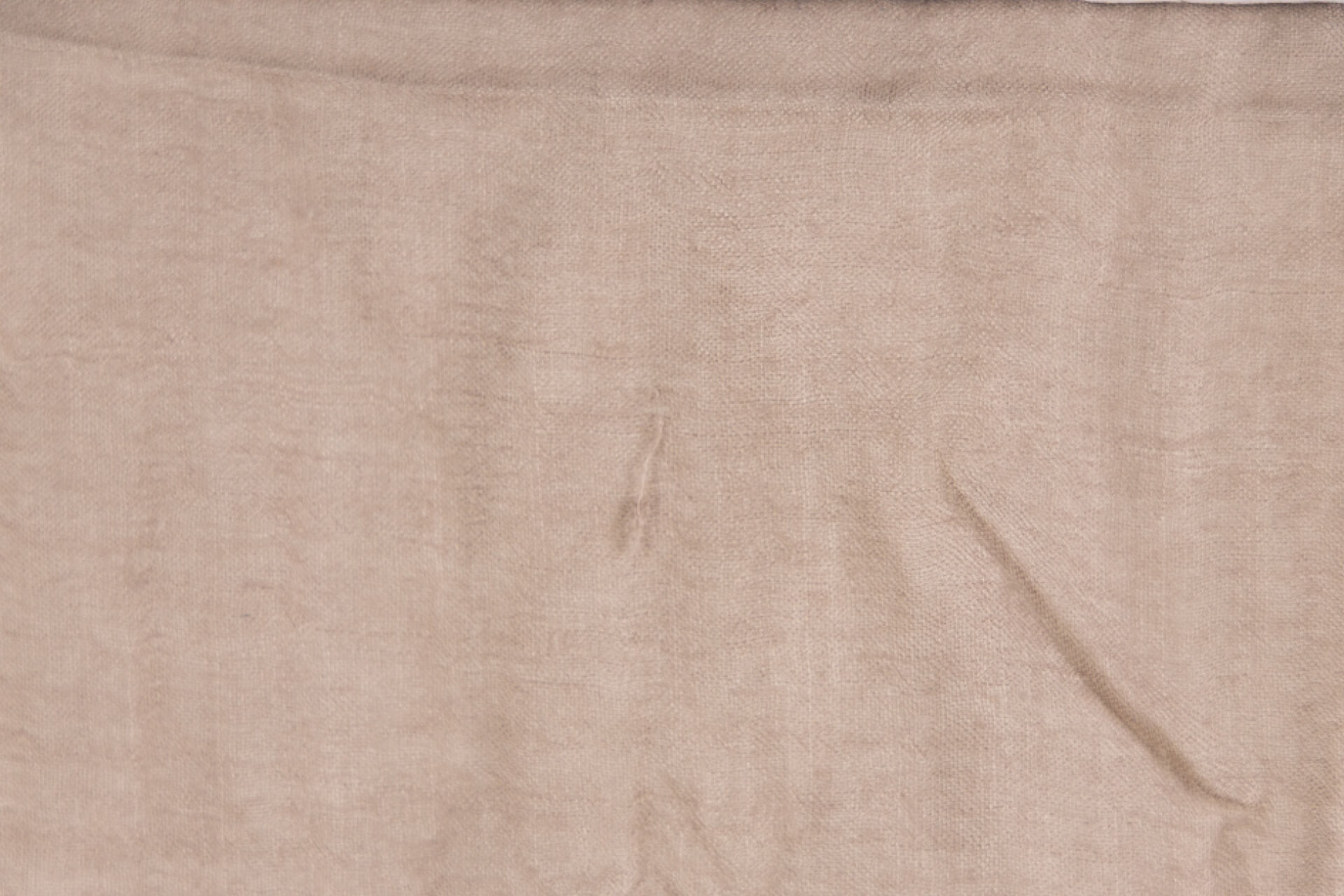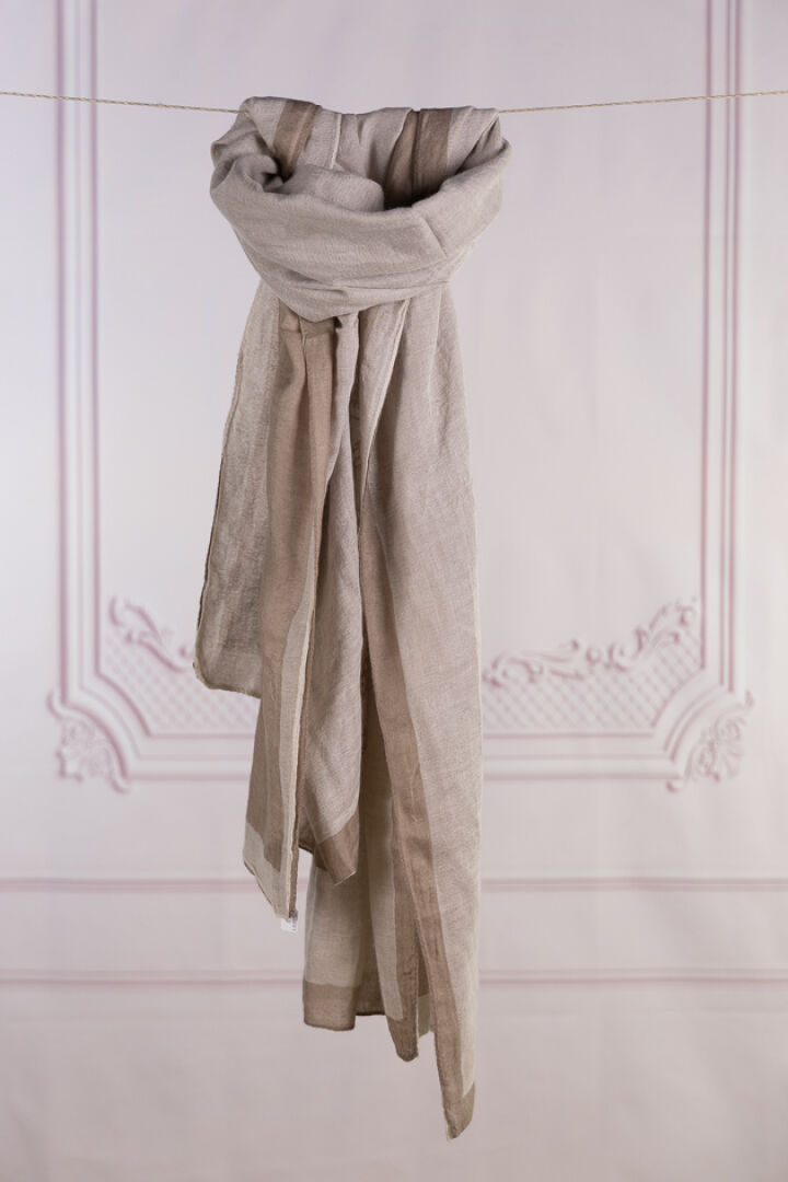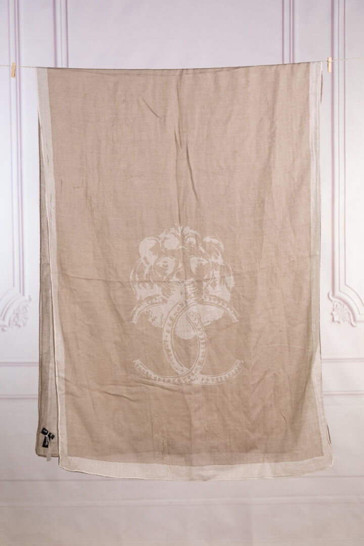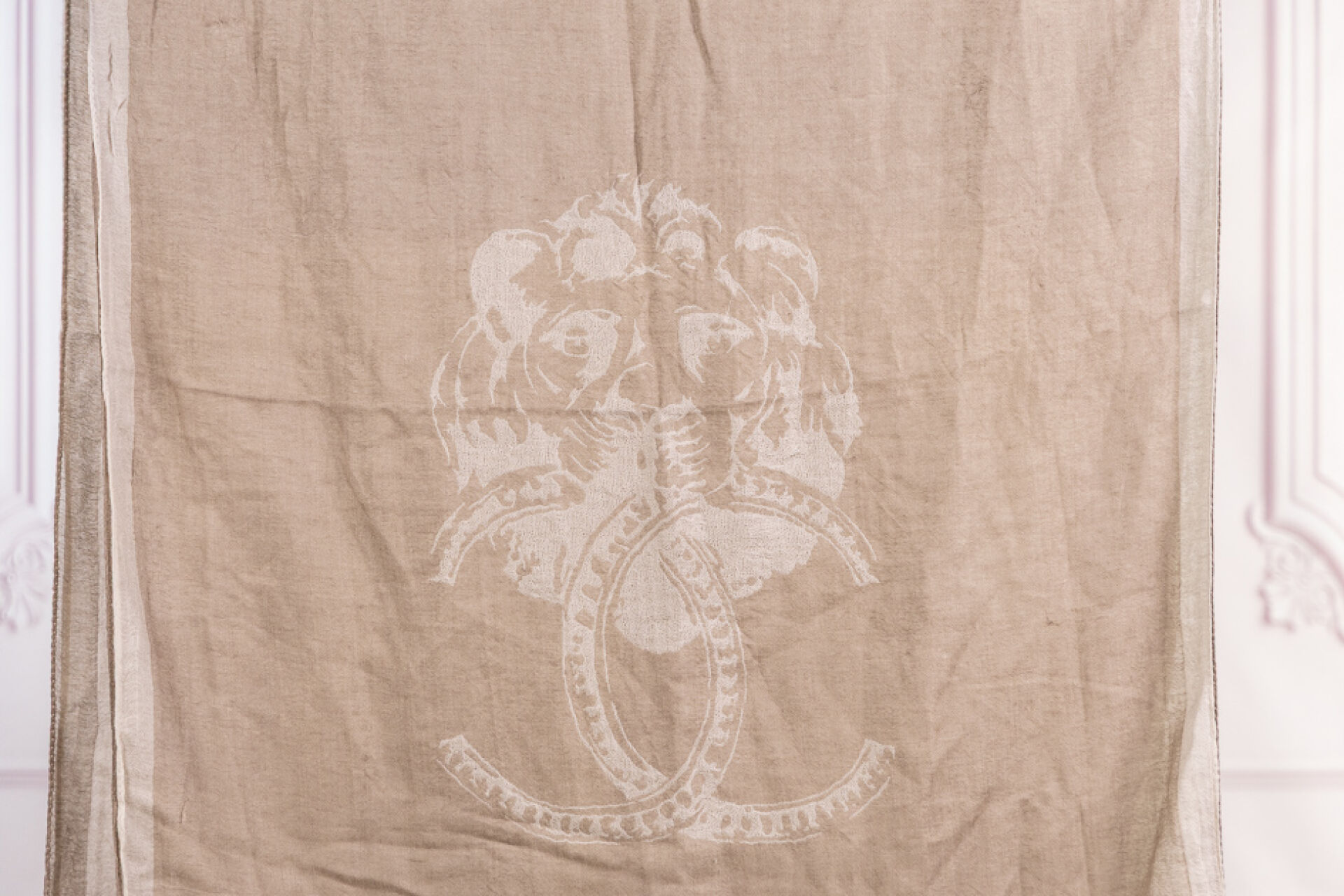 CHANEL - Écharpe en cachemire et soie bicolore en deux tonalités de beige, rehaussé du sigle à tête de lion. 69 x 180 cm environ Fils tirés