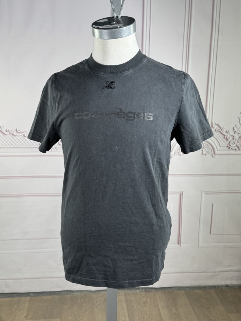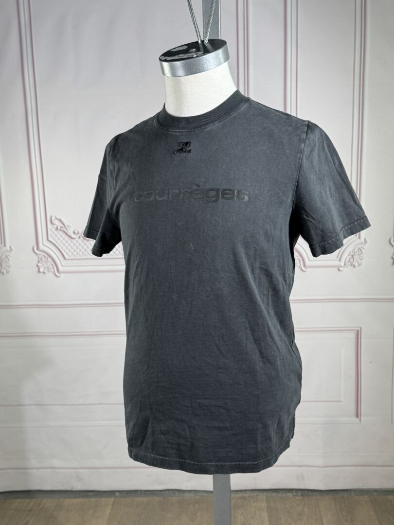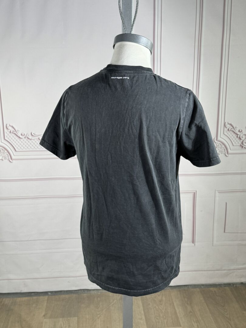COURREGES - T-shirt en coton gris imprimé du nom de la Maison, manches courtes, encolure ronde. Taille indiquée S Déjà porté, usures