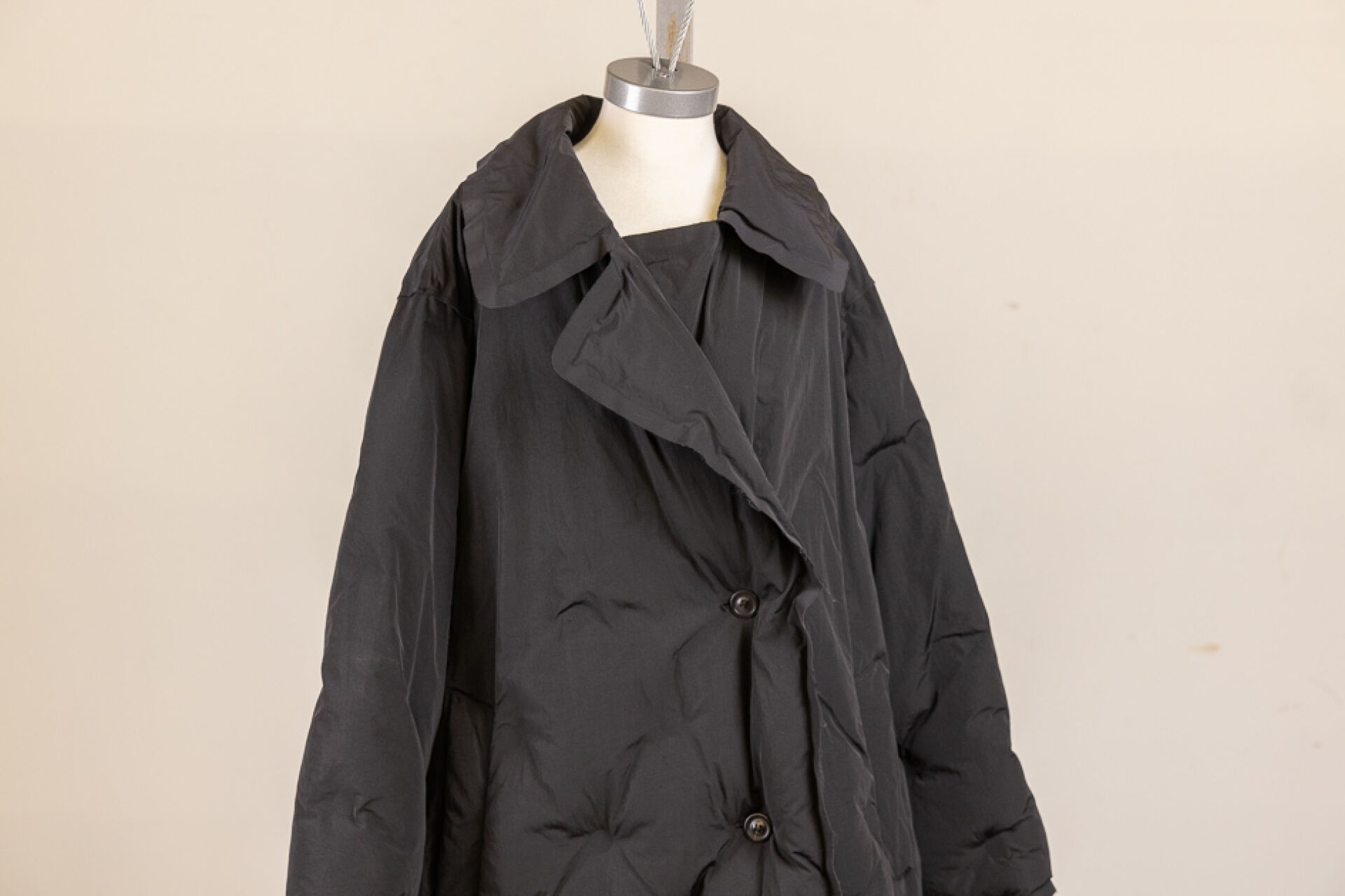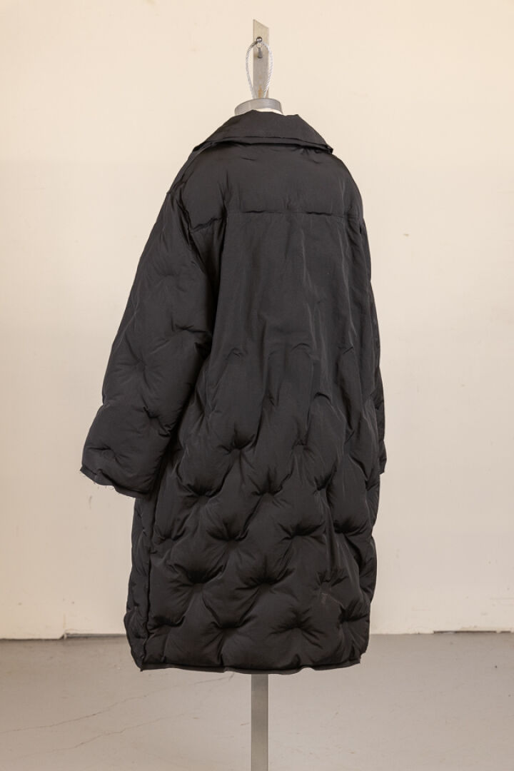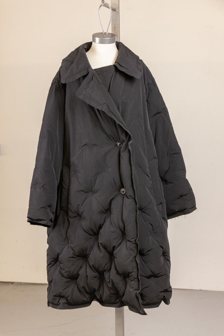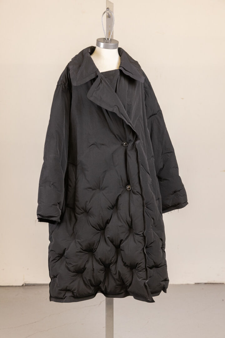 MARTIN MARGIELA Ligne 10 - Ample manteau façon doudoune noire capitonnée, large col cranté, simple boutonnage, manches longues, deux poches verticales. Taille indiquée 44 (taillant 40) Manque un bouton, quelques salissures
