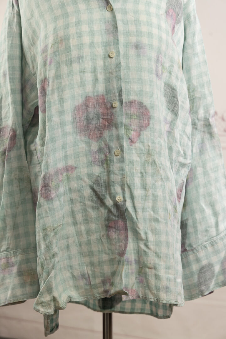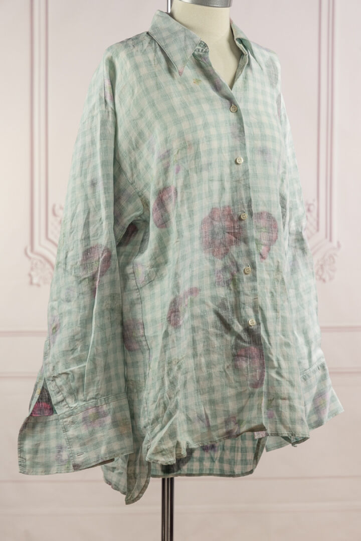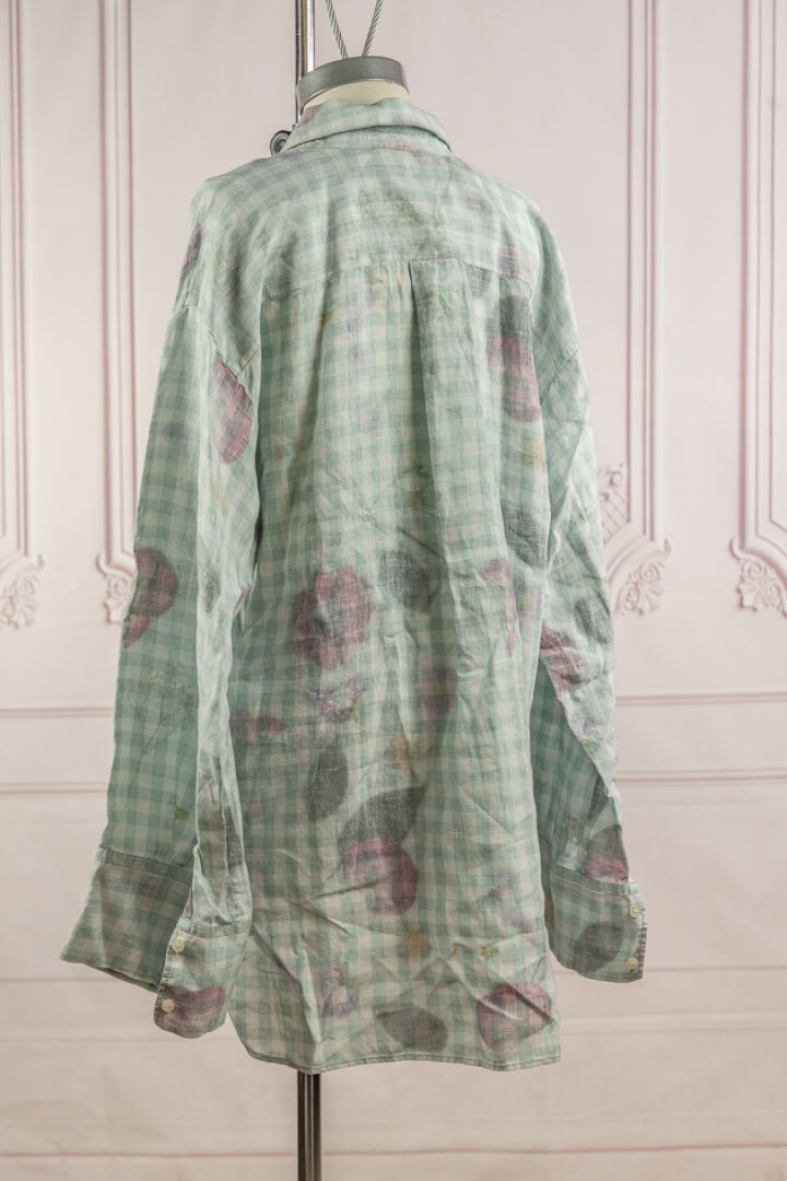 ACNE - Chemise tunique en lin à carreaux vichy vert imprimé de fleurs dessinées à dominante rouge effet inversé, col italien, simple boutonnage, manches longues. Taille 36