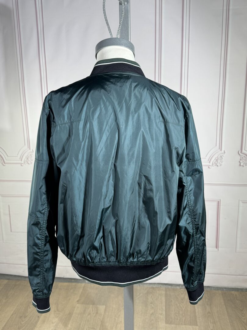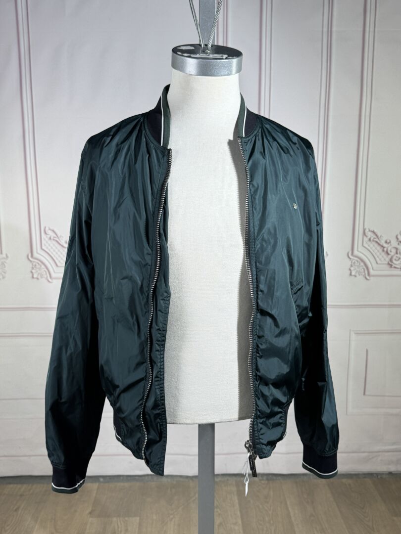 DIOR - Blouson homme vert métallisé, fermeture à glissière, manches longues, deux poches en biais pressionnées, poche zippée sur le bras gauche. Taille supposée 38 Déjà porté, petites tâches