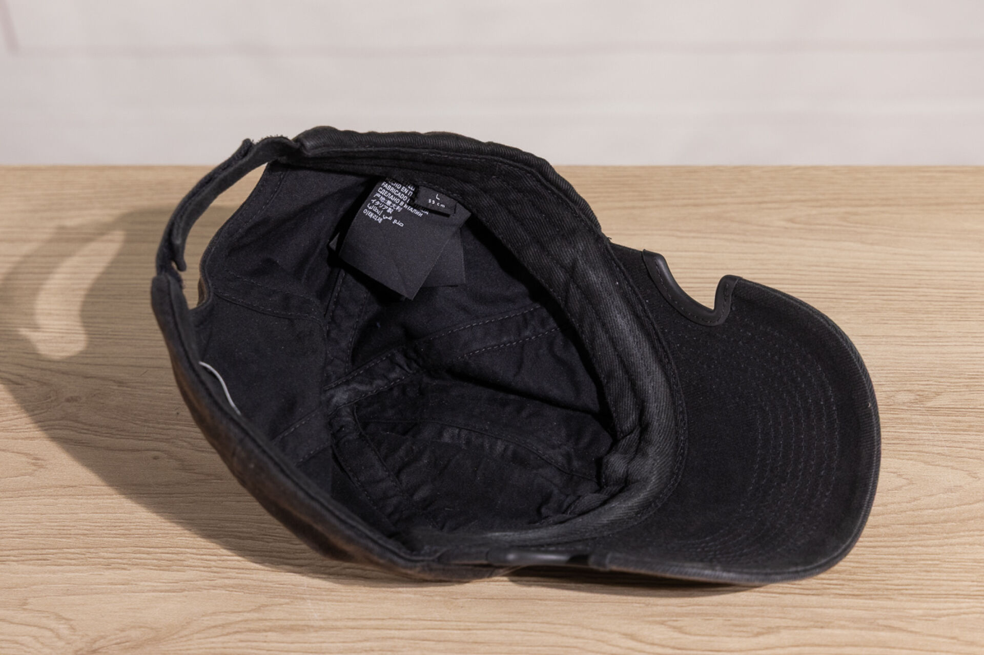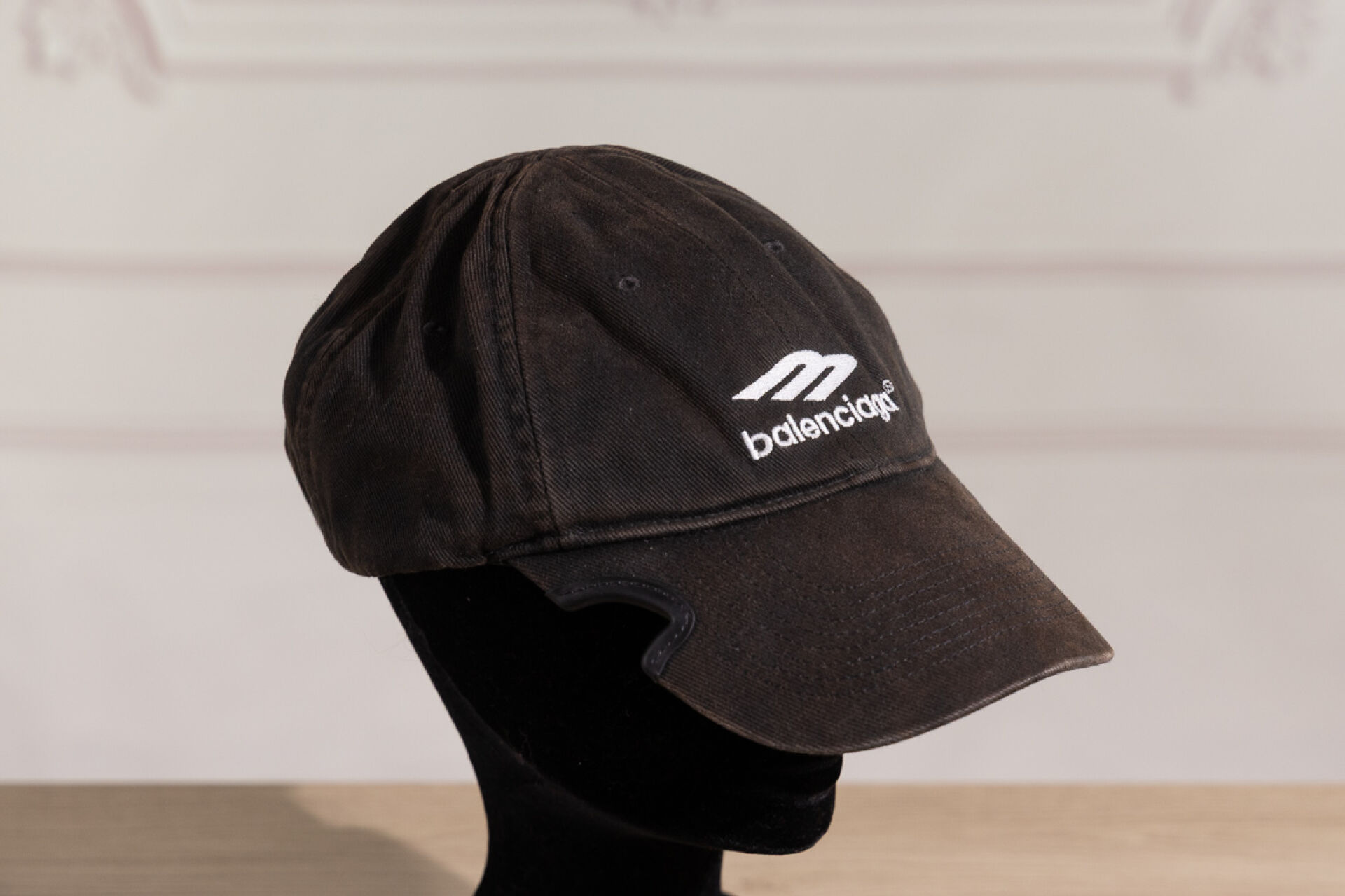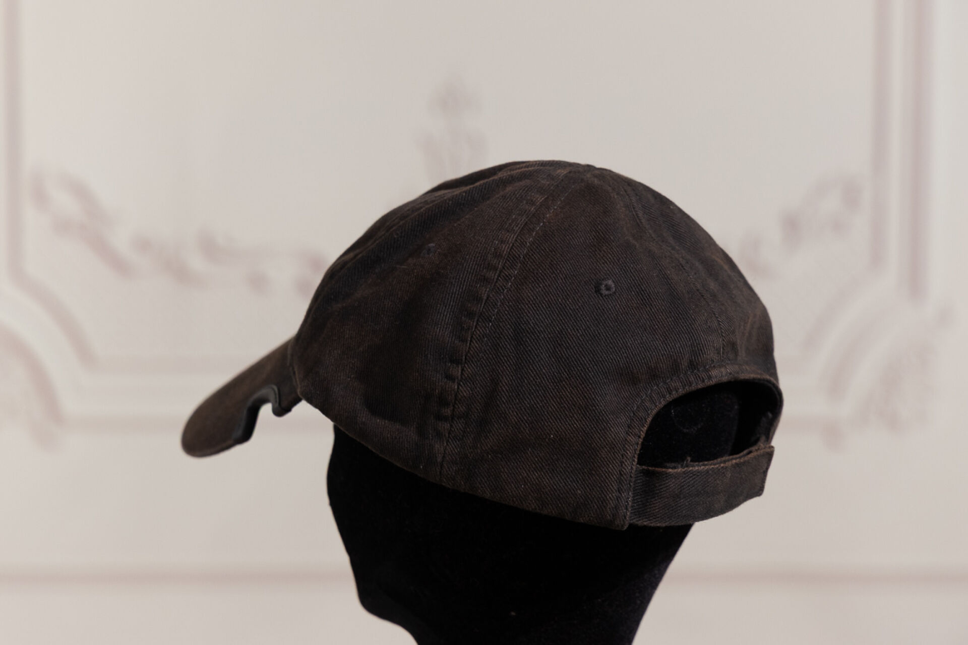 BALENCIAGA - Casquette en coton noir, siglée, visière à découpe. Tour de tête L - 59 cm Déjà portée, usures et salissures