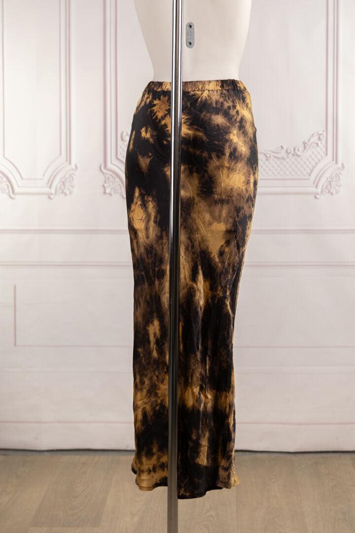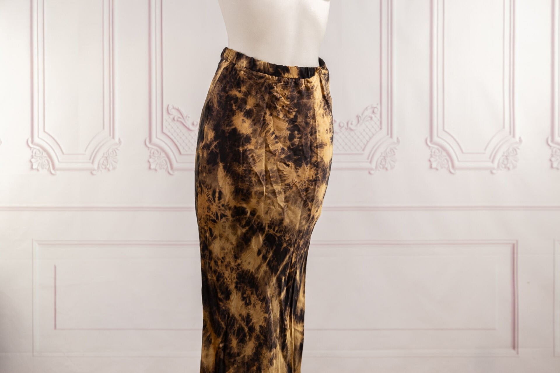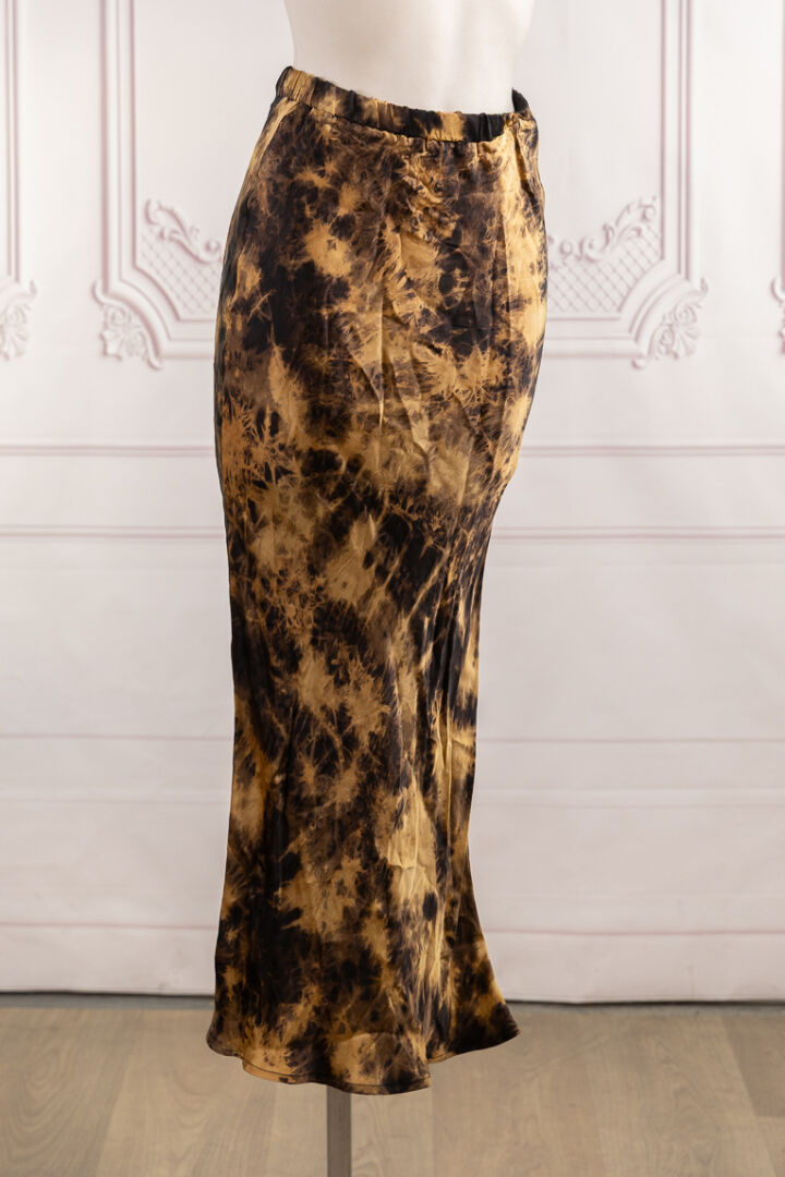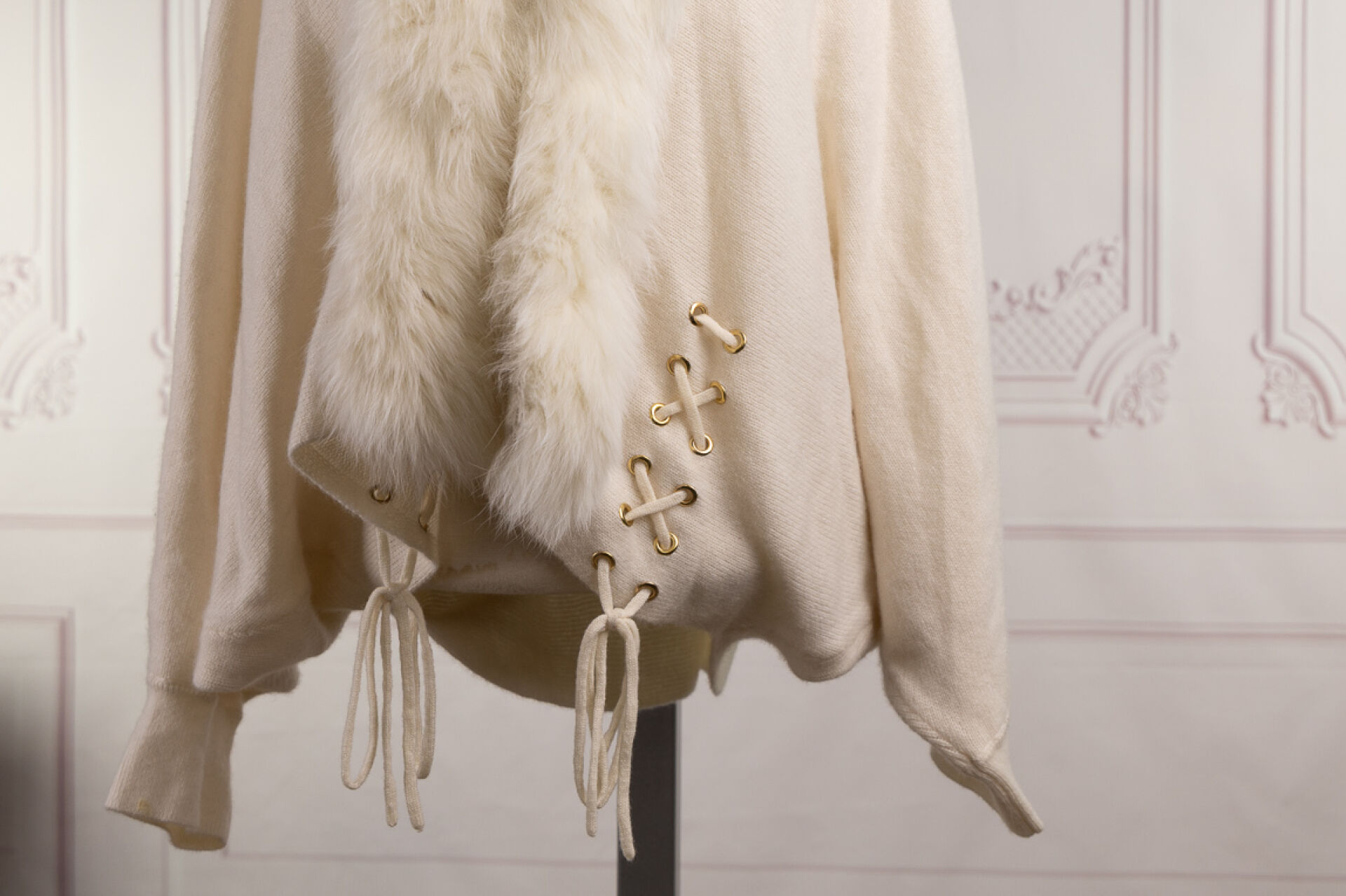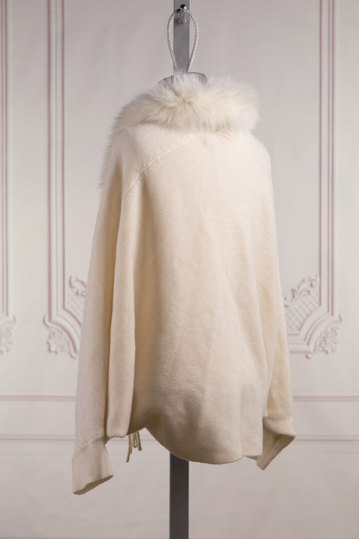 DOREE CACHEMIRE - Gilet en cachemire ivoire, encolure gansée de renard amovible, manches longues à emmanchures très basses, lacé dans le bas de chaque coté. Nous joignons une jupe MES DEMOISELLES marbré camel/noir.