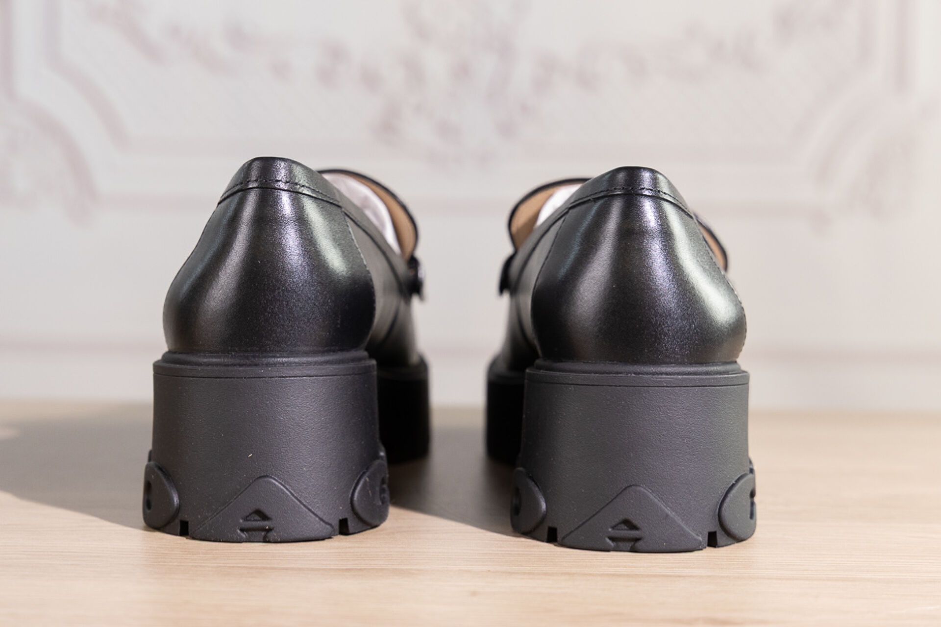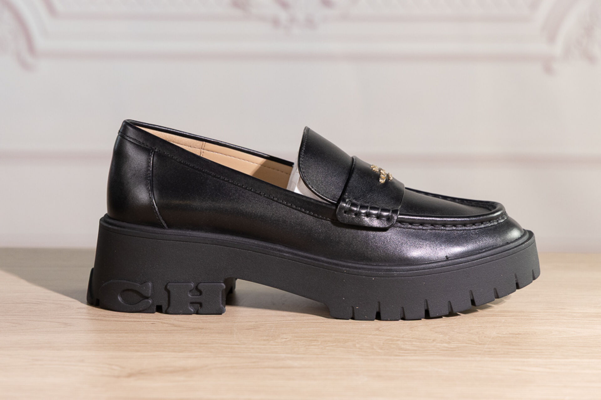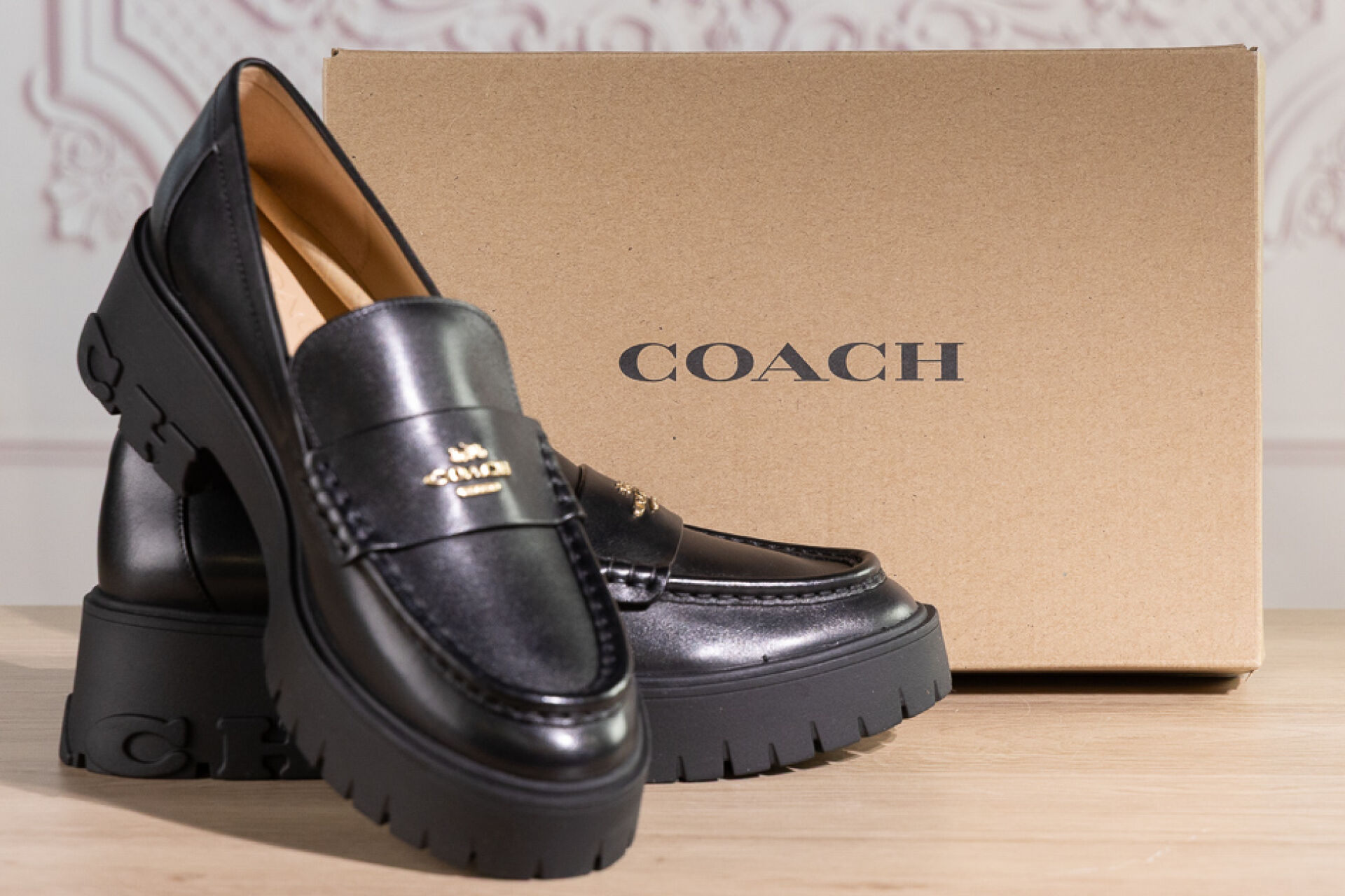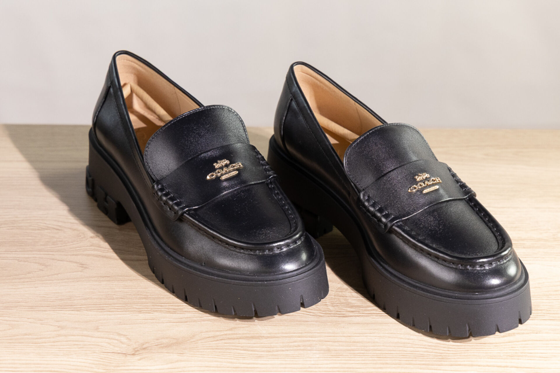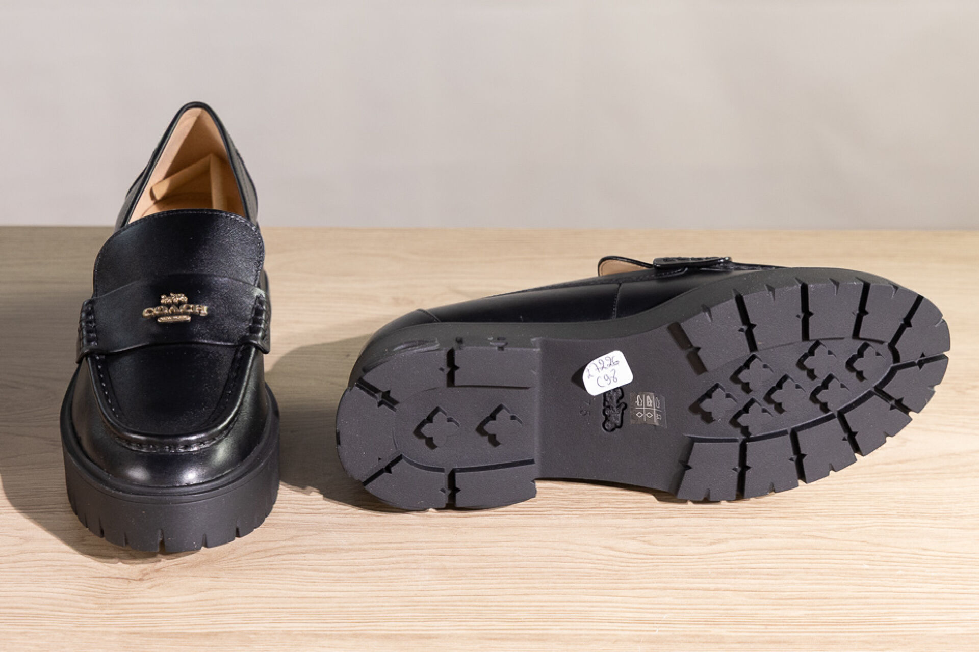 COACH - Paire de mocassins en cuir noir sur importante semelle gomme crantée et talon. Pointure indiquée 7,5 (soit 38 français) - Haut du talon : 5 cm Non portés, boite
