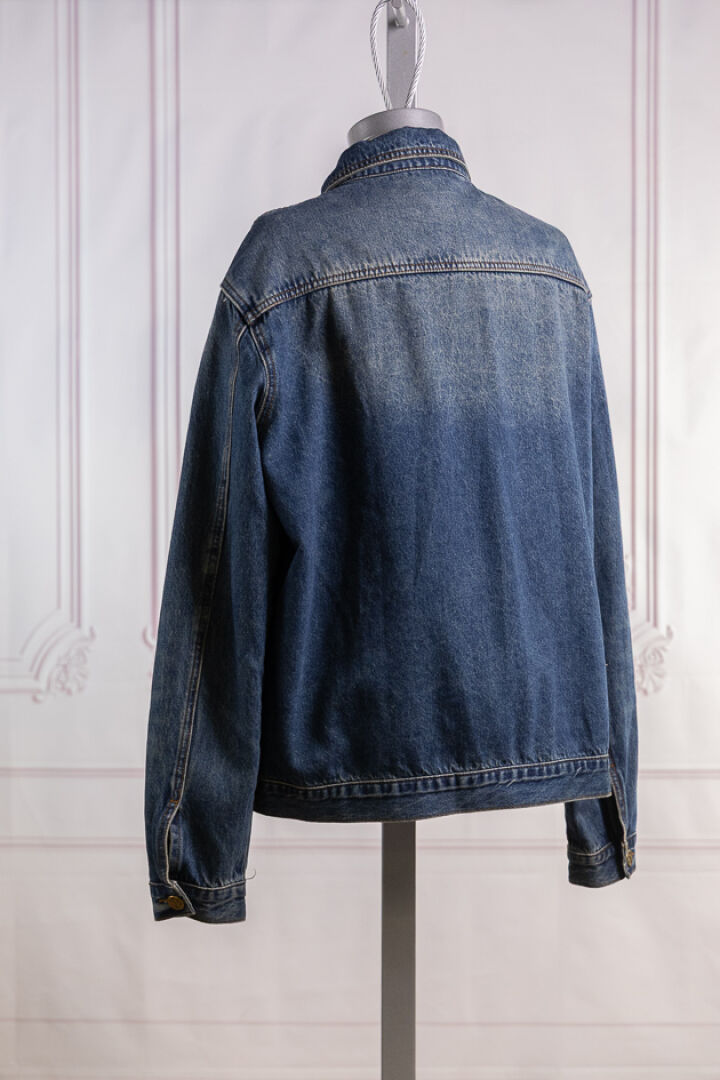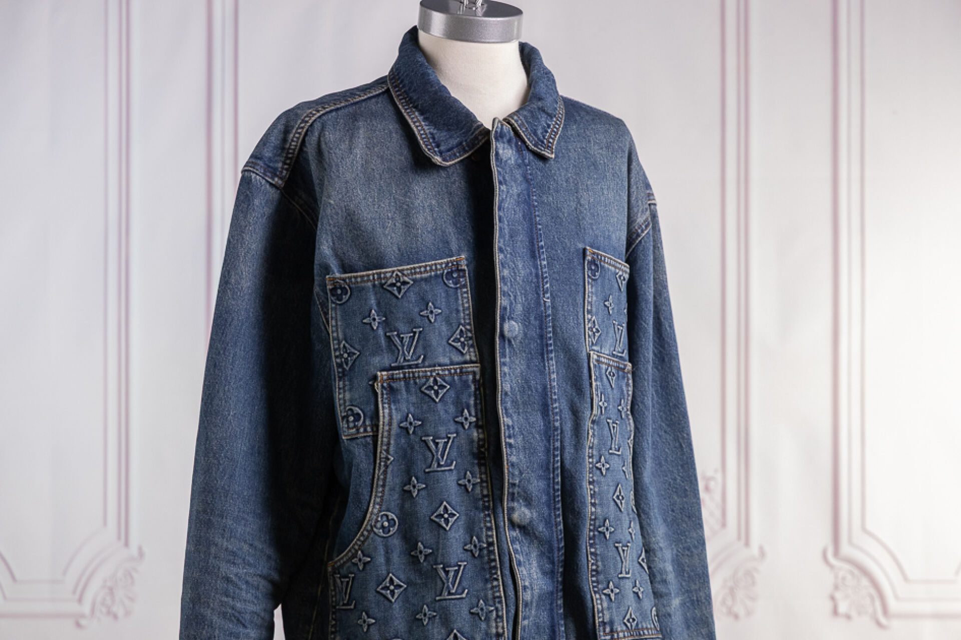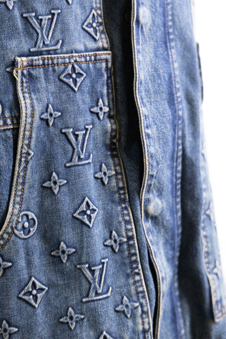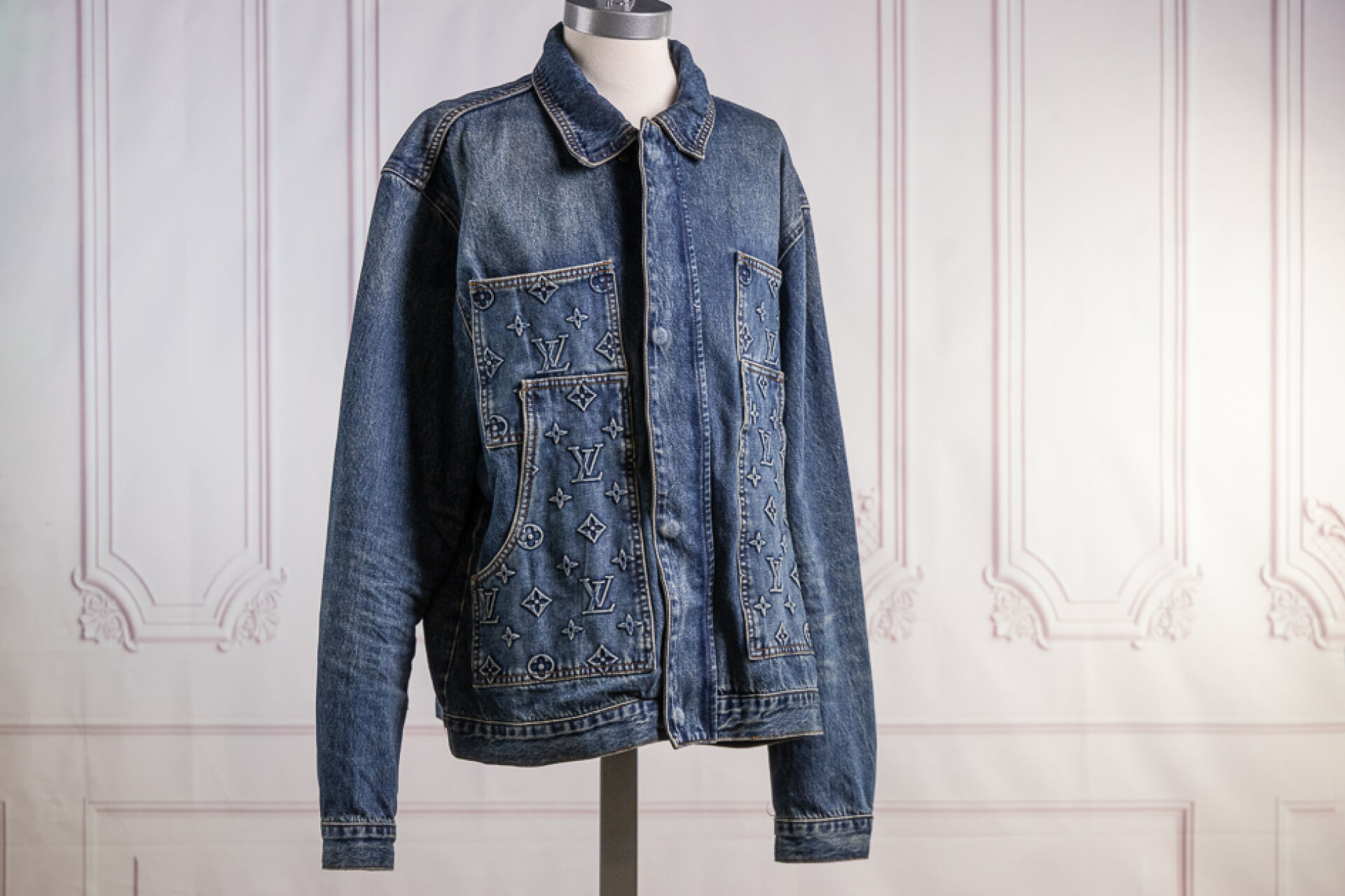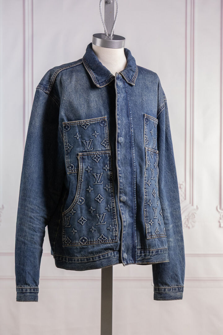 LOUIS VUITTON - Blouson homme en jean brut effet vieilli, col, fermeture à glissière sous patte aimantée, quatre poches plaquées découpées embossées au Monogram, manches longues. Taille supposée 48 Déjà porté, à nettoyer, sans griffe