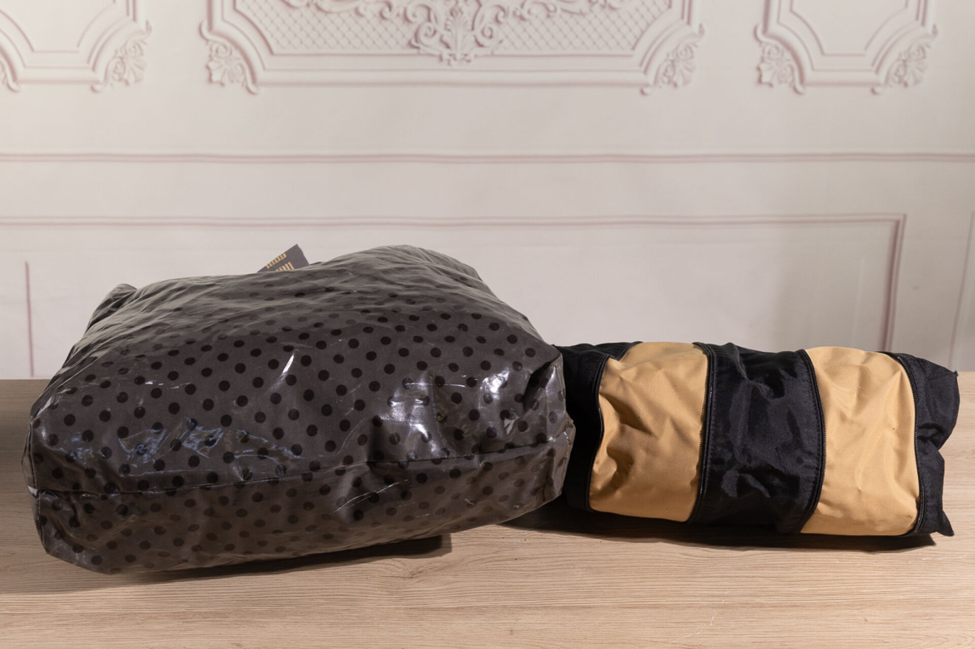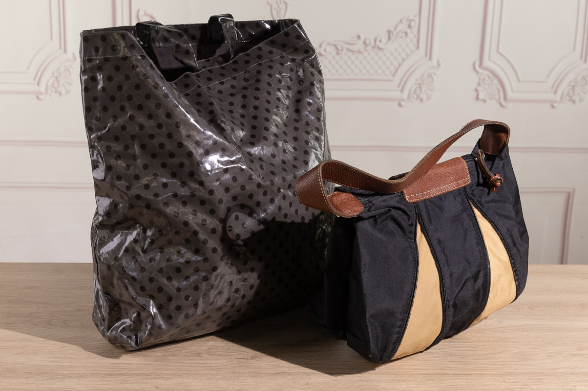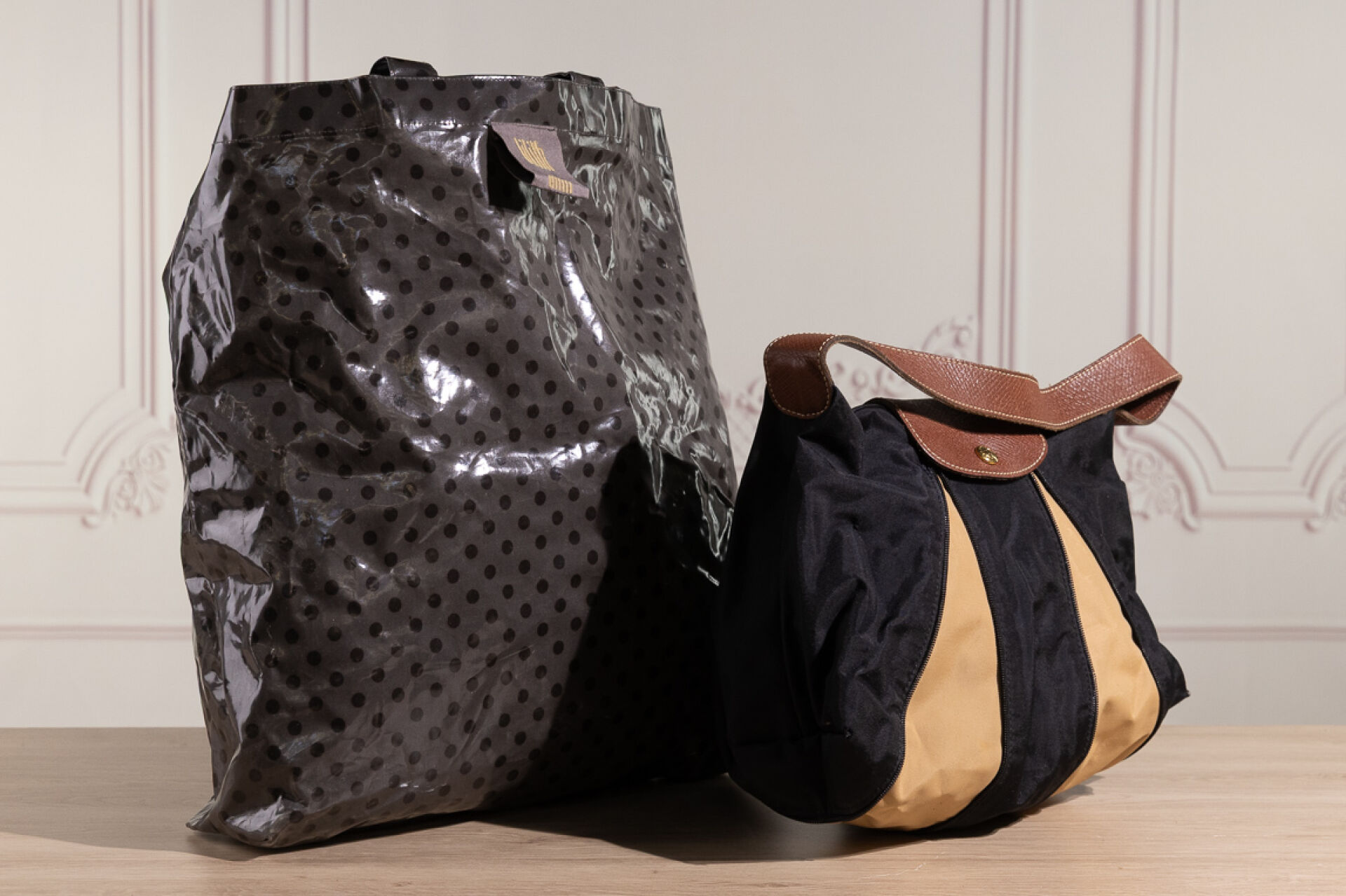 LONGCHAMP - Petit sac Pliage en toile noire à deux zips s'ouvrant sur toile beige, fermoir pression sous rabat cuir sur fermeture à glissière, double poignée. Haut. : 20 cm - Long. : 24 cm environ Nous joignons un tote bag en plastique gris à pois LILITH.