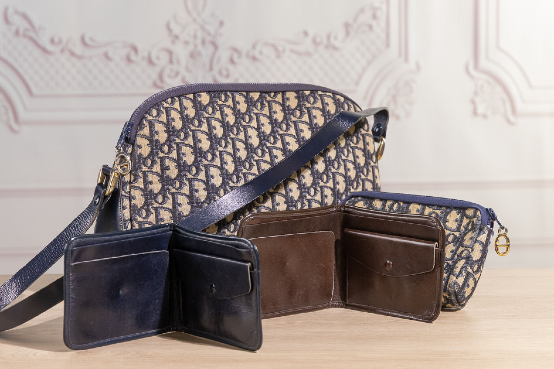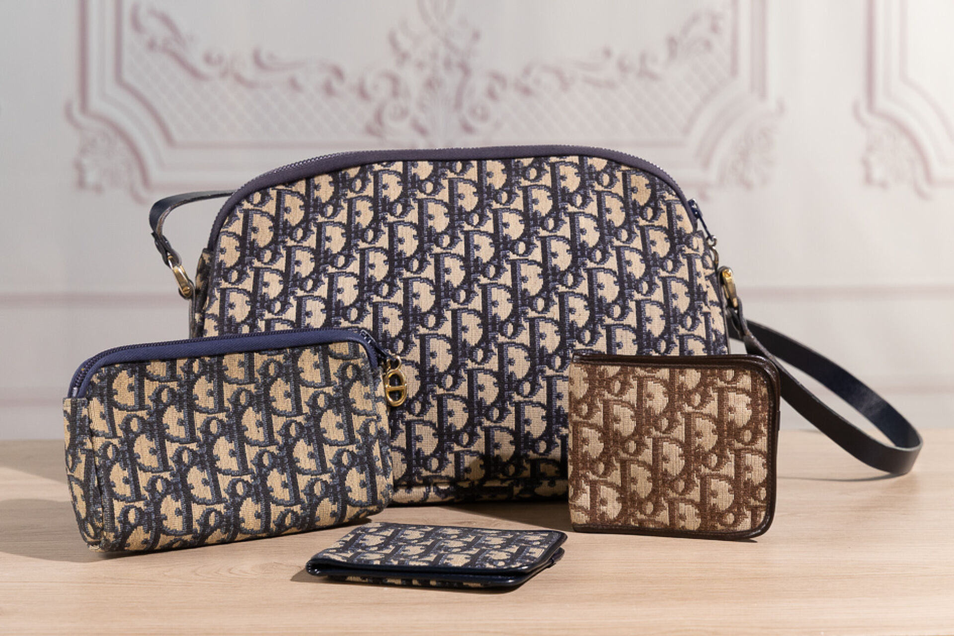 CHRISTIAN DIOR Vintage - Sac en toile jacquard oblique bleu-beige et cuir marine, fermeture Eclair, anse. Haut. : 20 cm - Long. : 32 cm Quelques traces, pliures d'usage, bel état général Nous joignons une trousse zippée coordonnée ainsi que deux portes carte pliable, l'un marron-beige l'autre bleu-beige. Quelques salissure et marques d'usage