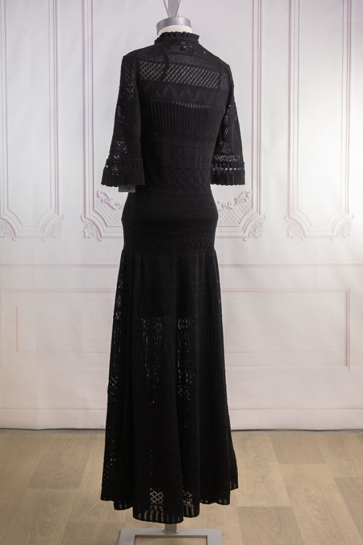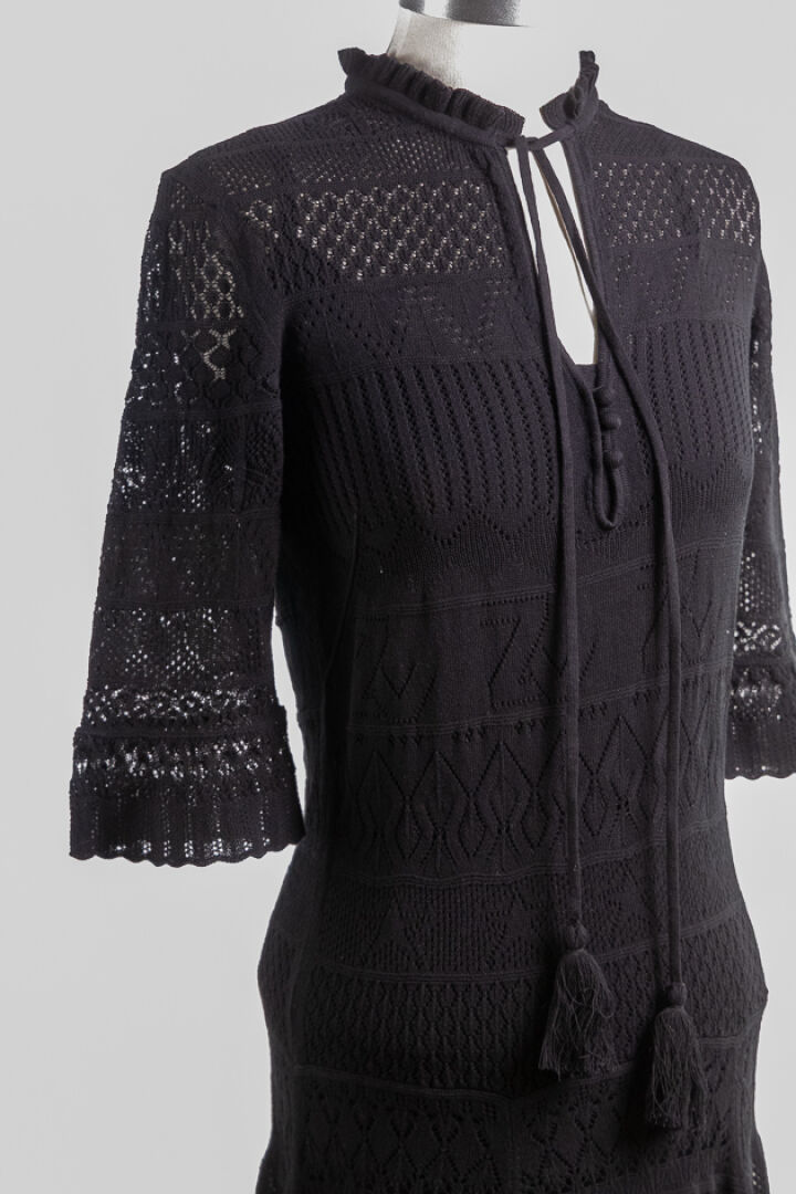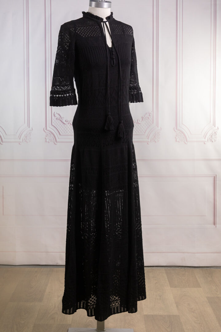 ZADIG & VOLTAIRE - Robe longue "Memphis" en coton noir ajouré, encolure nouée sur décolleté boutonné, manches courtes, avec son fond. Taille indiquée M Non porté, étiquette d'origine