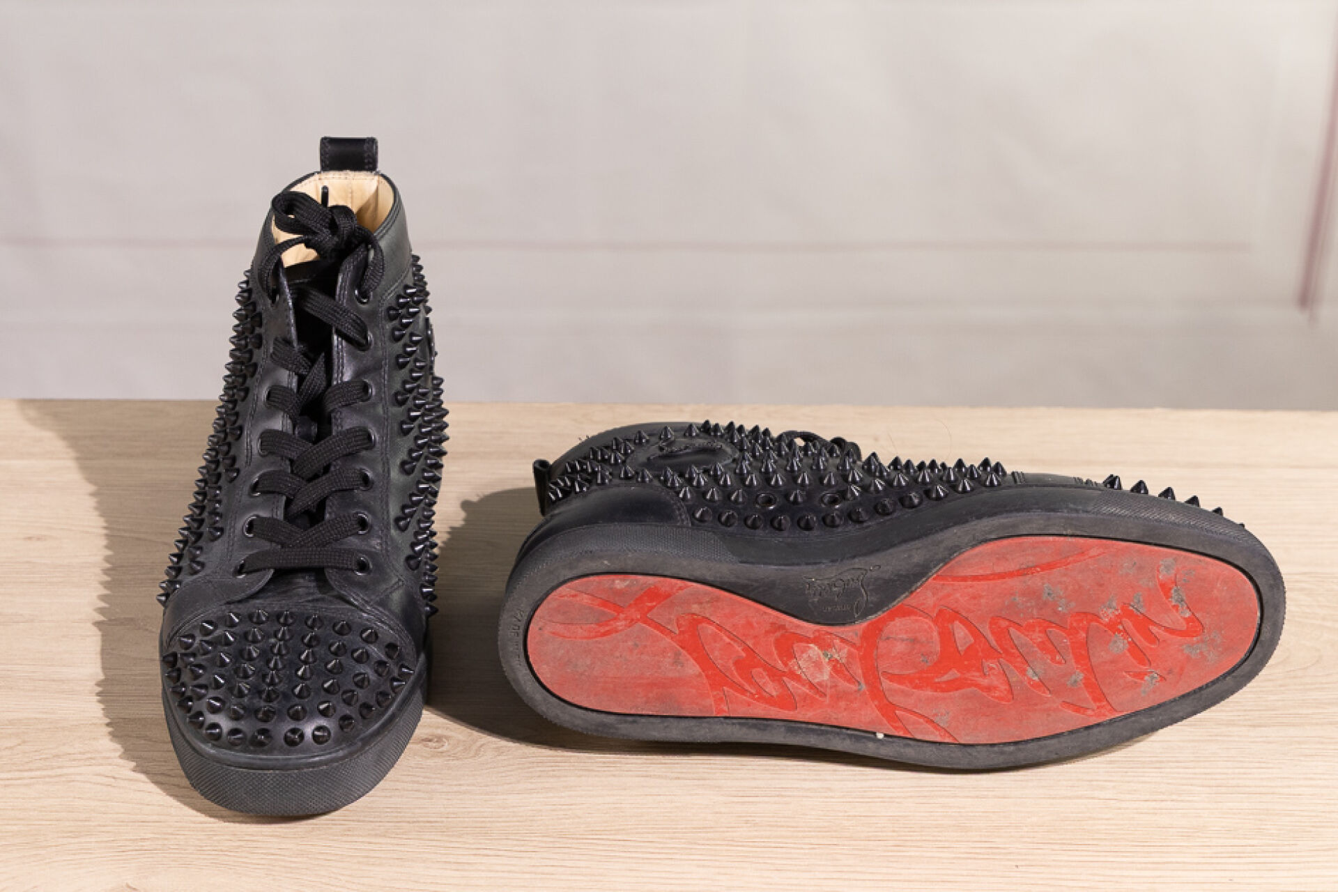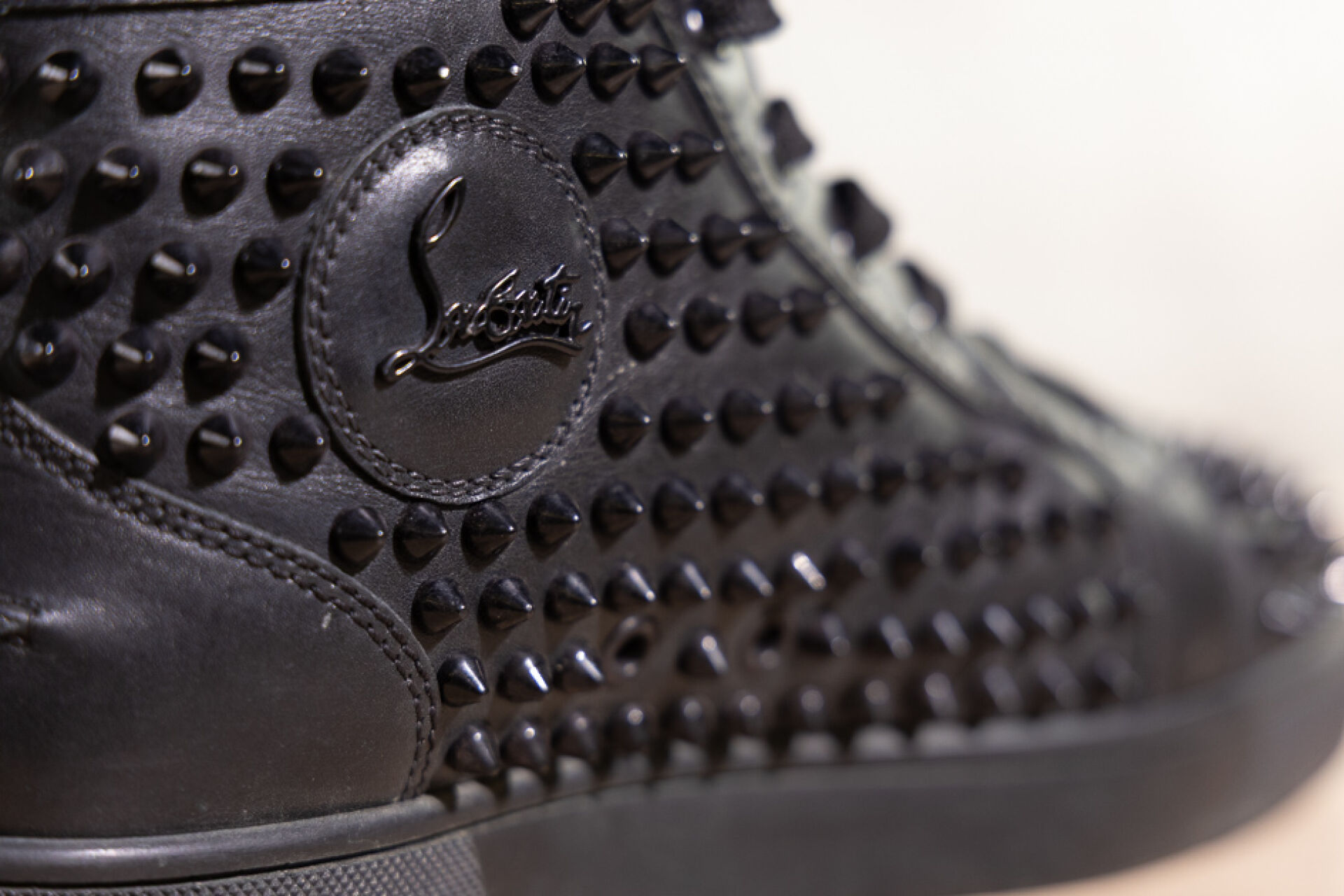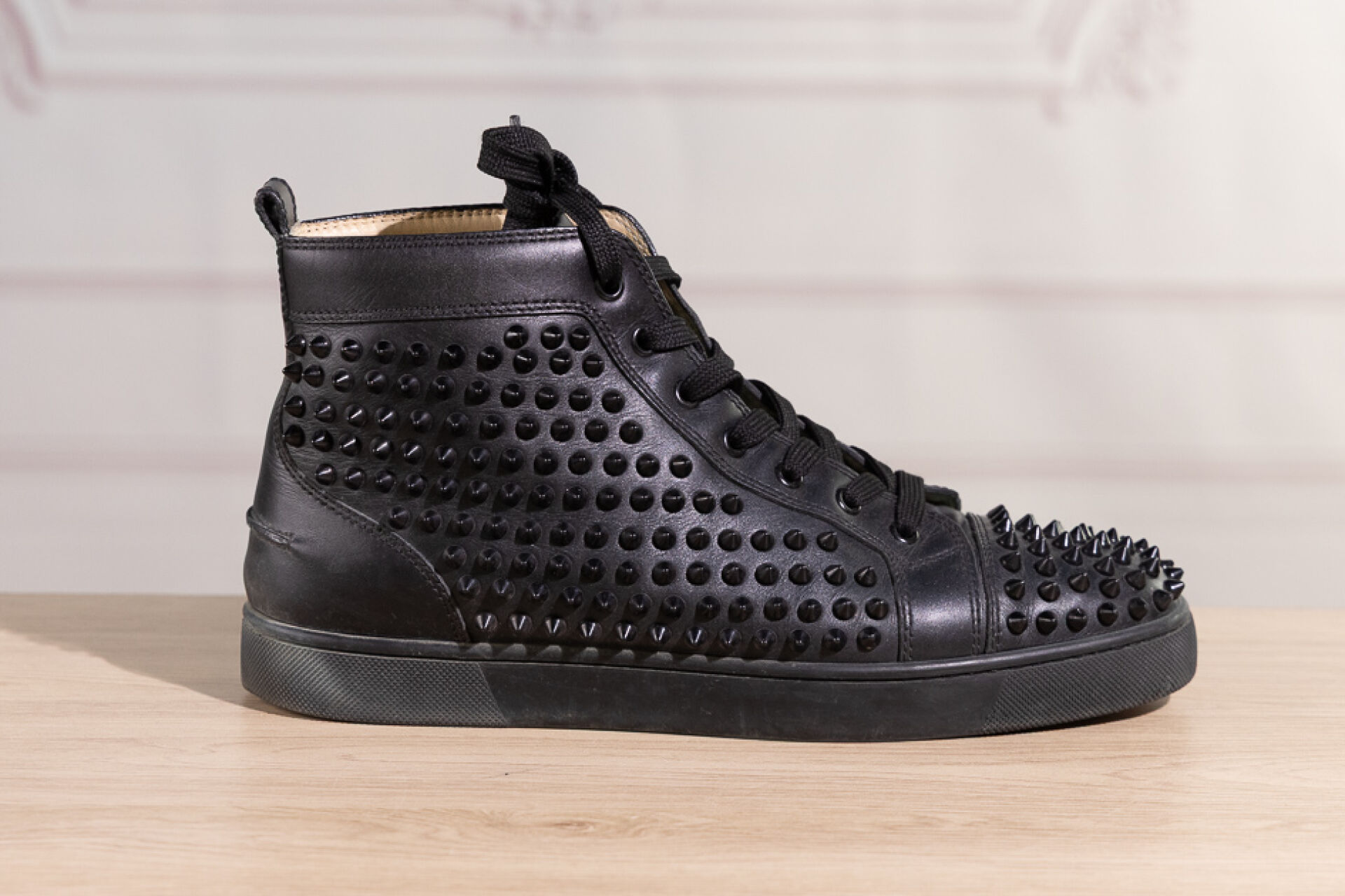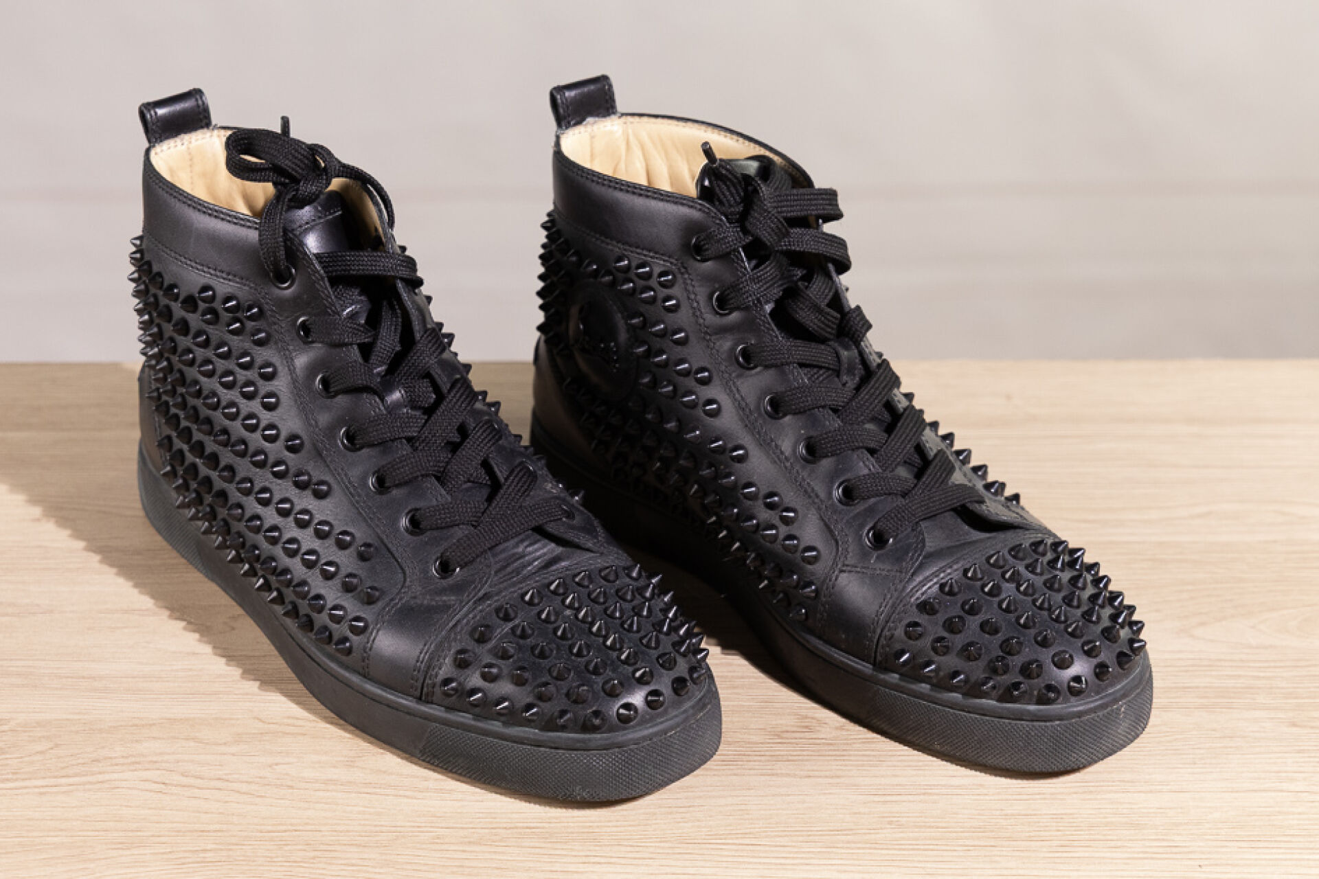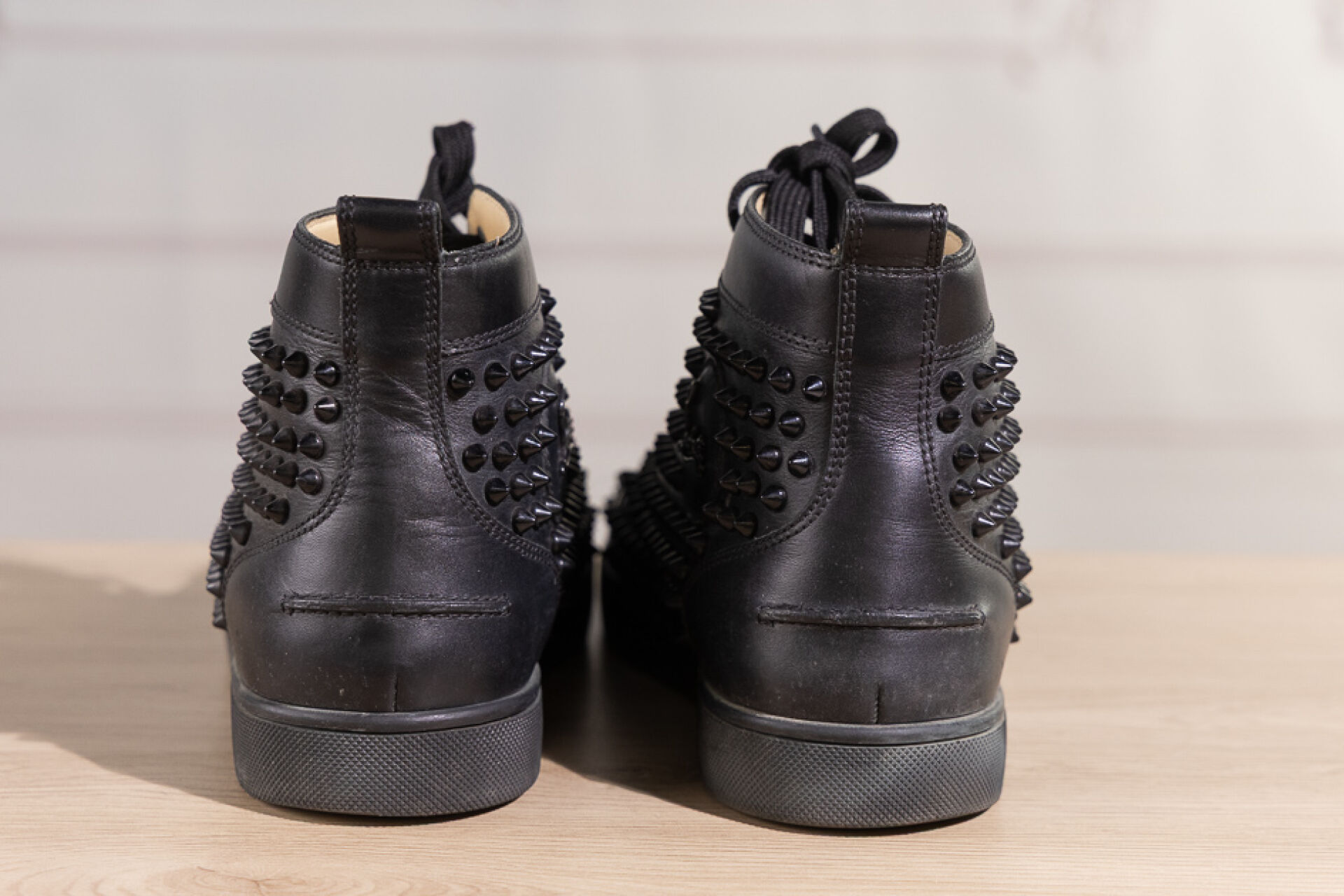 CHRISTIAN LOUBOUTIN - Paire de sneakers montantes homme "Louis Orlato" en cuir noir rehaussé de clous à la couleur, lacets. Pointure 41 Déjà portés, marques d'usage