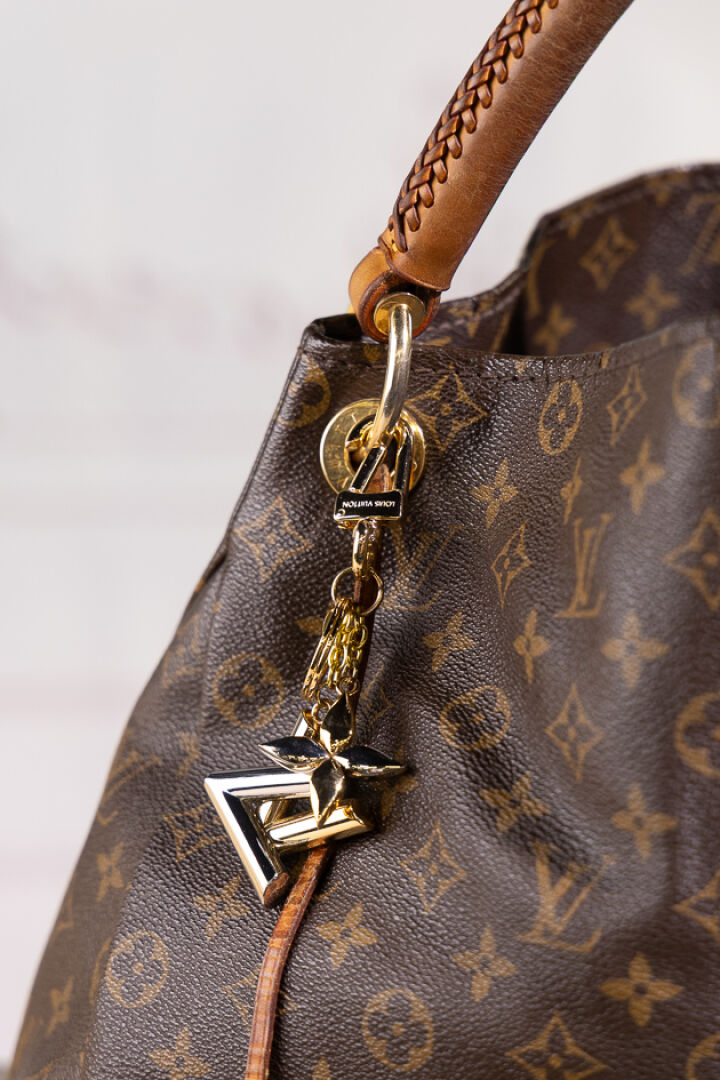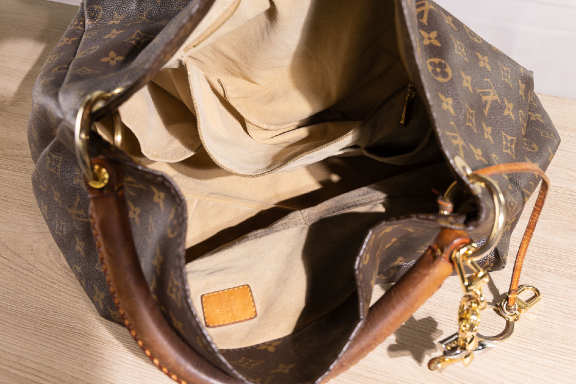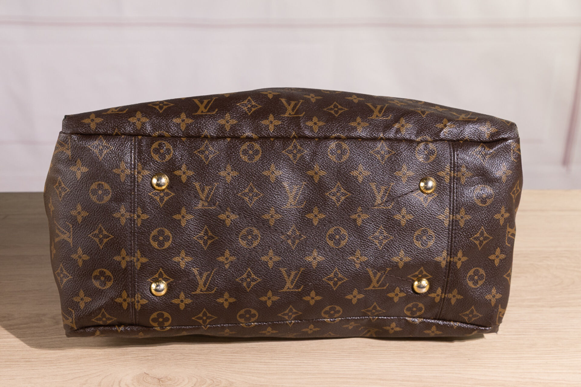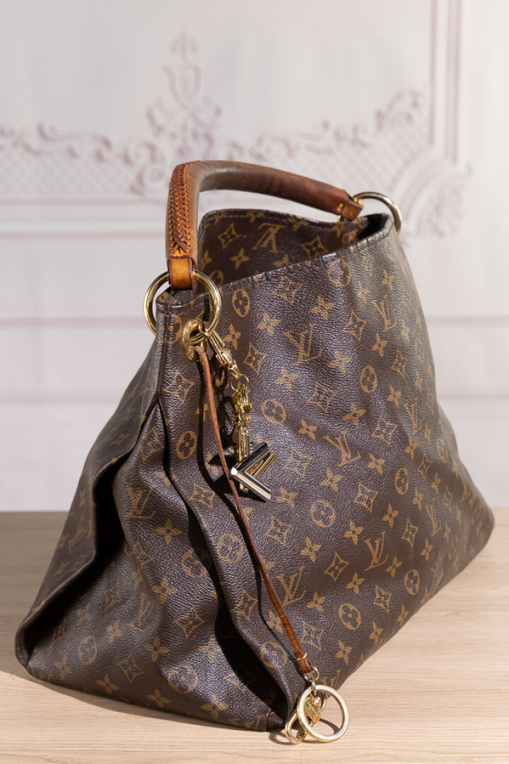 LOUIS VUITTON - Sac "Artsy" grand modèle en toile Monoogram et cuir naturel plissé de chaque côté sous la tâche anneau en métal doré de la anse tressée, doublure en suédine sable. Dustbag. Tampon Louis Vuitton Paris Made in Spain Haut. : 30 cm - Long. : 40 cm Patine, salissures, coins percés et fentes sur la toile sur le pourtour du haut