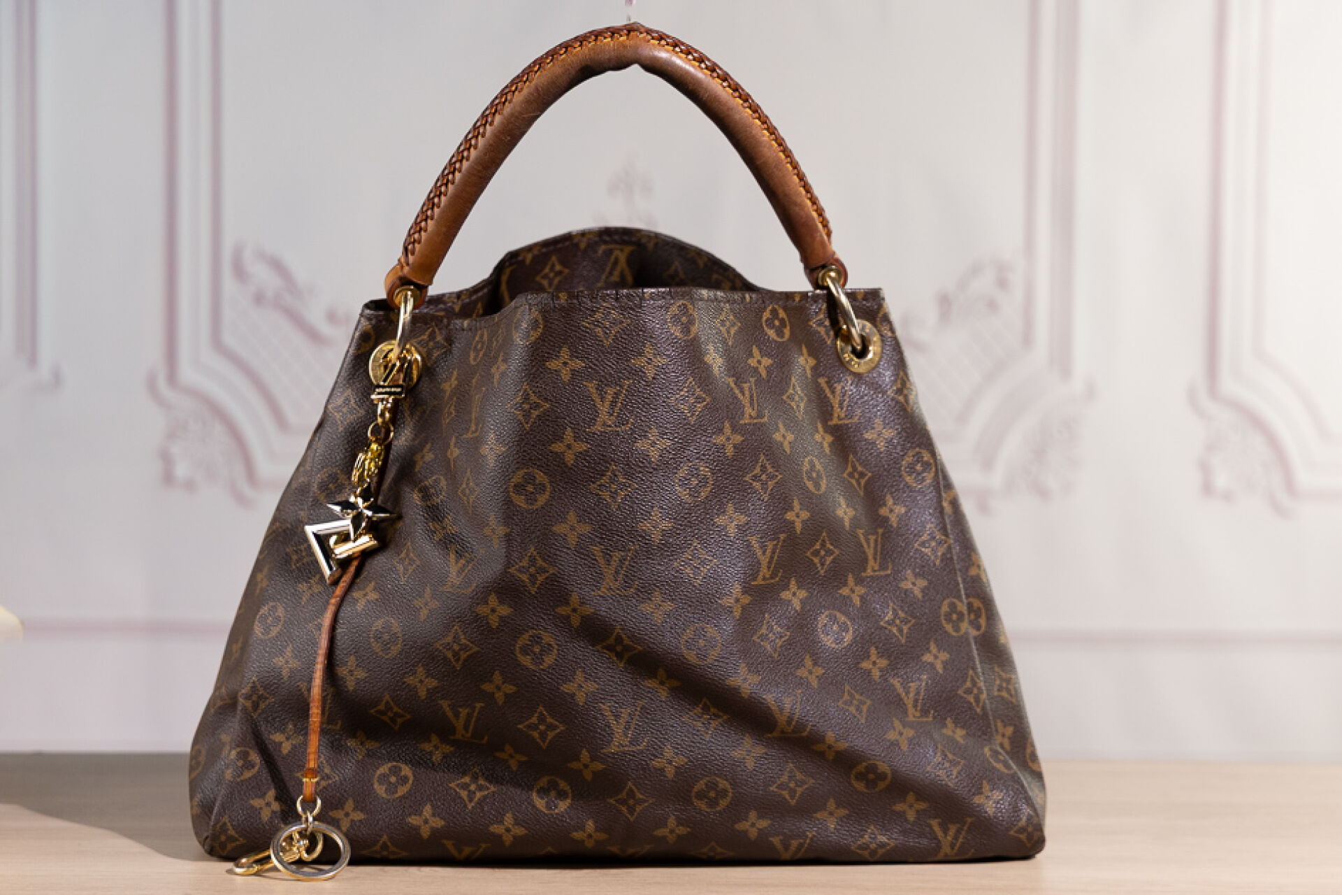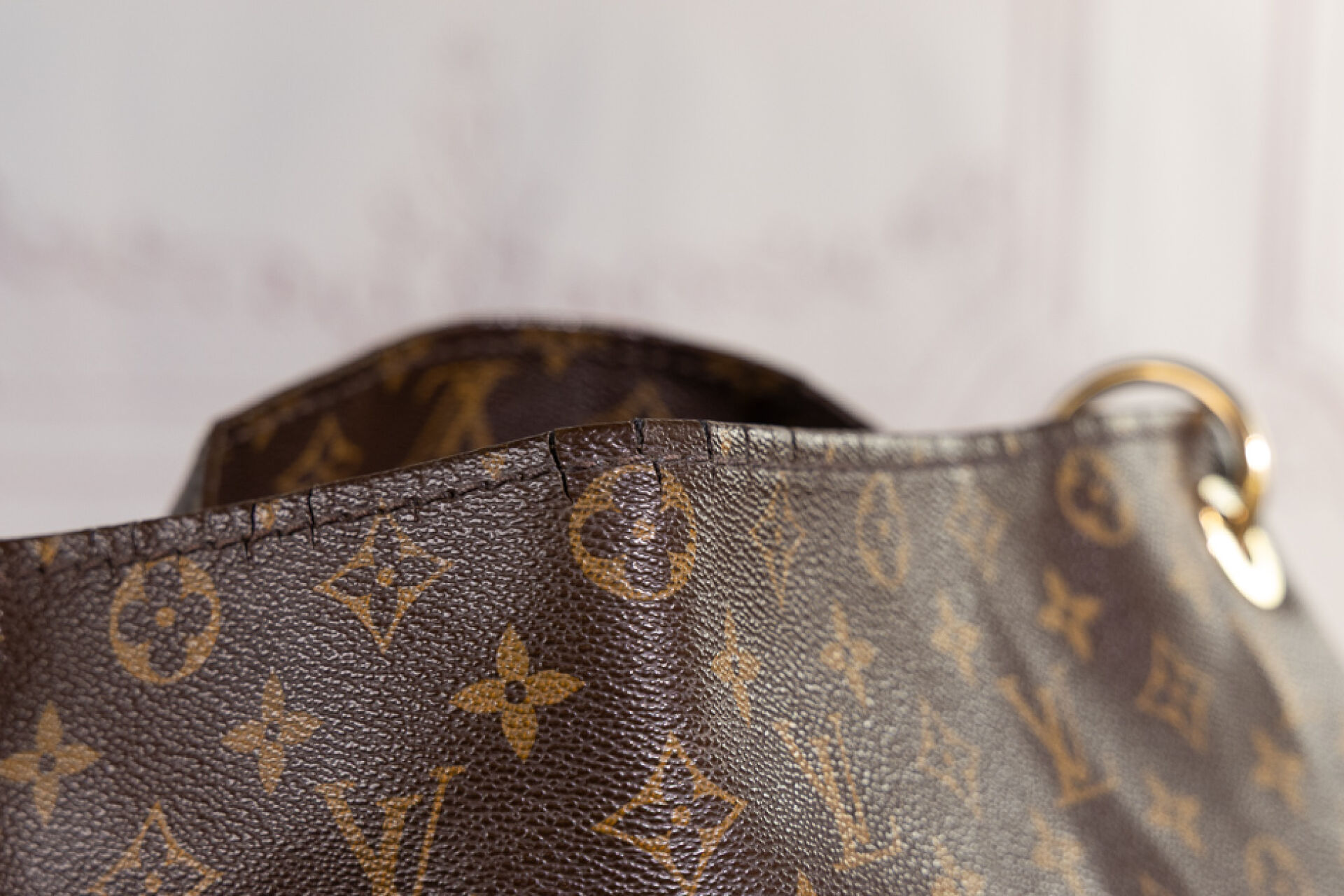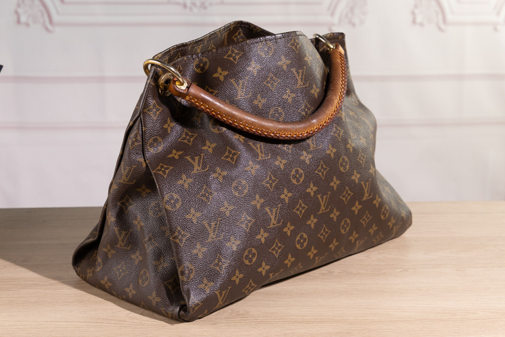 LOUIS VUITTON - Sac "Artsy" grand modèle en toile Monoogram et cuir naturel plissé de chaque côté sous la tâche anneau en métal doré de la anse tressée, doublure en suédine sable. Dustbag. Tampon Louis Vuitton Paris Made in Spain Haut. : 30 cm - Long. : 40 cm Patine, salissures, coins percés et fentes sur la toile sur le pourtour du haut