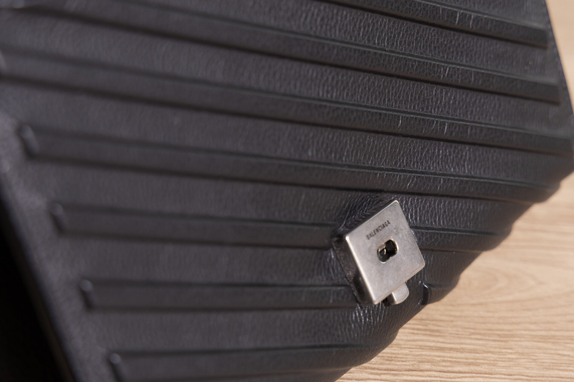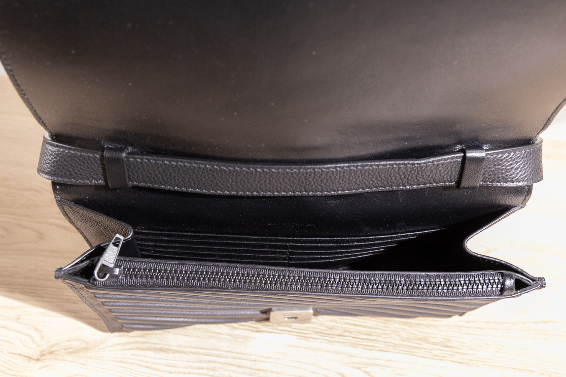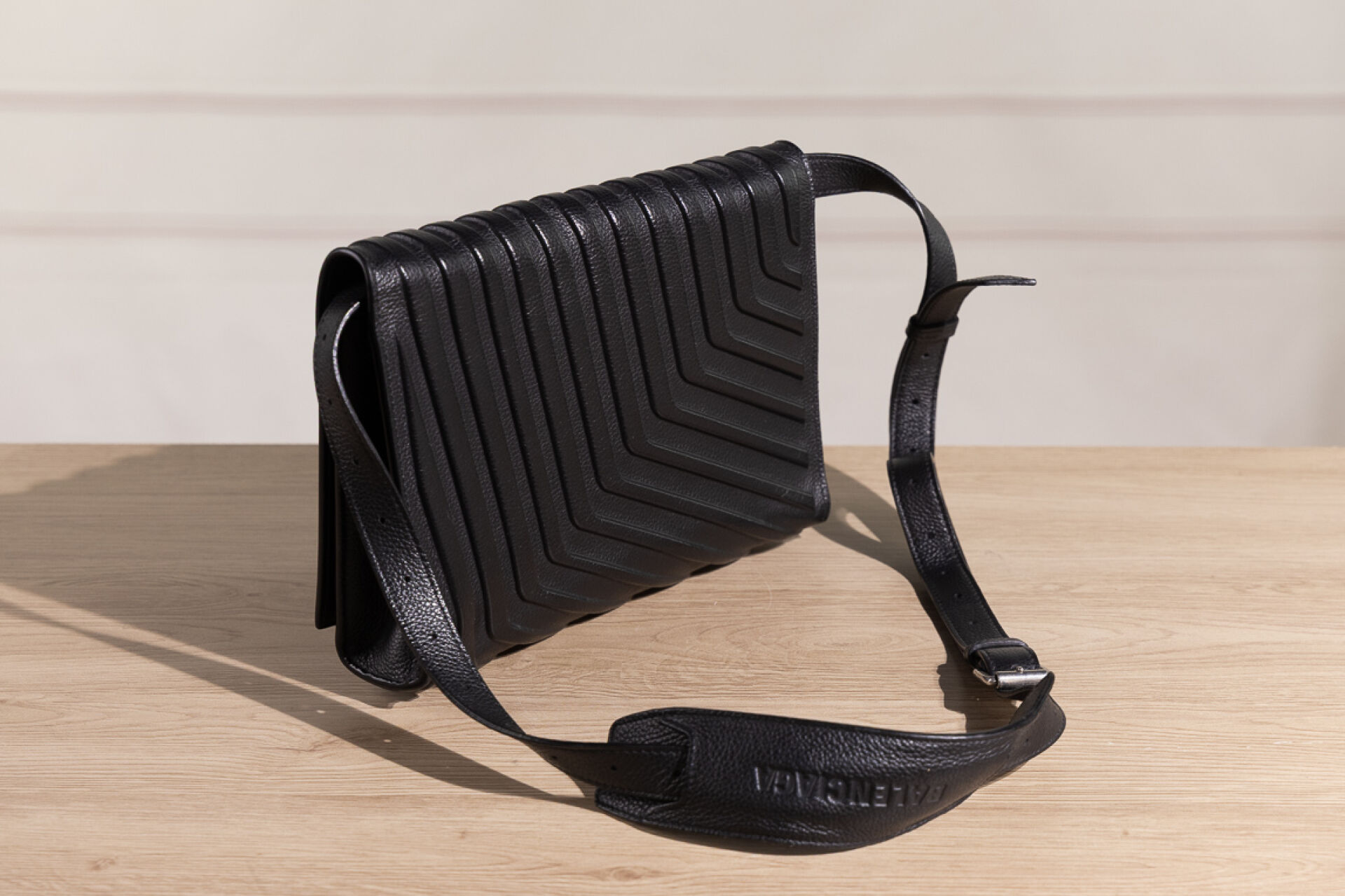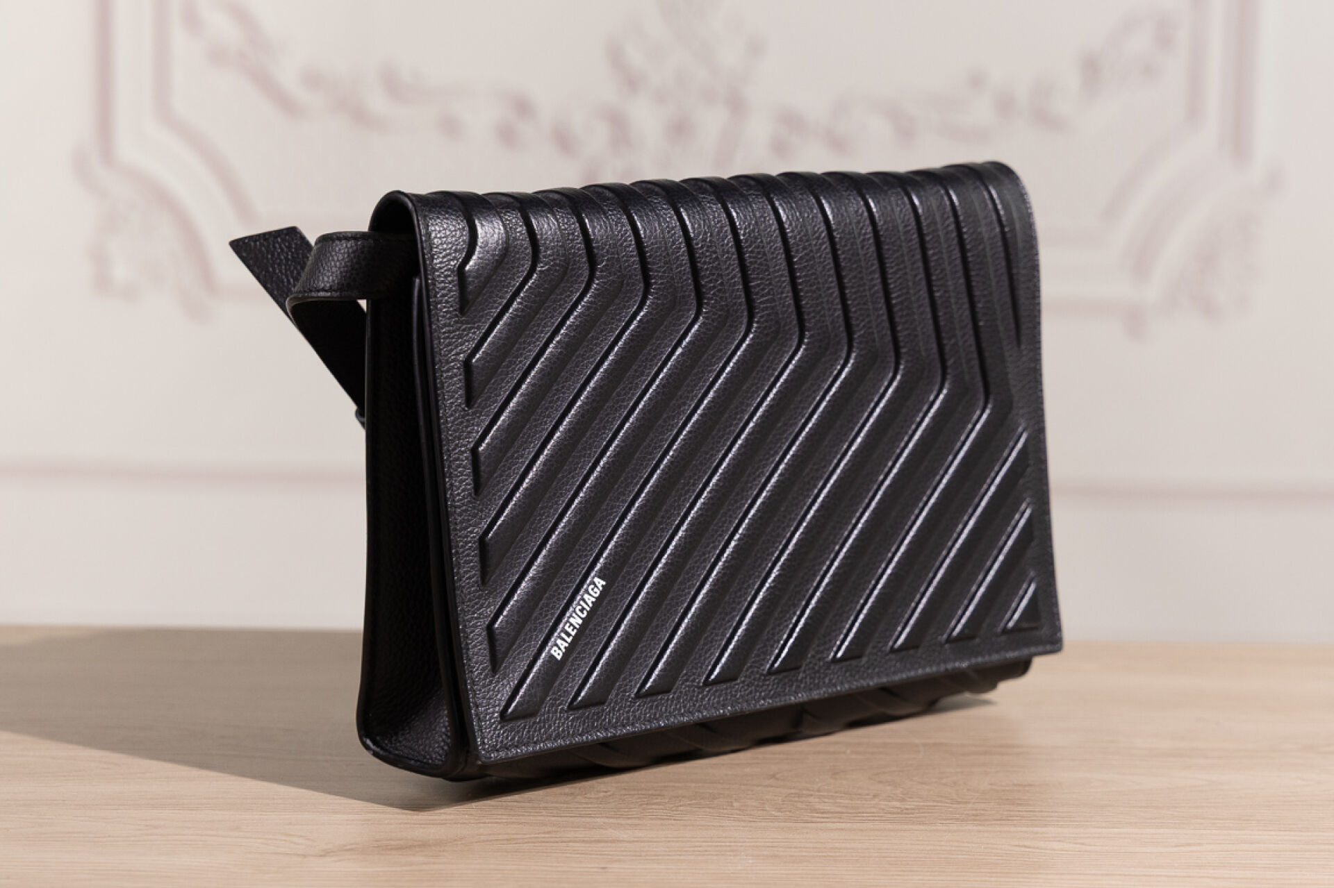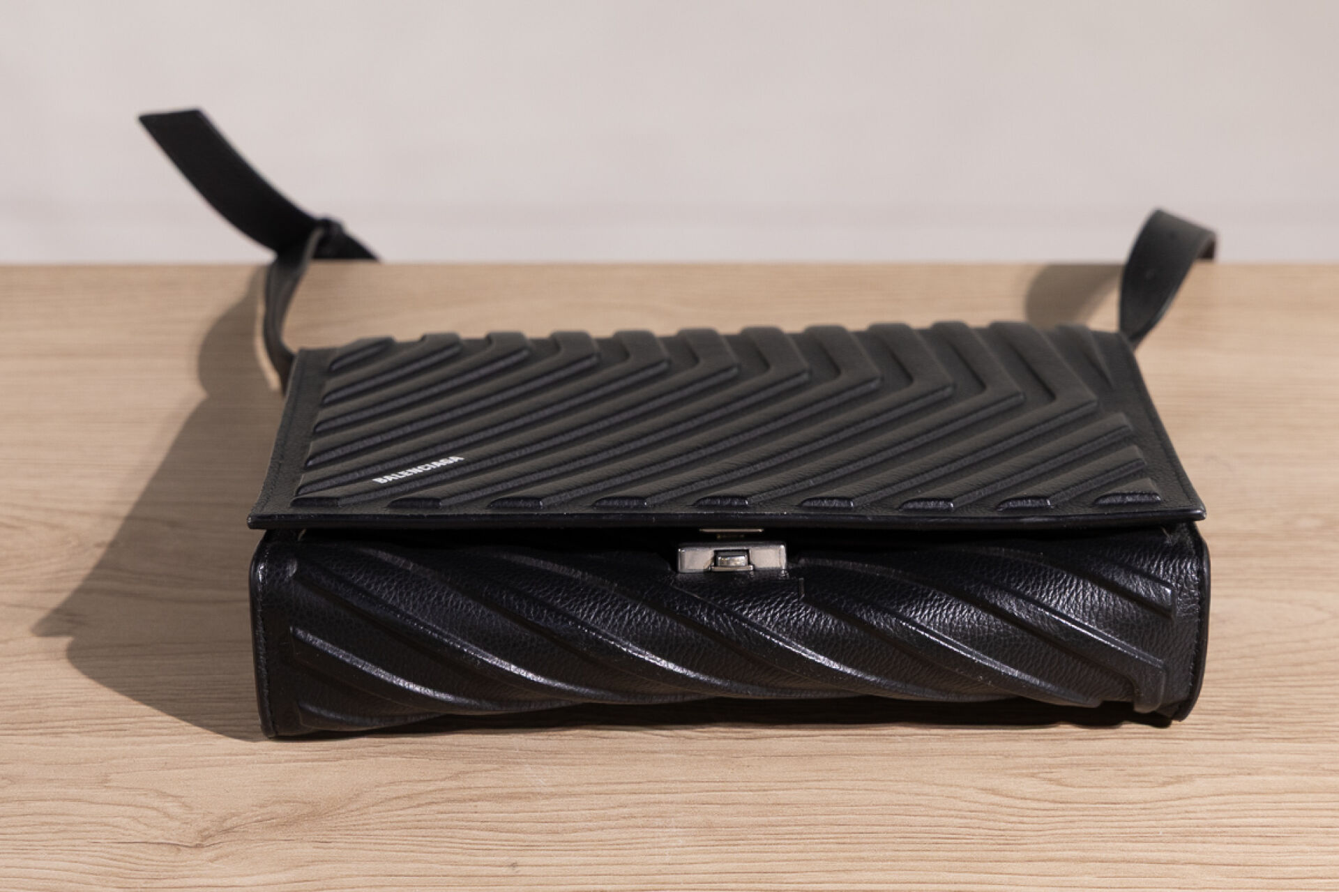 BALENCIAGA - Sac/pochette à rabat en cuir noir à chevrons, anse bandoulière amovible et ajustable. Haut. : 19 cm - Long. : 25 cm Petites traces, bon état général