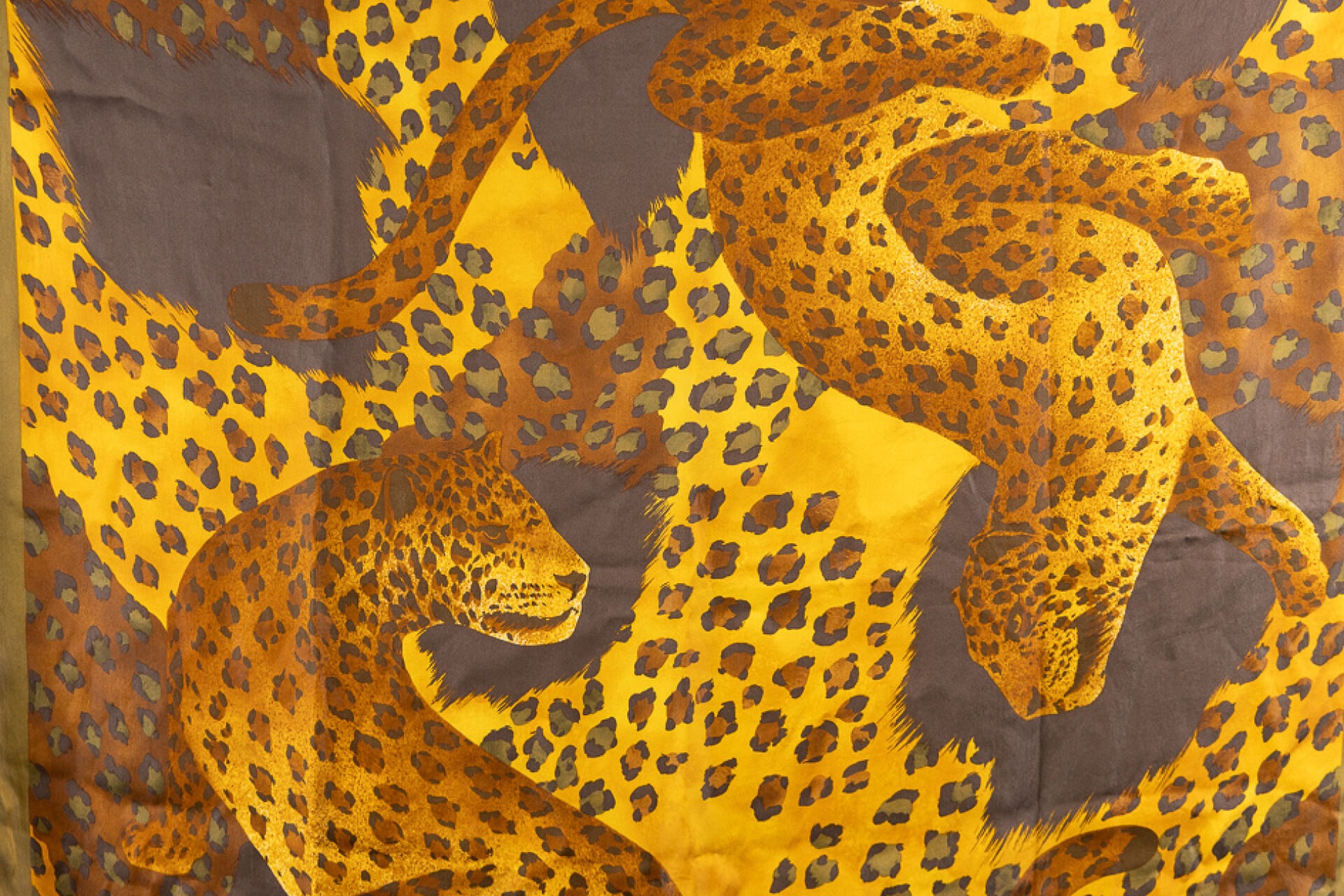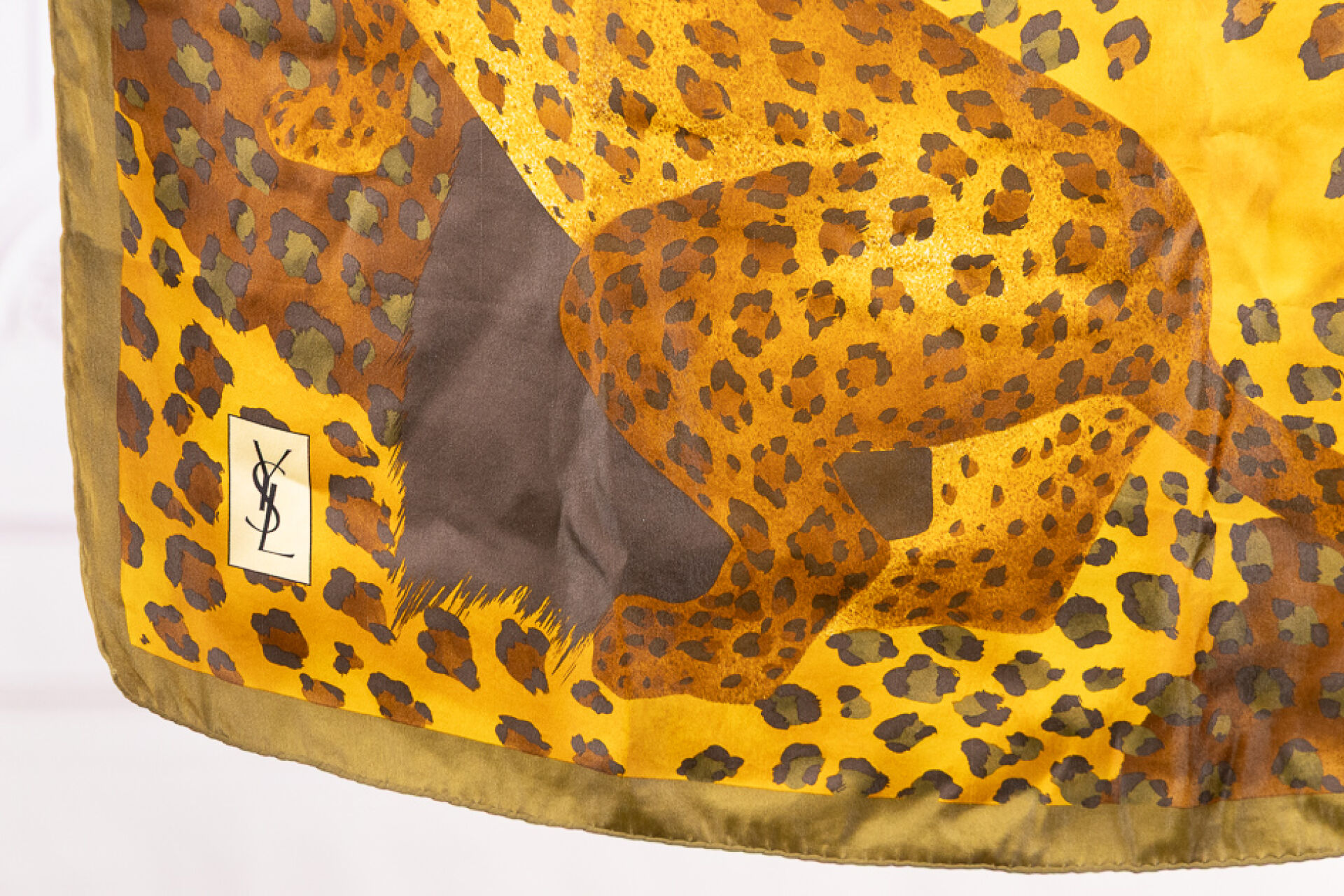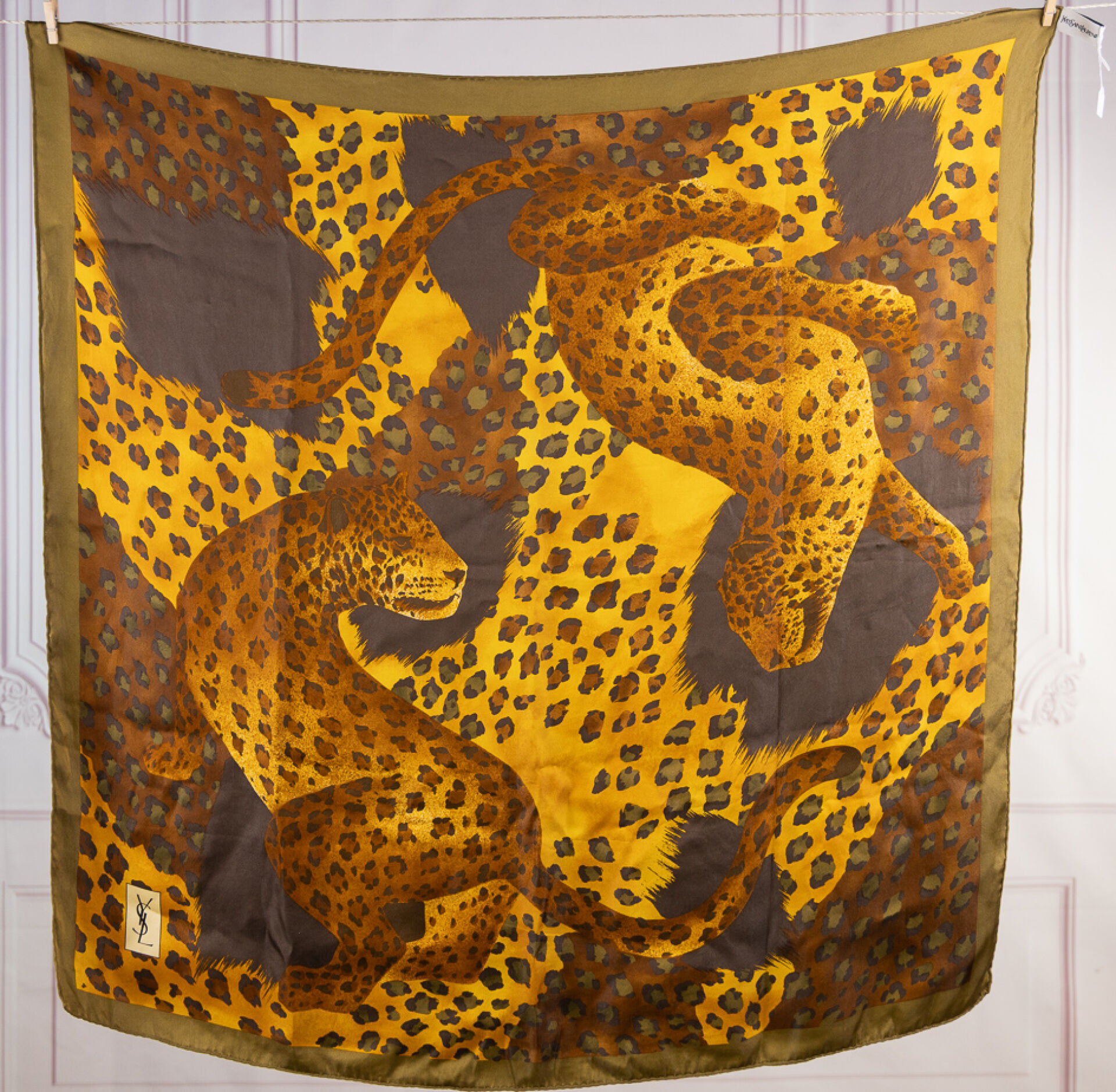 YVES SAINT-LAURENT - Carré en soie imprimée de motifs de léopard. 85 x 85 cm Bon état