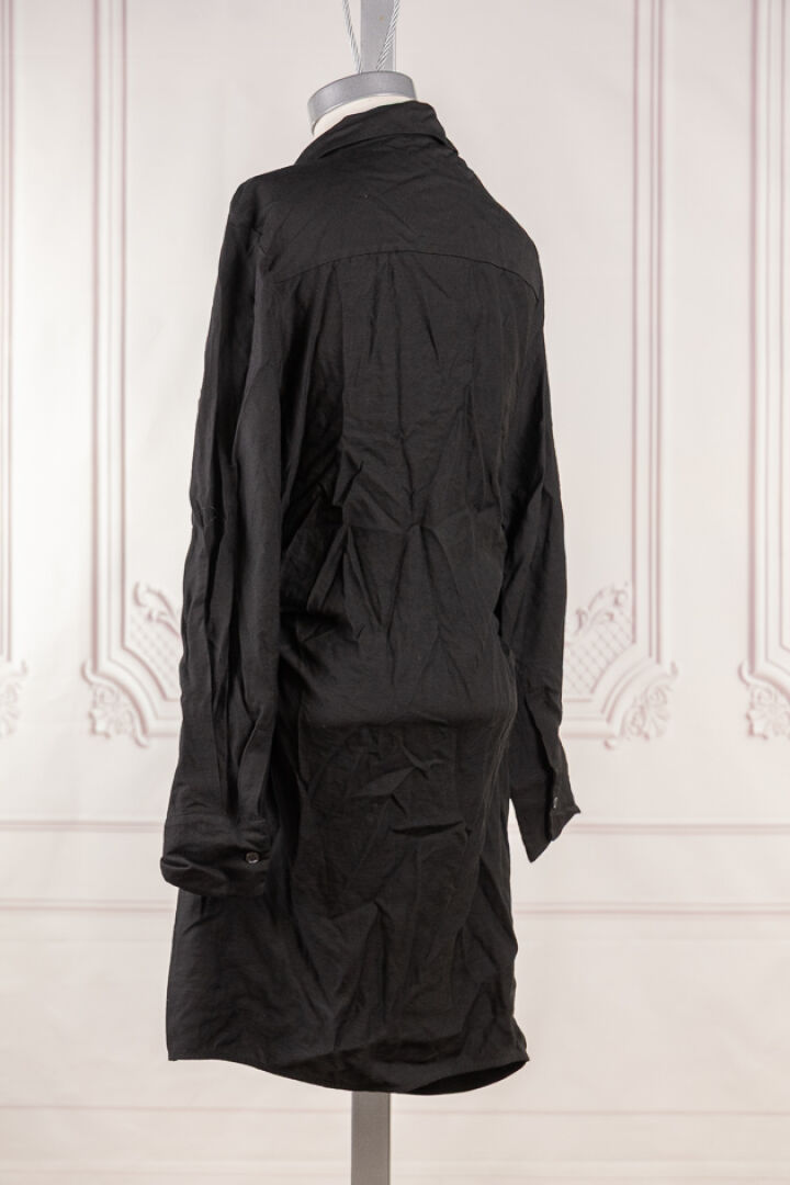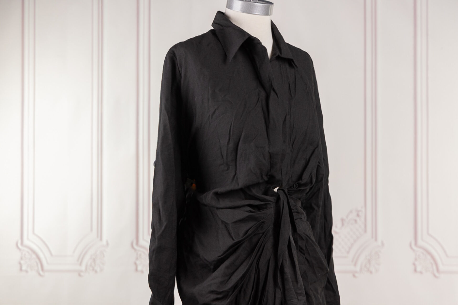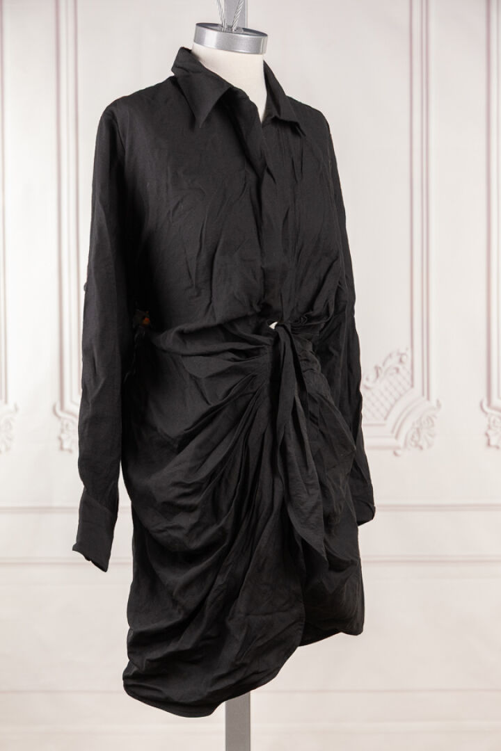JACQUEMUS Le Raphia - Robe courte noire à col, profond décolleté sur taille plissée ramassée par un simple boutonnage, manches longues. Taille indiquée 38 Bon état