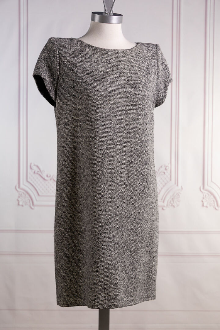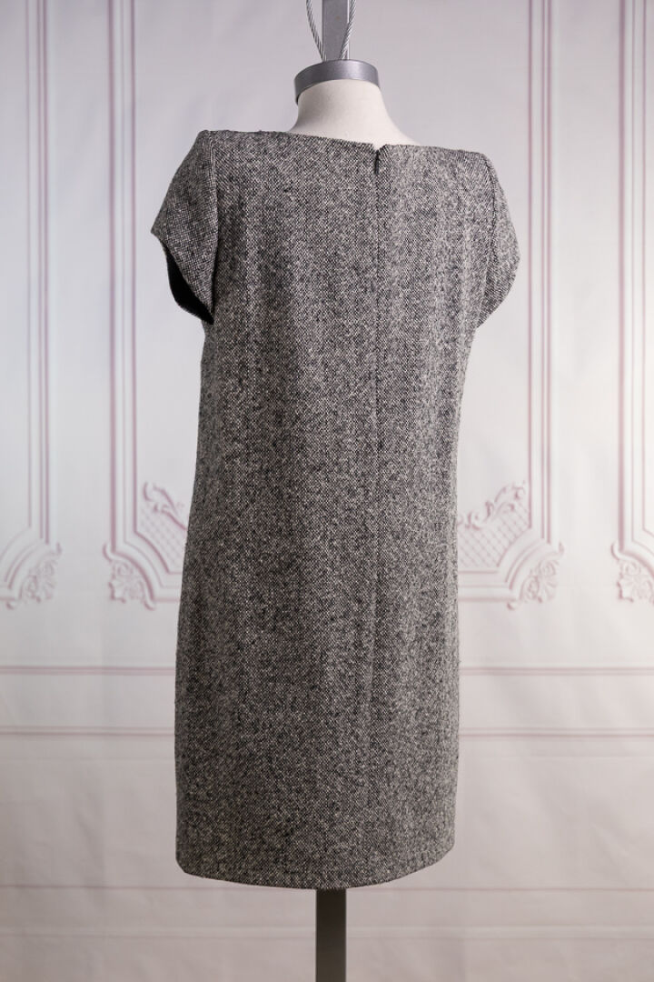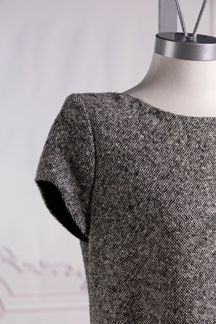 SAINT LAURENT Paris - Robe courte en lainage chiné gris, noir et blanc, encolure légèrement bateau, petites manches. Taille supposée 38 Très bon état