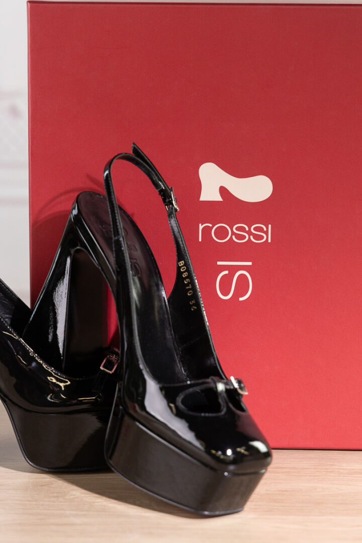 SERGIO ROSSI - Paire d'escarpins ligne "Si Rossi" en cuir vernis noir à important talon découpé, empeigne découpée sous bride. Pointure indiquée 36 - Haut du talon : 12 cm - Haut de la plateforme : 4 cm Etat neuf, dans sa boite, cependant quelques craquelures sur la bride à l'intérieur