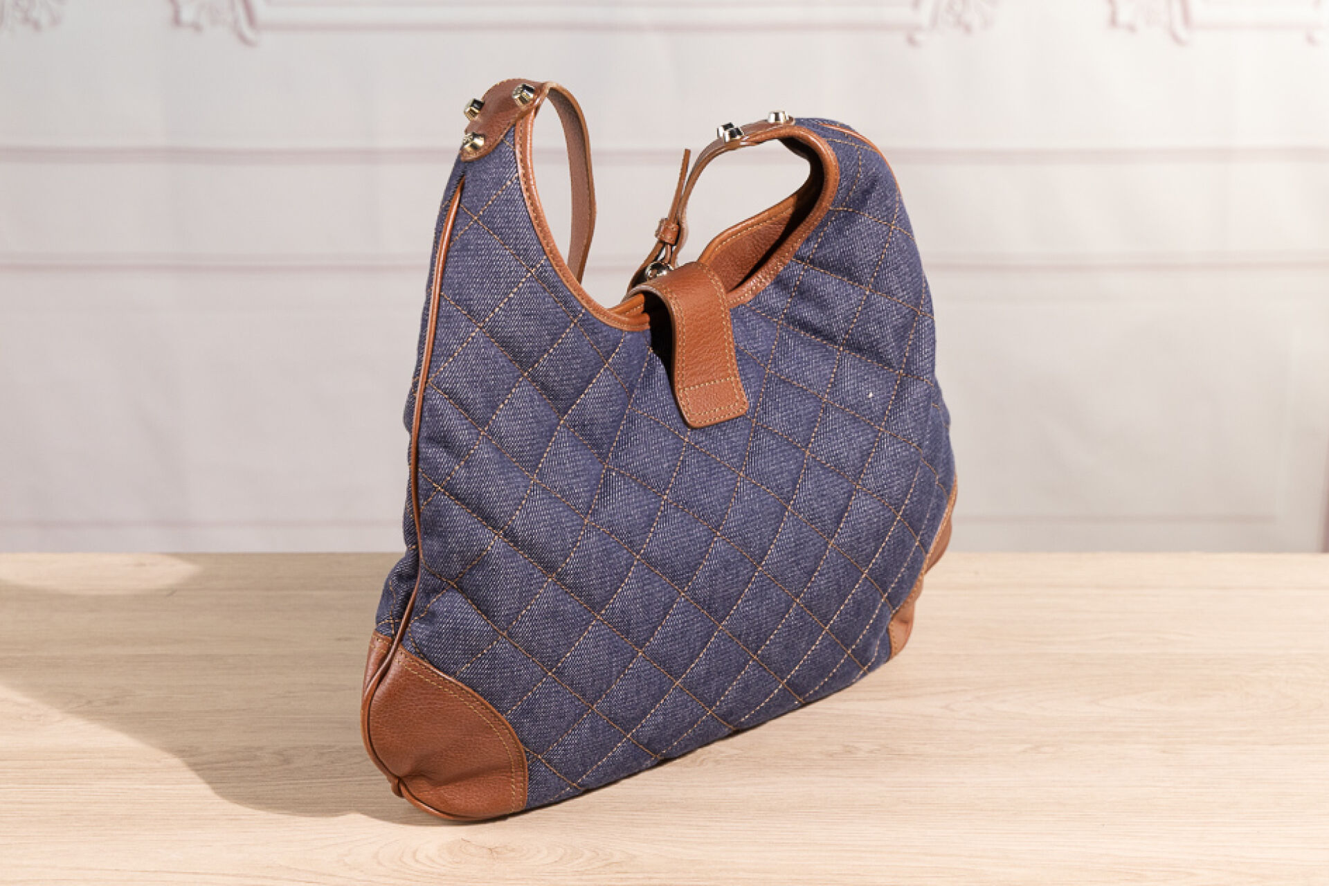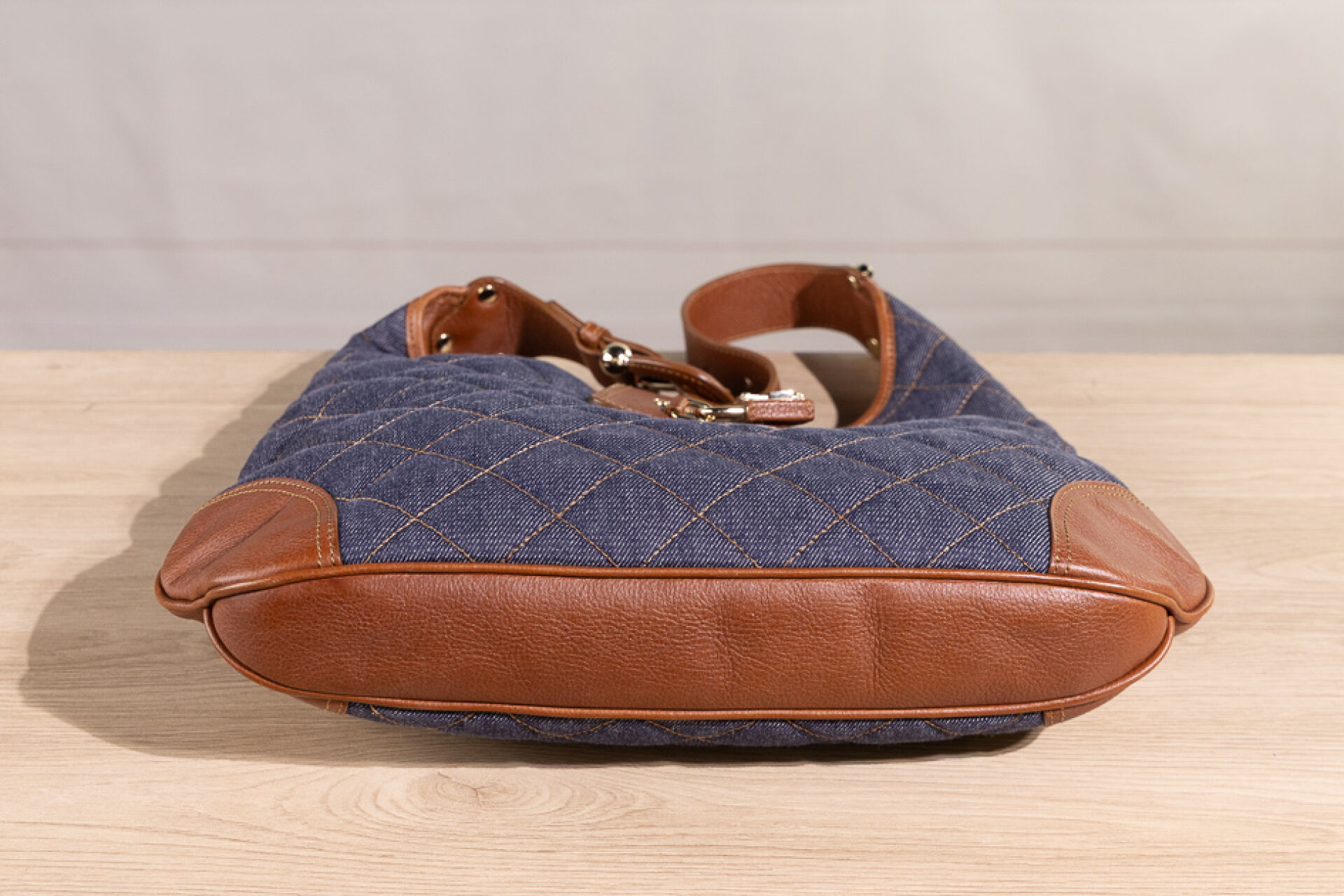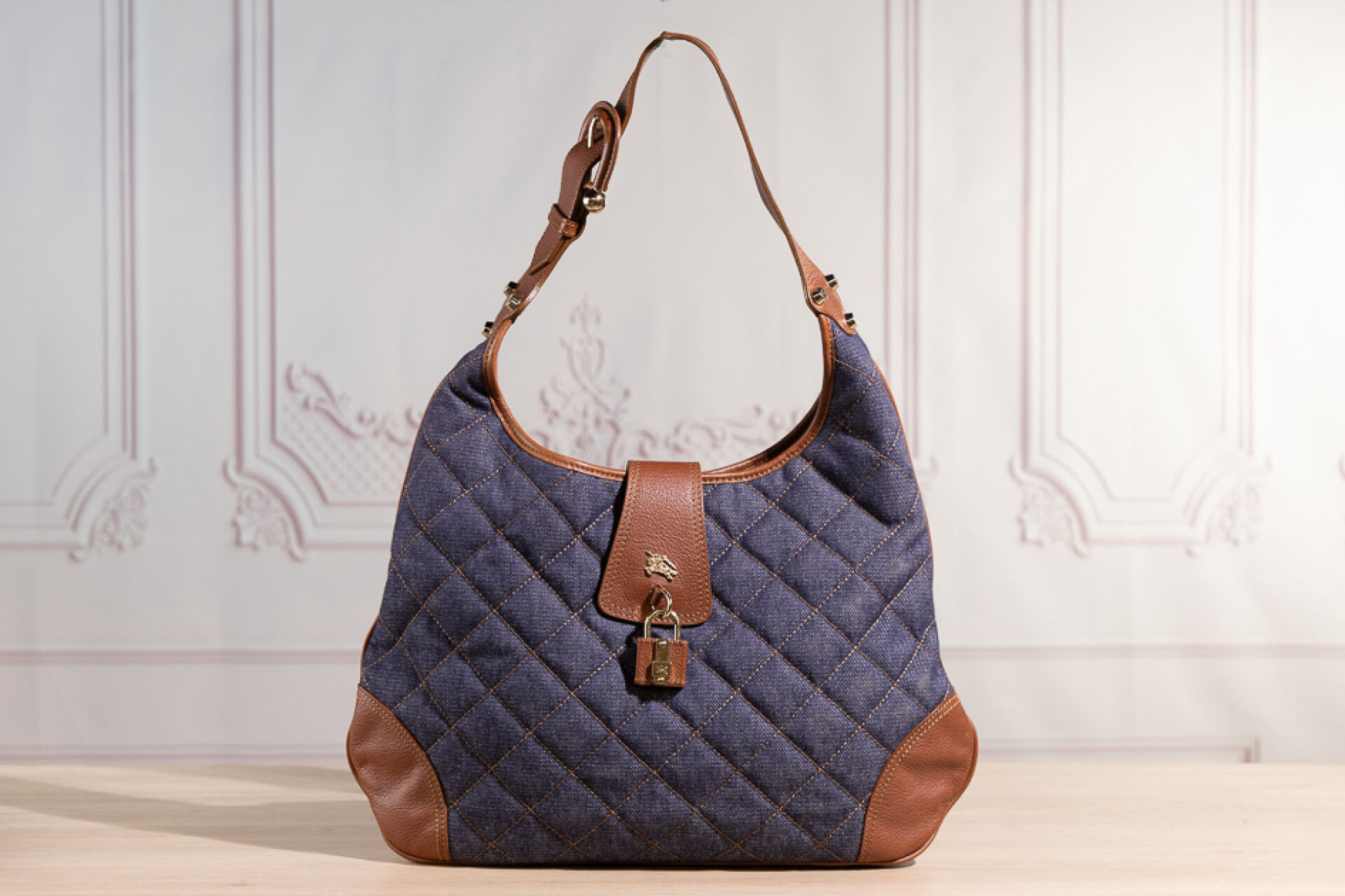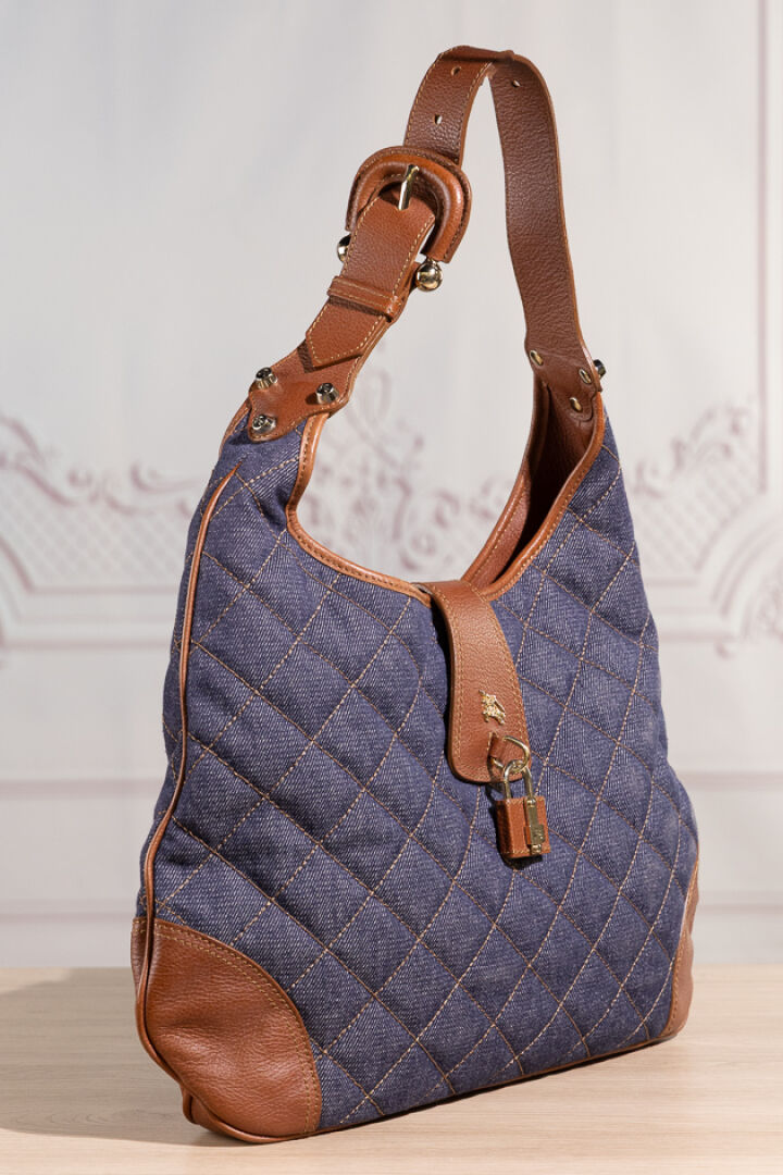 BURBERRY - Sac porté épaule en denim brut matelassé et cuir marron, fermoir aimanté sous patte à finition cadenas, anse réglable. Haut. : 28 cm - Long. : 40 cm Bon état
