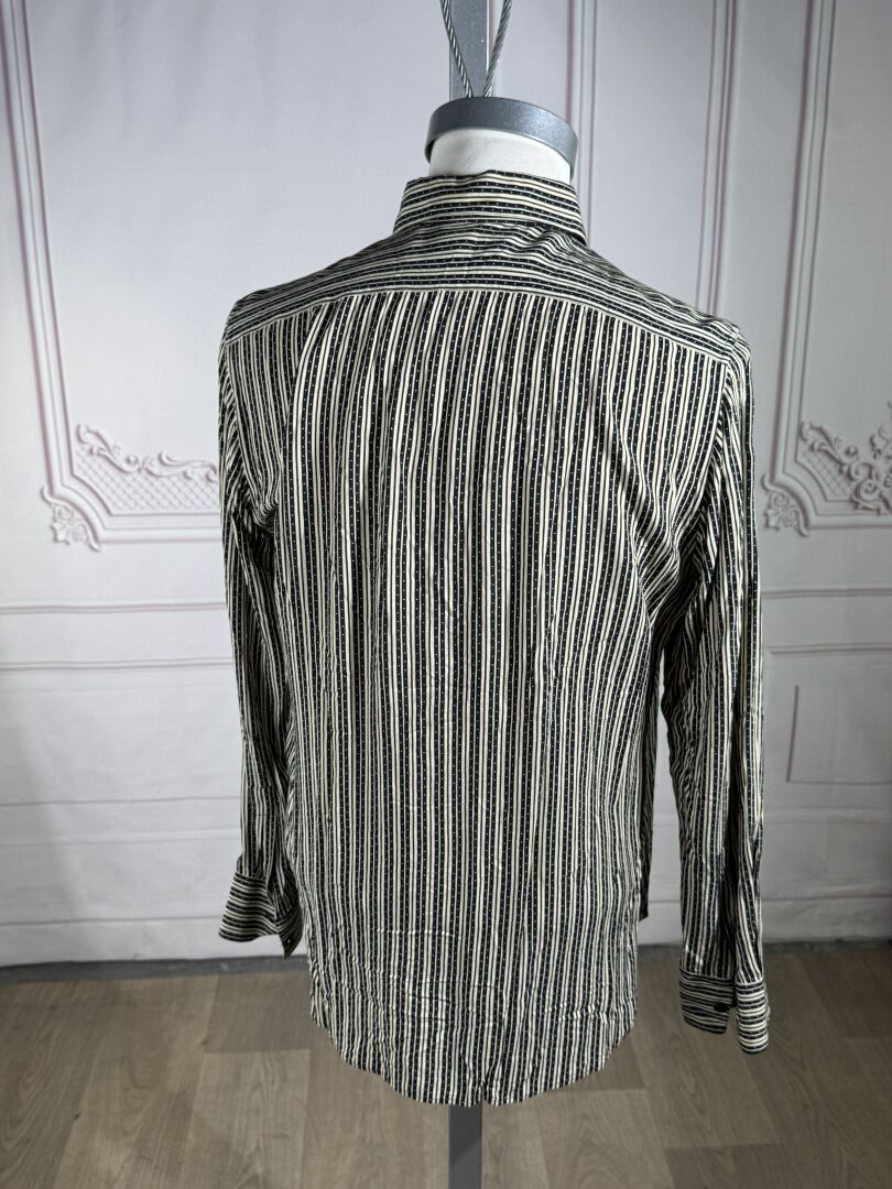 SAINT LAURENT Paris - Chemise en viscose rayée noir sur fond beige, petit col sur simple boutonnage sous patte, manches longues. Taille indiquée 37 Déjà portée, salissures