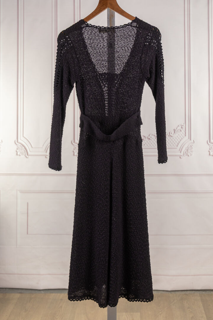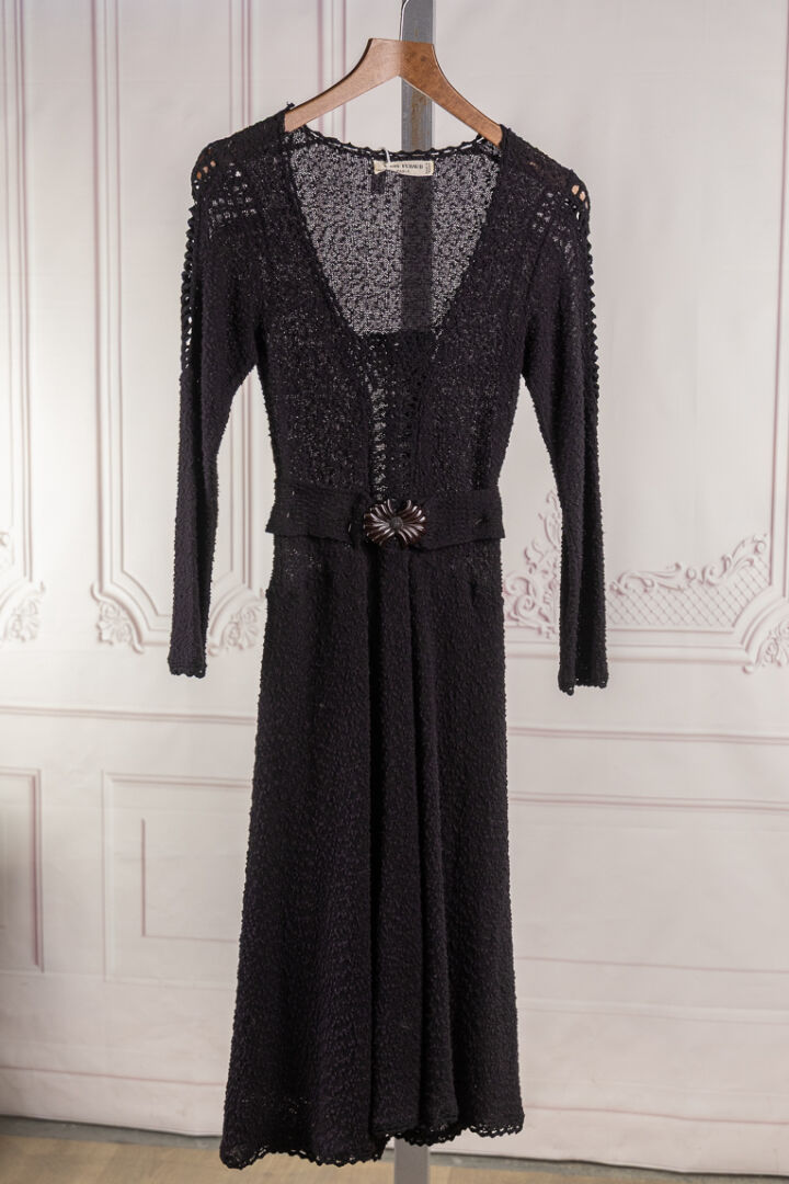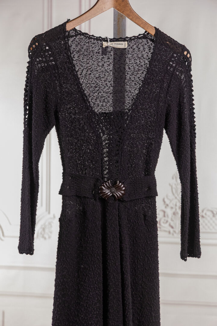 LOUIS FERAUD - Une robe de cocktail mi longue, guipure noire, encolure carrée, manches 3/4, ceinture. Taille supposée 34-36 Bon état
