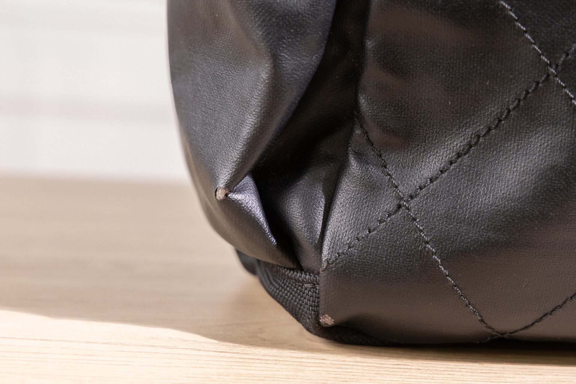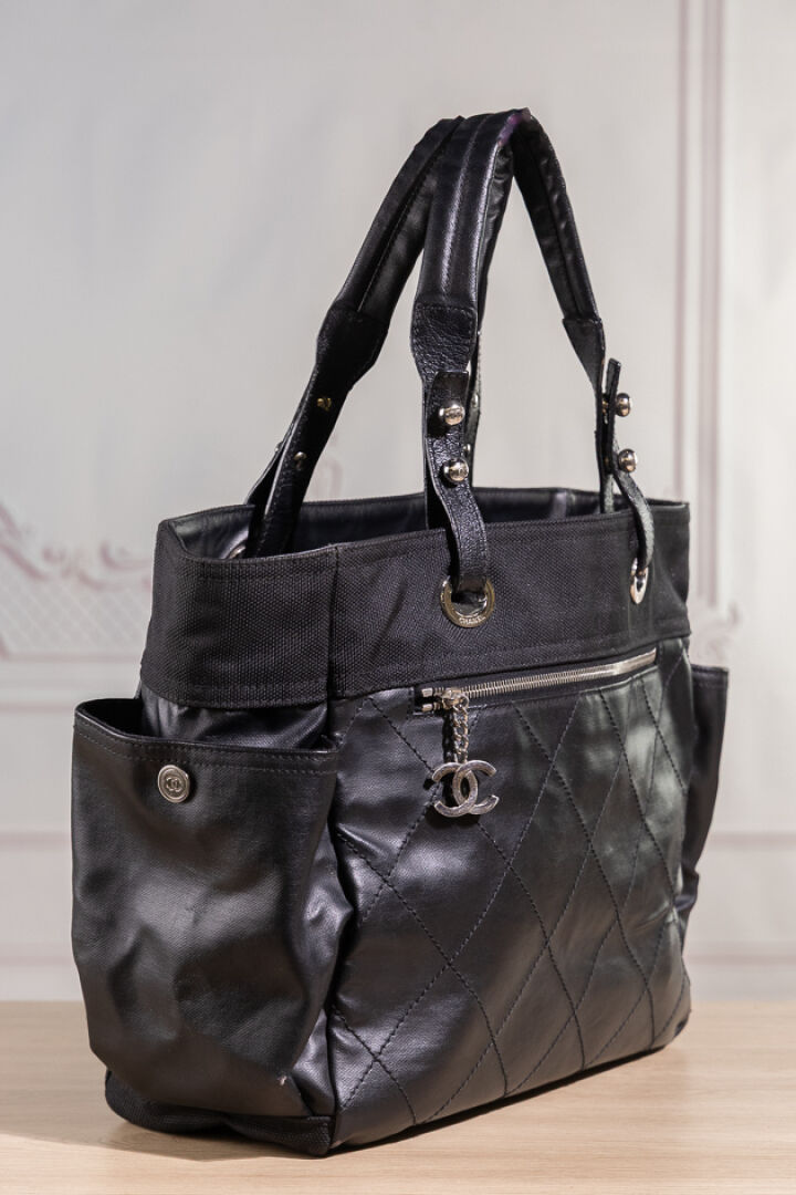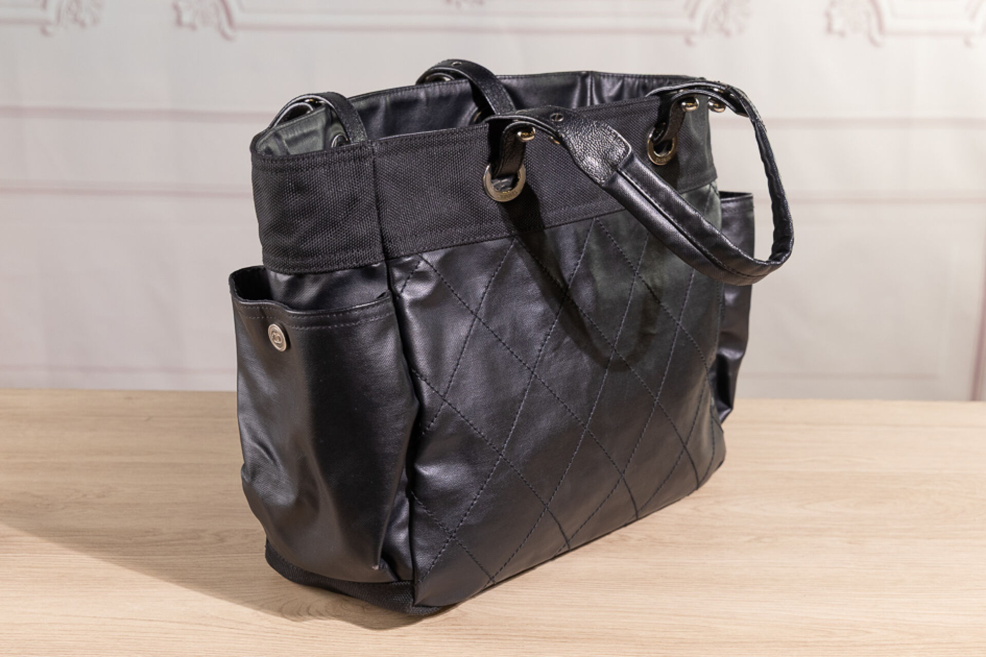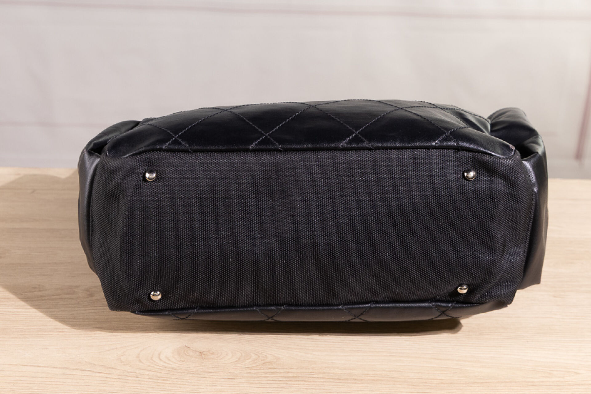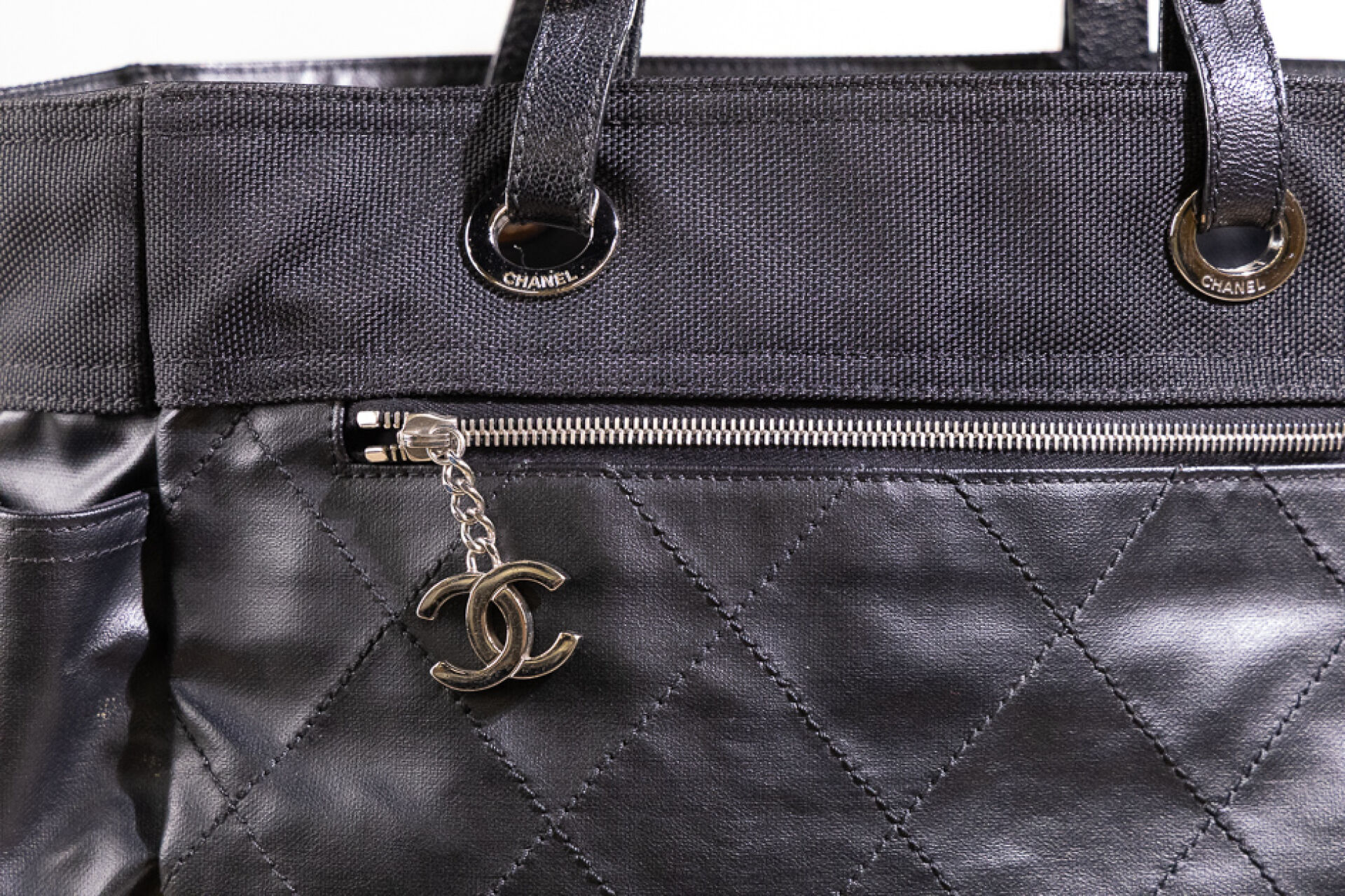 CHANEL - Sac cabas en toile enduite matelassé noire, deux poches aimantées de chaque côté, poche zippée au dos, double anse, fermeture à glissière. Tampon argent Chanel Made in Italy, hologramme N° 11722212 Haut. : 30 cm - Long. : 35 cm Usures et petites déchirures