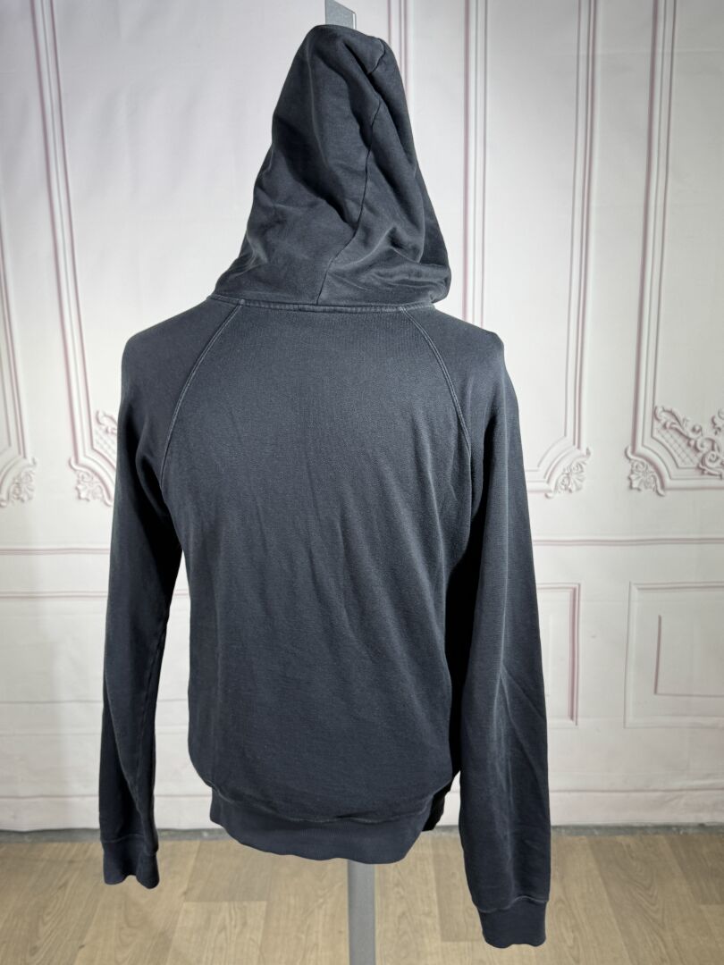 SAINT LAURENT - Sweat en coton noir imprimé "Malibu" sur le devant, poche kangourou, manches longues, capuche. Taille indiquée XS Déjà porté, usures, trous