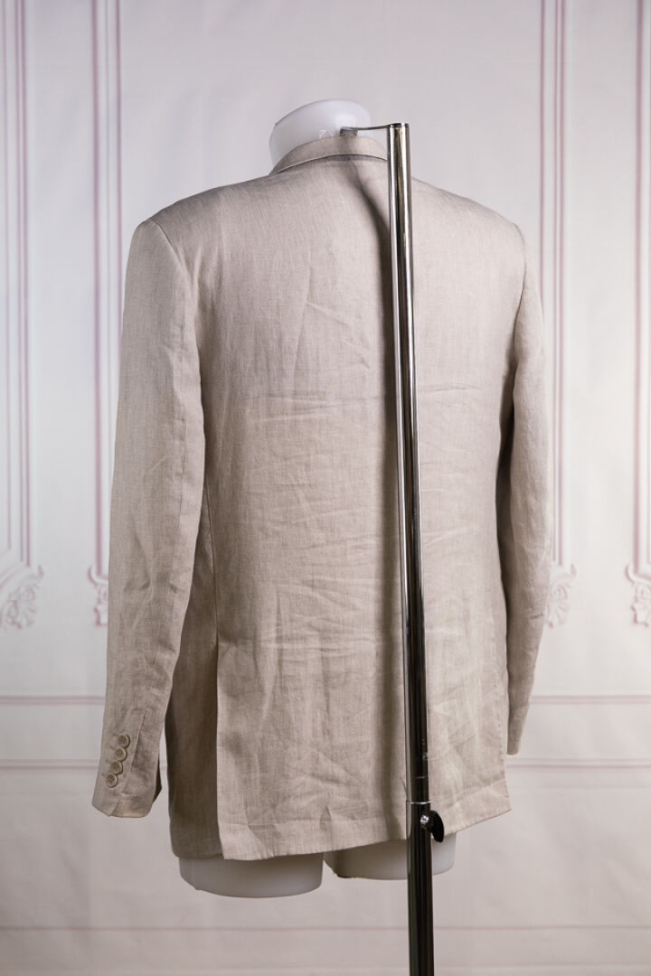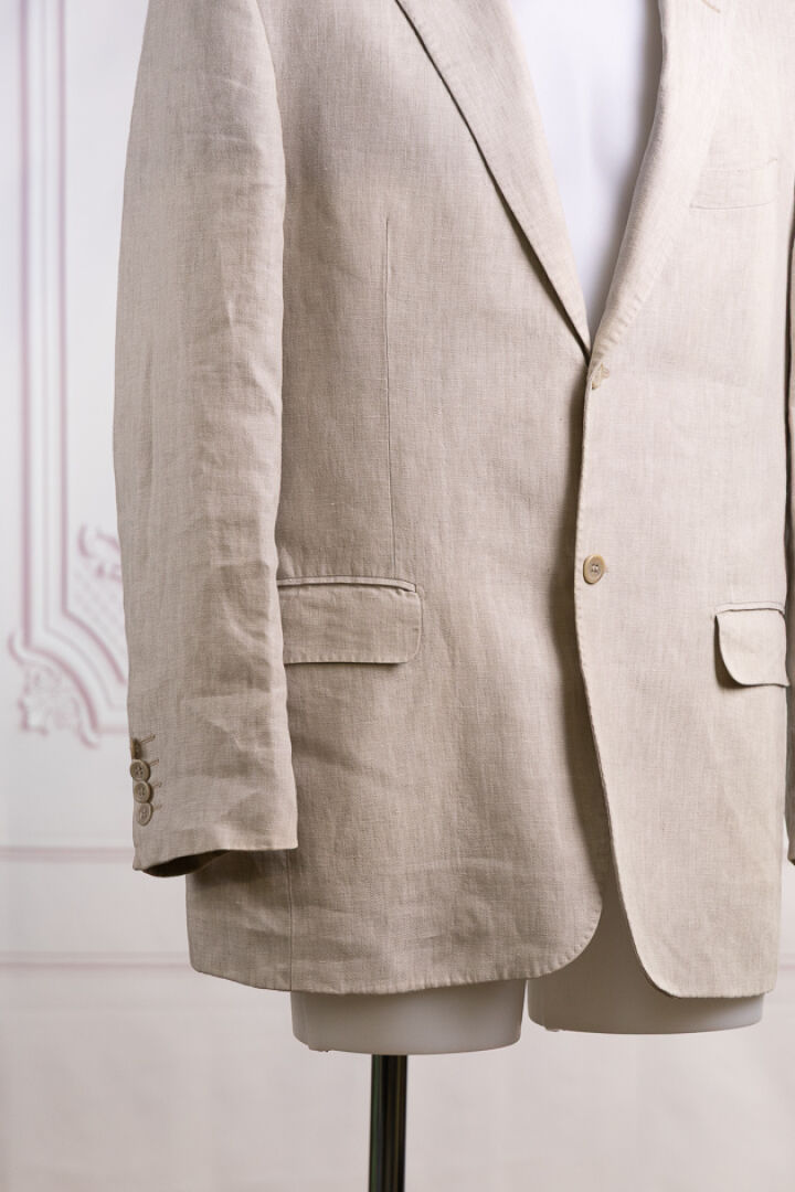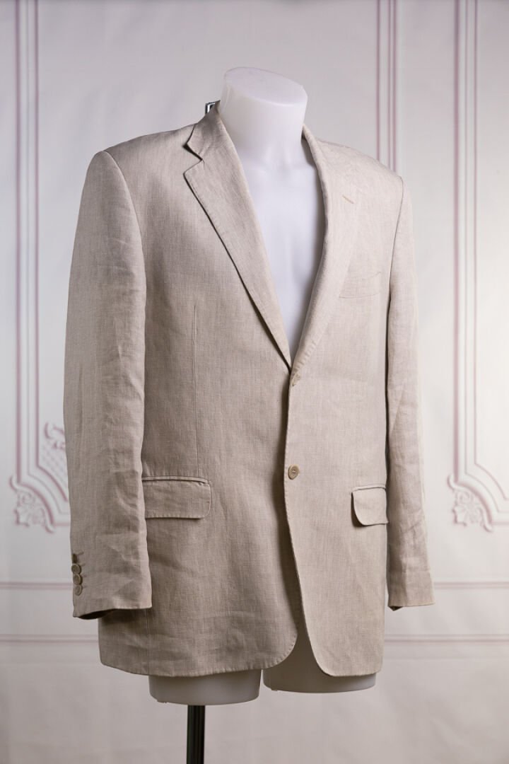 CHRISTIAN DIOR Monsieur - Veste de costume en lin chevrons gris-vert, col cranté, simple boutonnage, trois poches, manches longues, deux fentes au dos. Taille indiquée 50 Déjà porté
