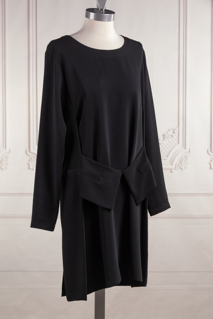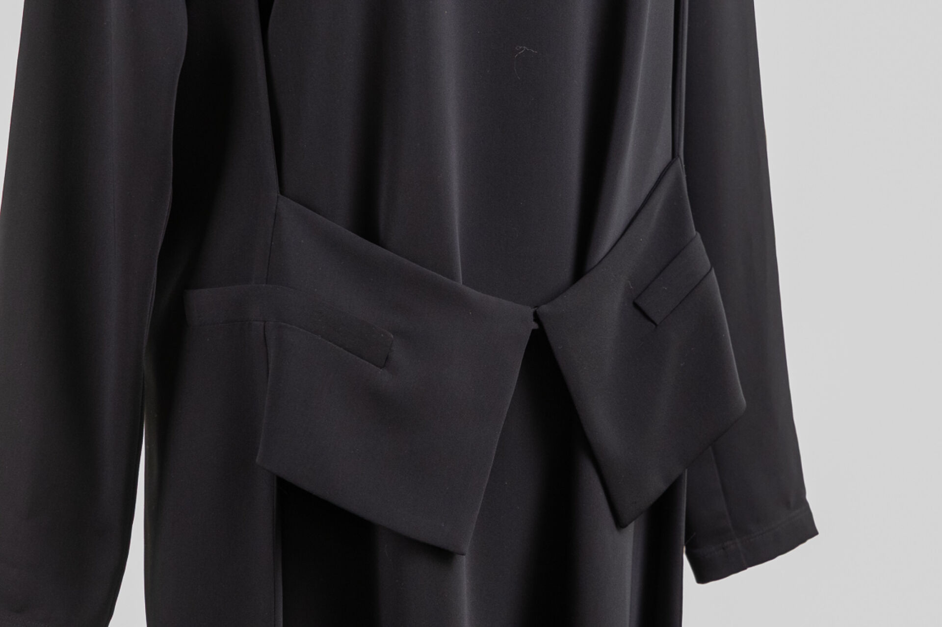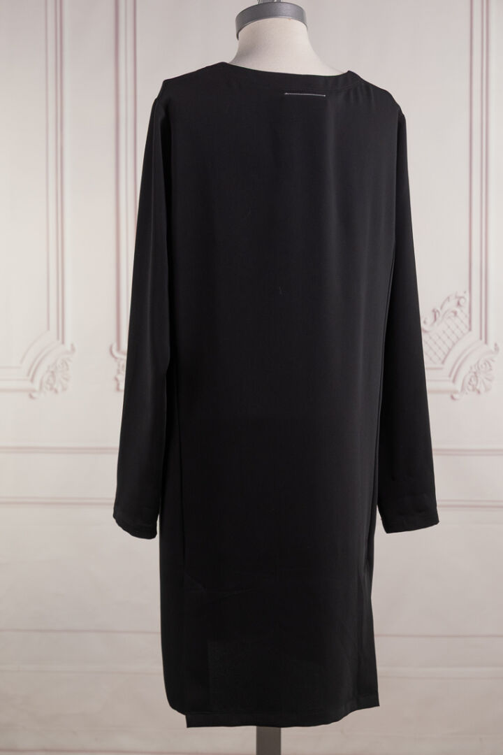 MAISON MARTIN MARGIELA - Ligne 6 - Robe courte en polyester noir à effet deux pièces par une ceinture simulant un gilet boutonné, sur fente de part et d'autre, encolure ronde, manches longues. Taille indiquée: 44 soit 40 actuel Déjà porté, bon état