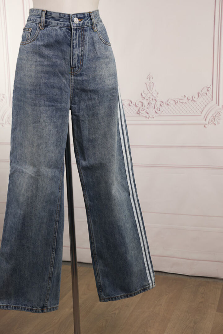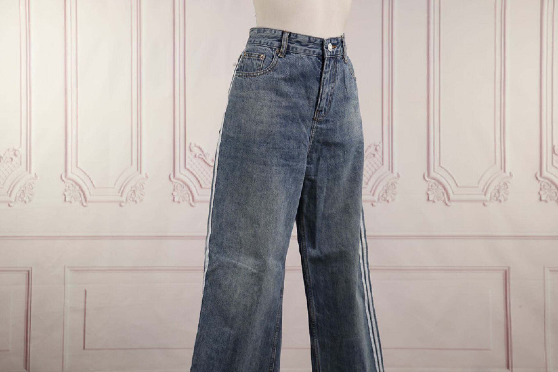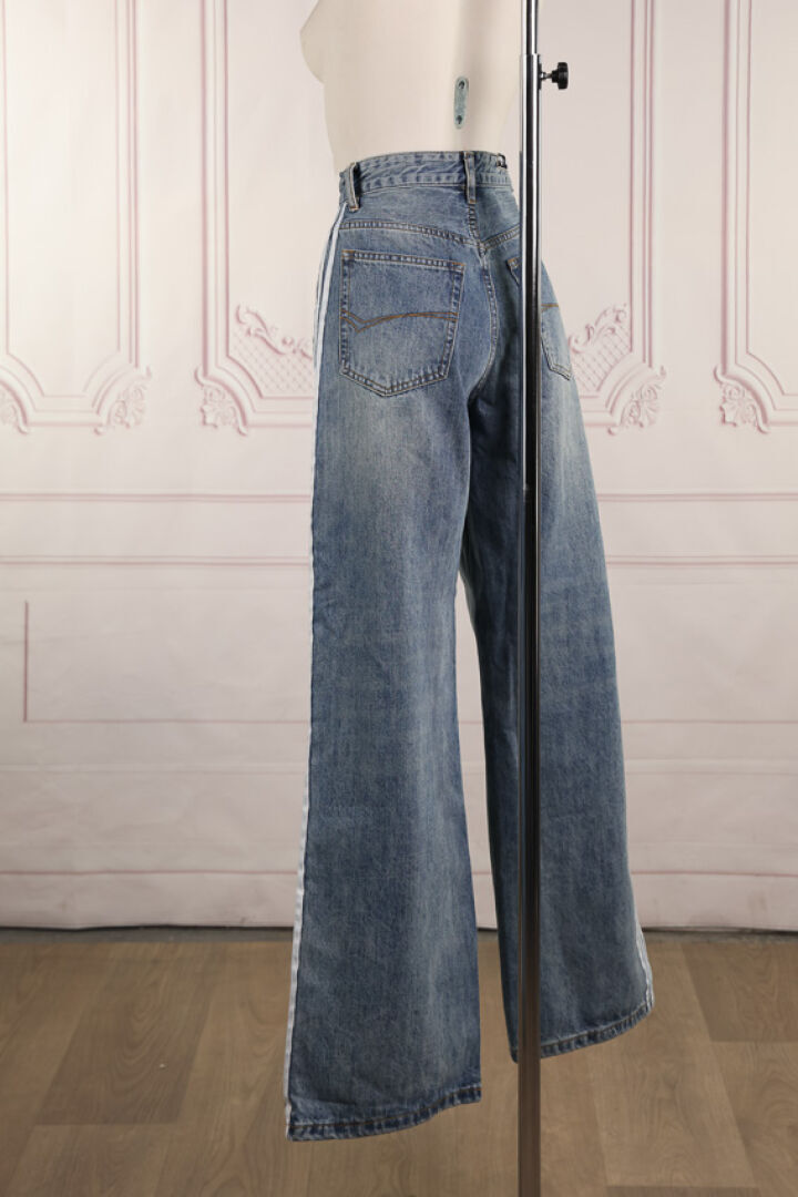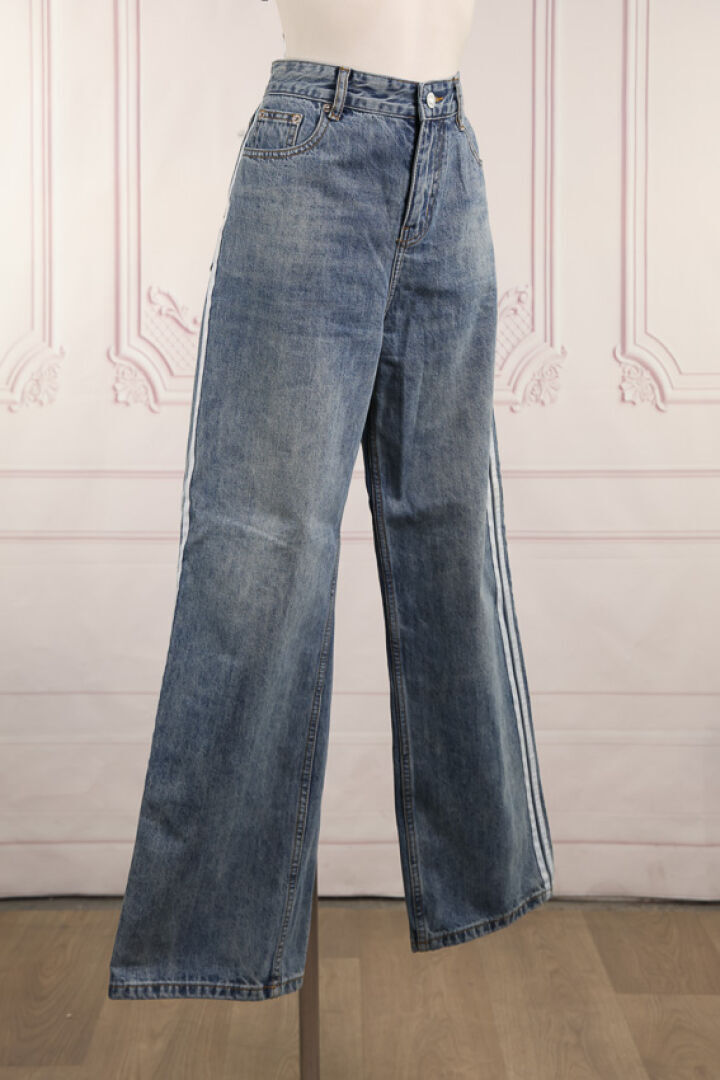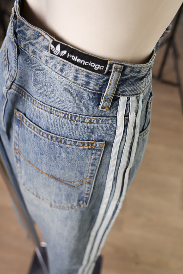 BALENCIAGA x ADIDAS - Pantalon denim légèrement délavé à triple bandes blanches sur toute la hauteur de chaque côté, cinq poches. Quelques traces notamment de bleu sur le blanc. Taille indiquée L (taillant 38)