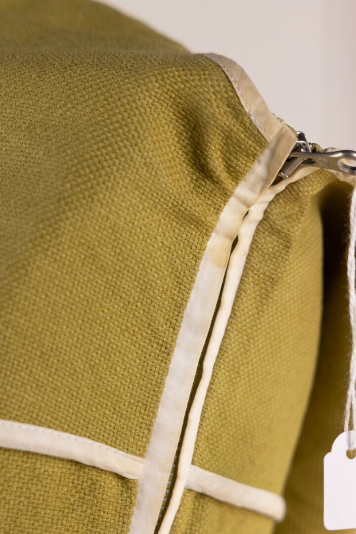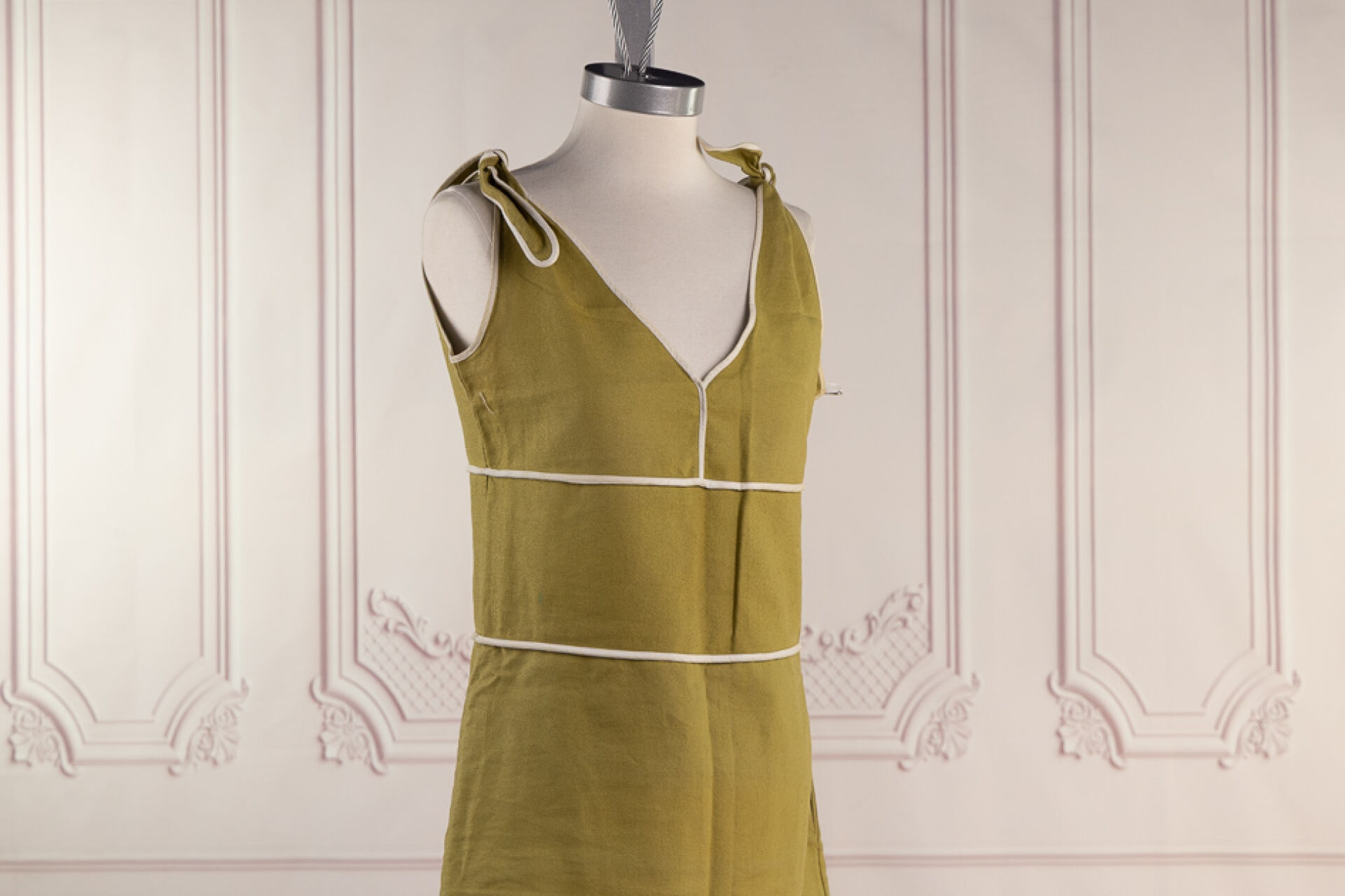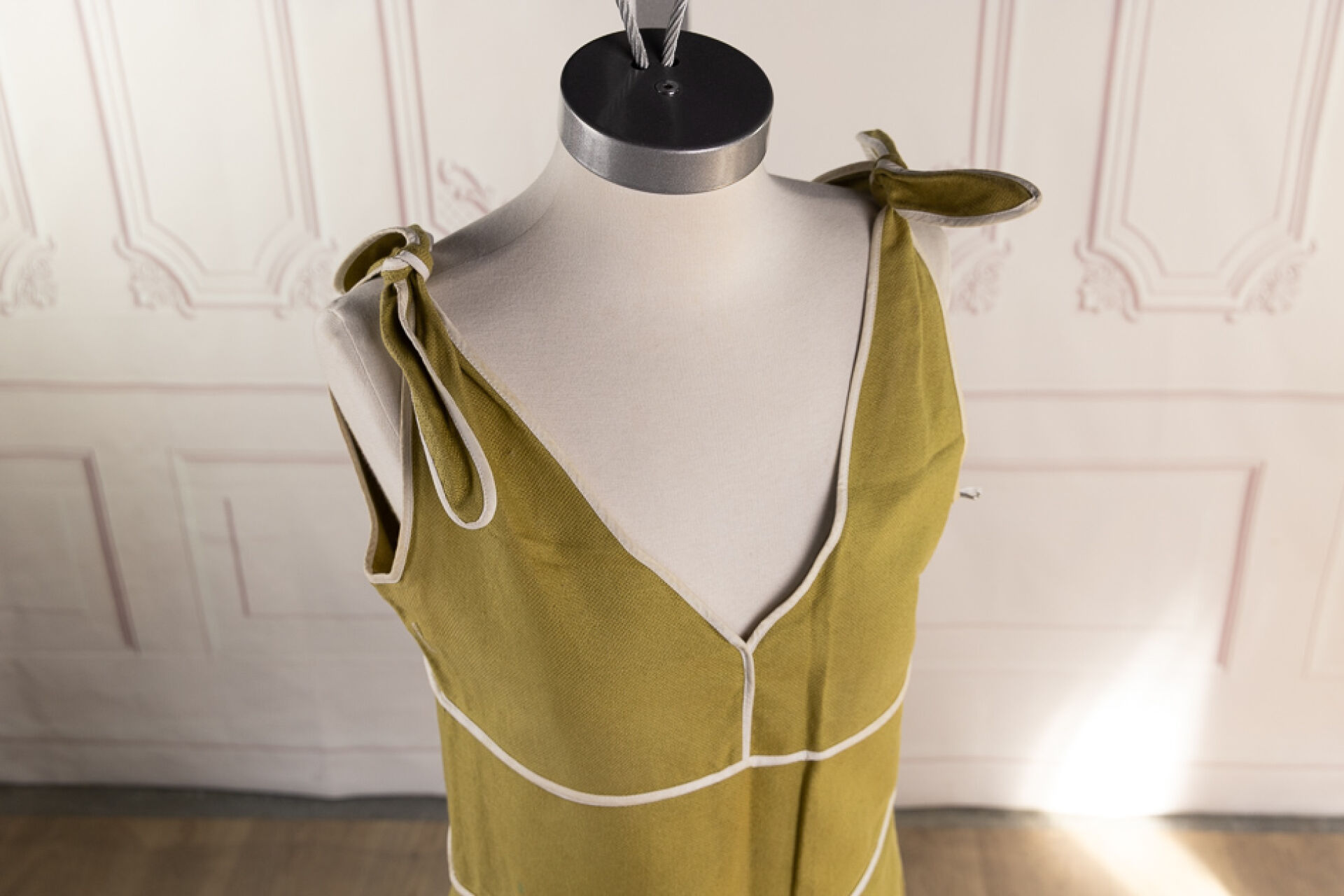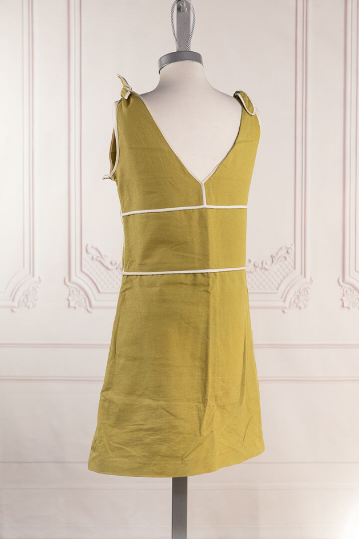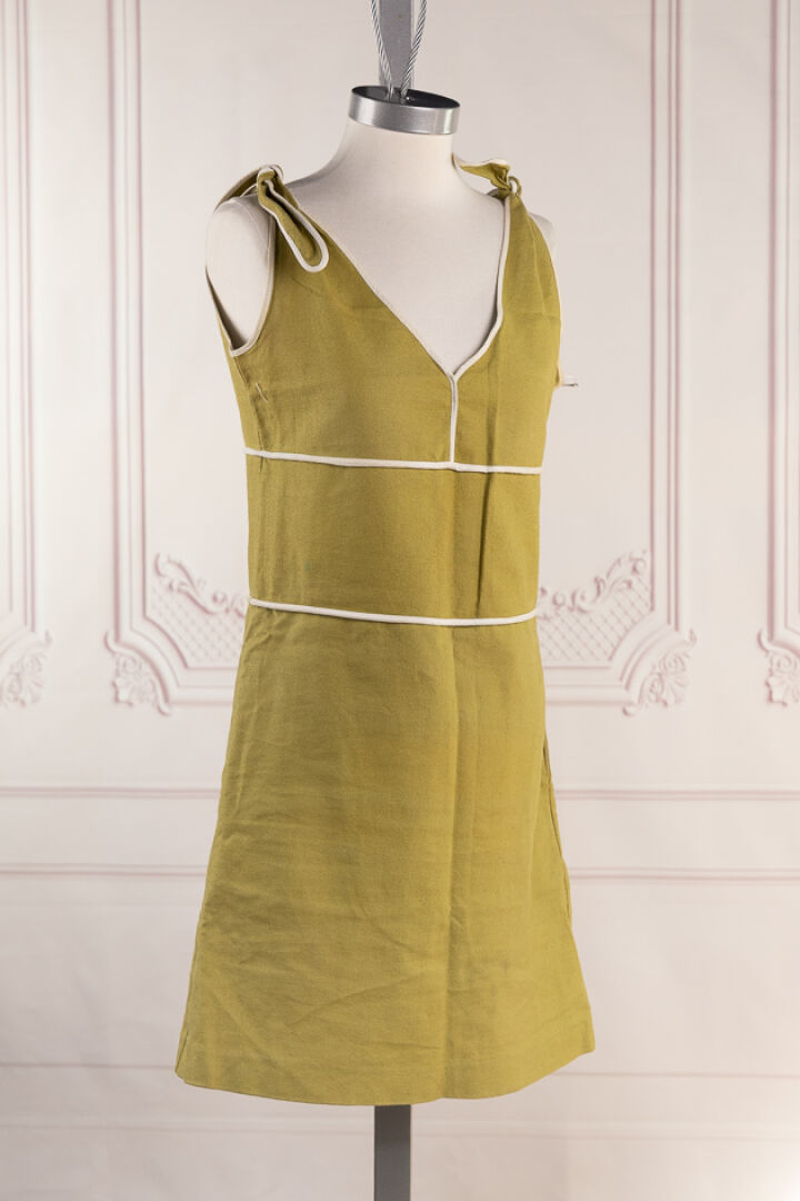 SEE BY CHLOÉ - Robe à bretelle en lin et coton olive rehaussé d'un galon blanc. Taille 36 (tâches et décolorations)