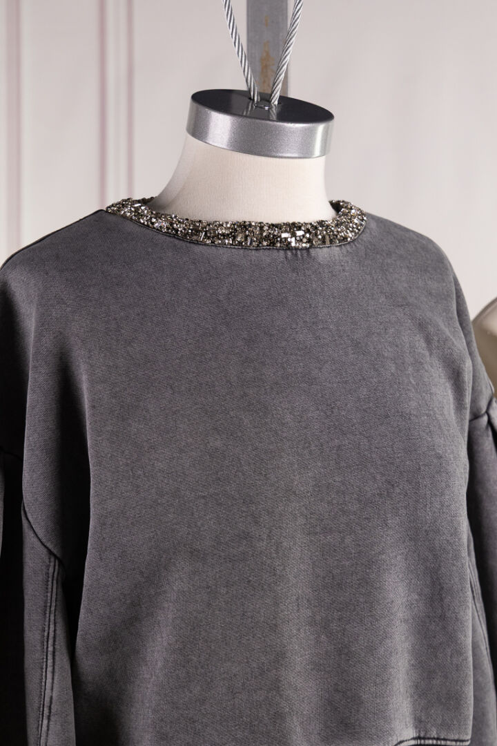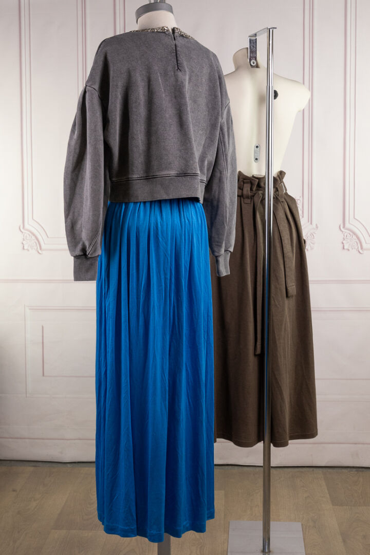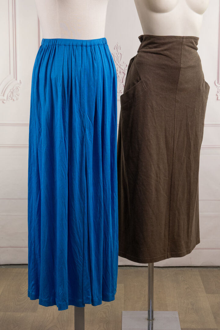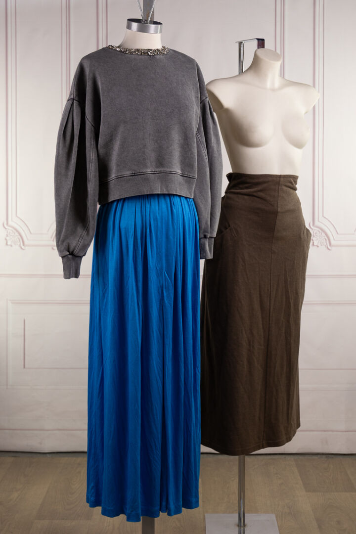 Y'S YOHJI YAMAMOTO - Ample jupe sweat taupe modulable par ceinture à deux amples poches. Nous joignons un sweat chiné gris SANDRO, encolure ronde bijoux et une jupe culotte turquoise INDRESS. Tailles 3 et 2