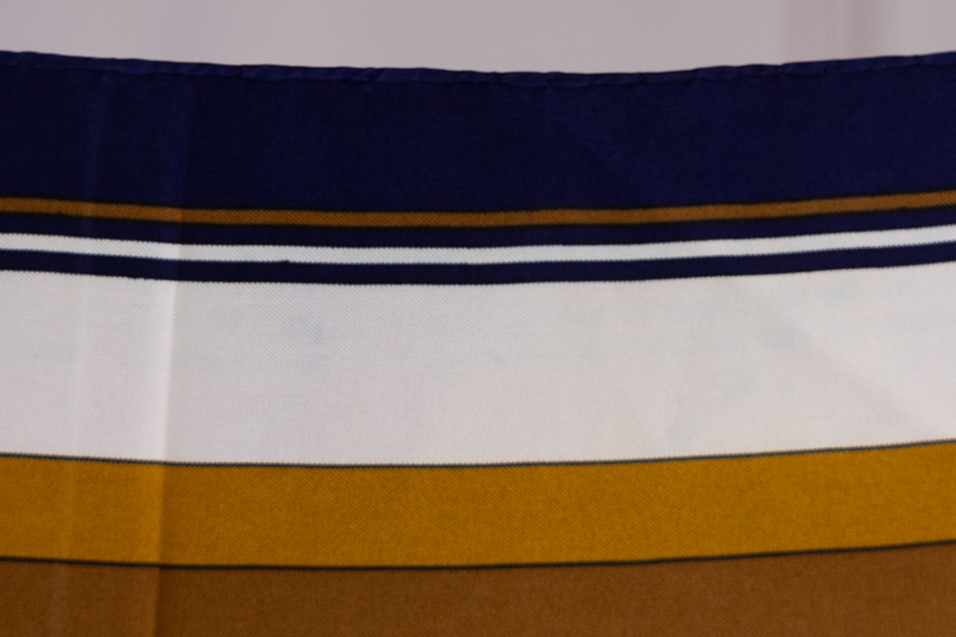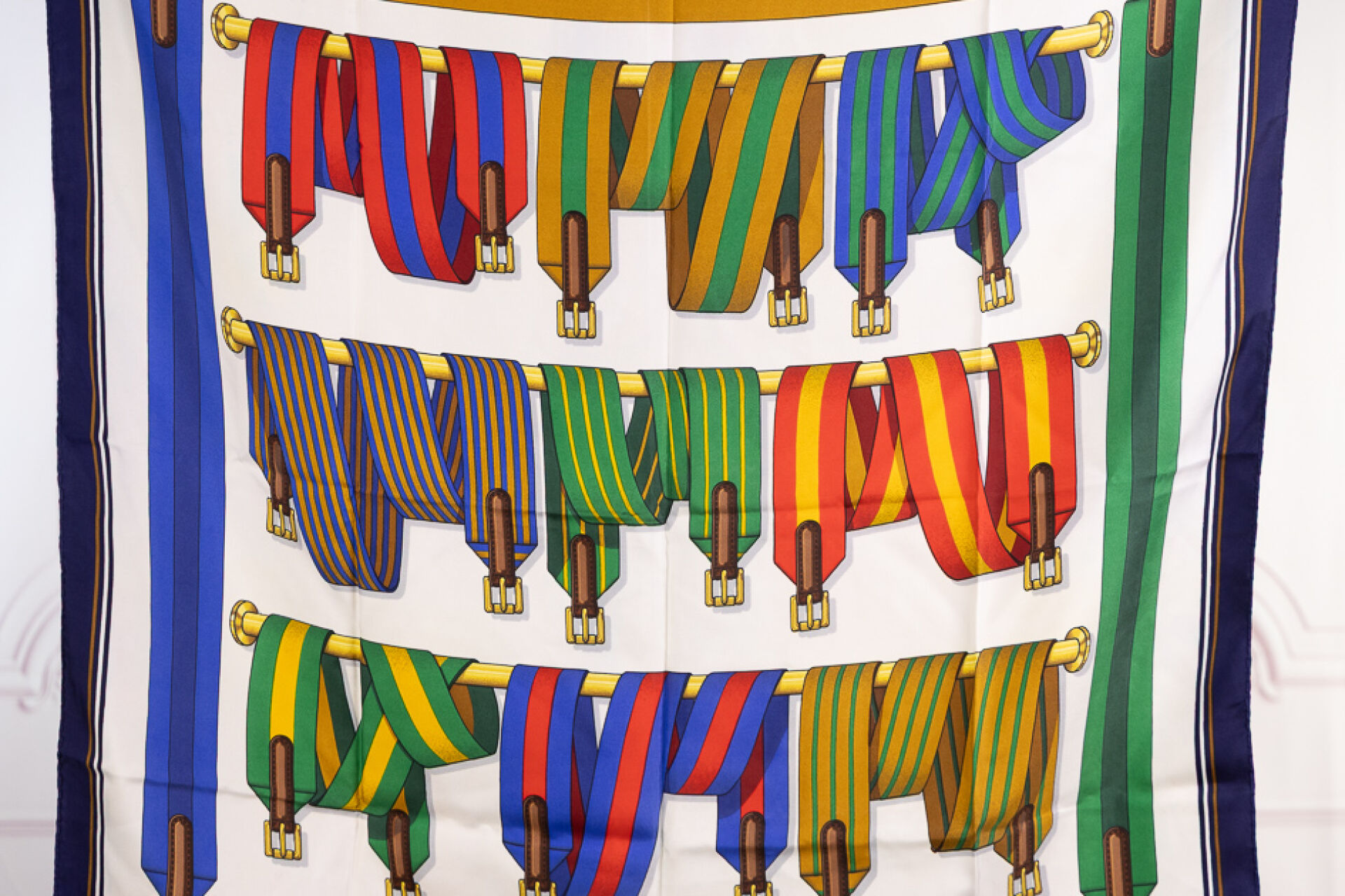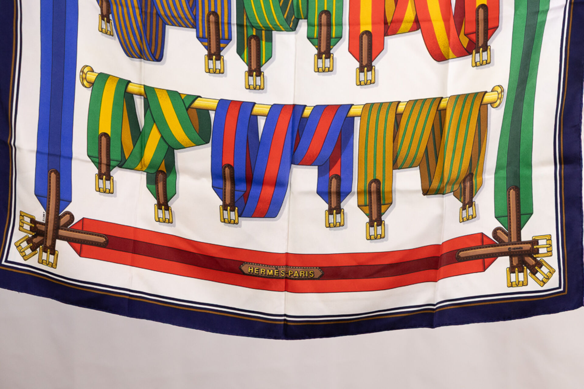 HERMES Paris - Carré en twill de soie imprimé, des Sangles entrelacées, à dominantes rouge, vert et bleu sur fond blanc et bord marine. 90 x 90 cm Quelques traces