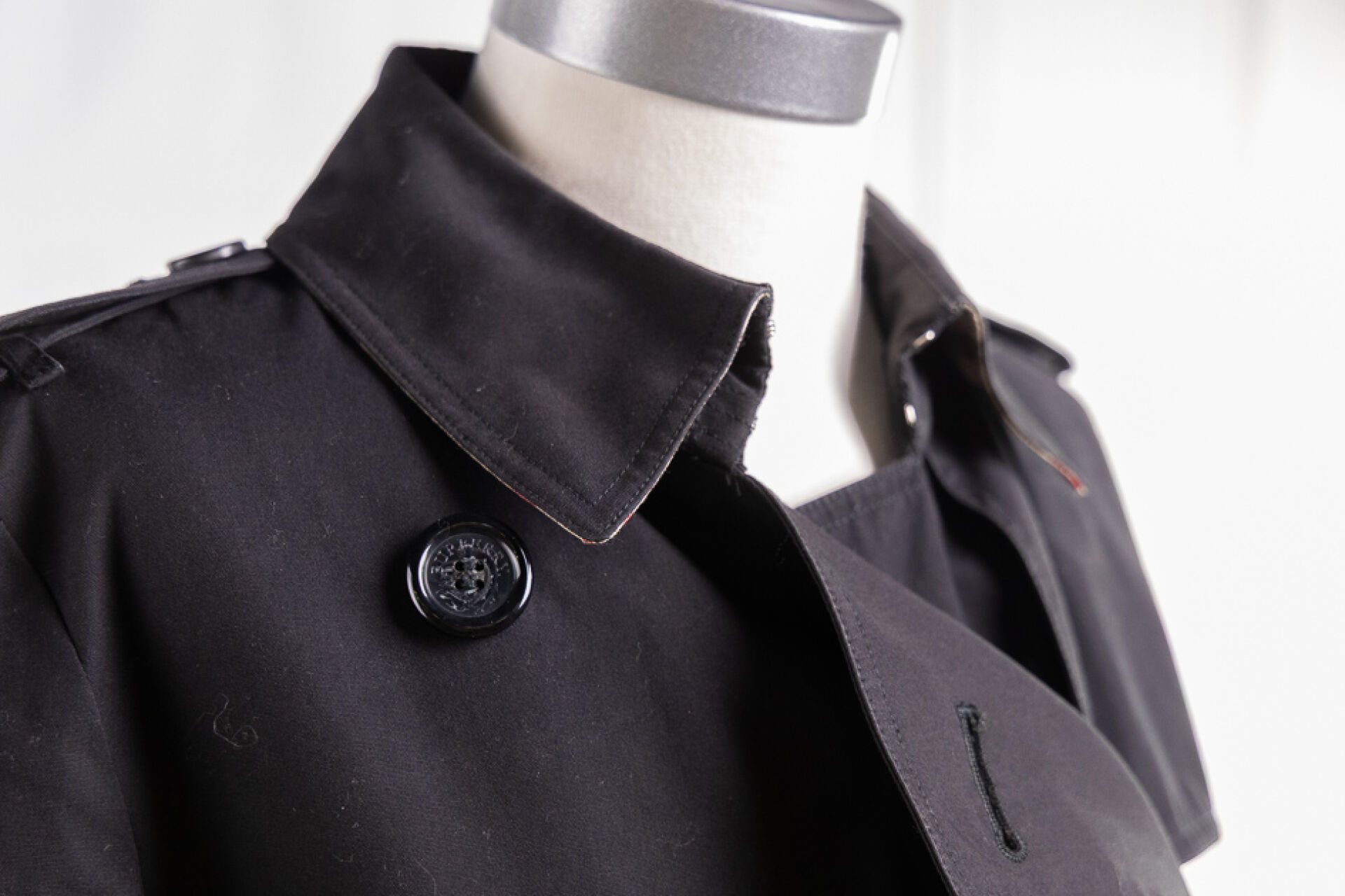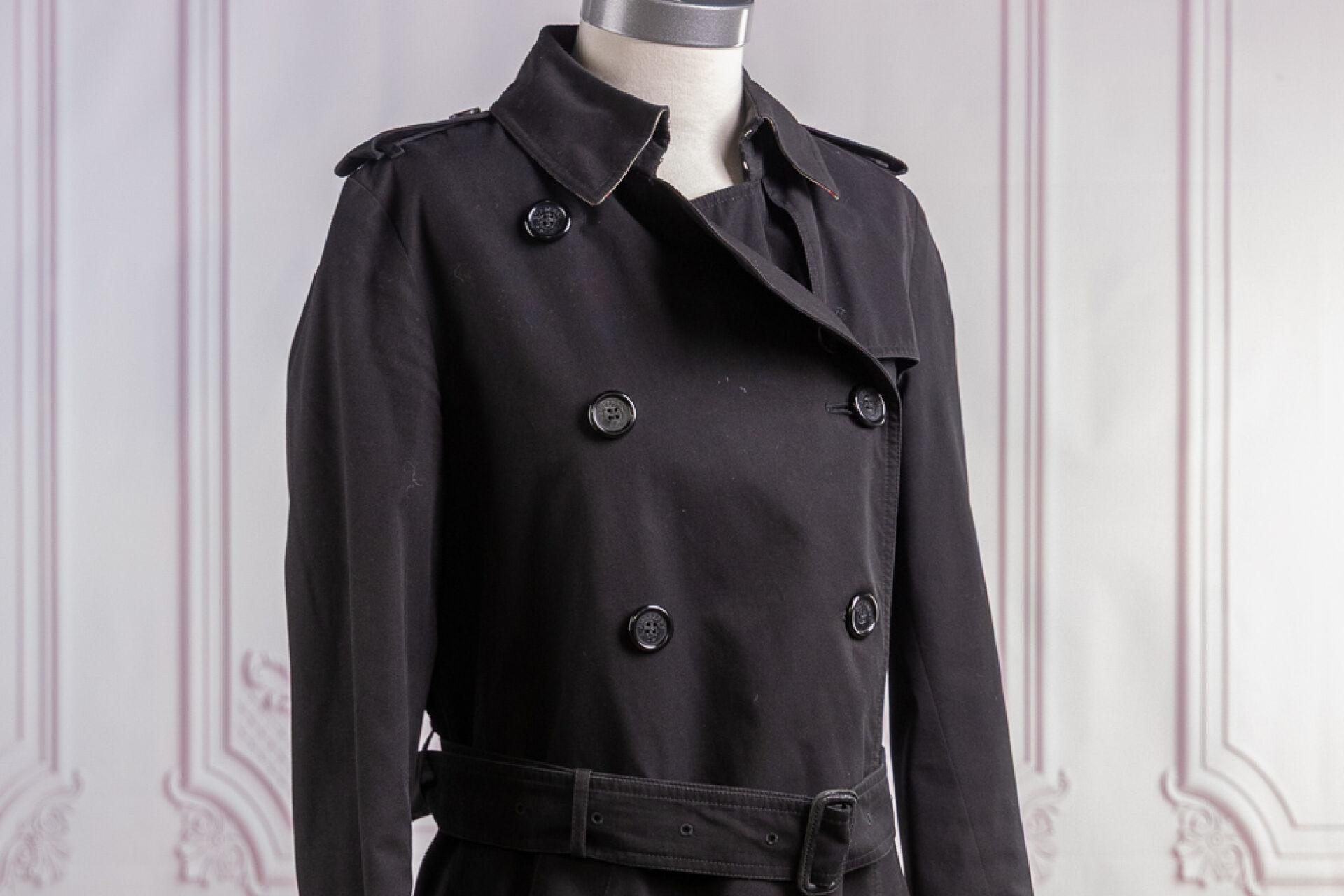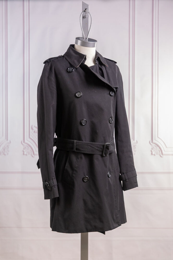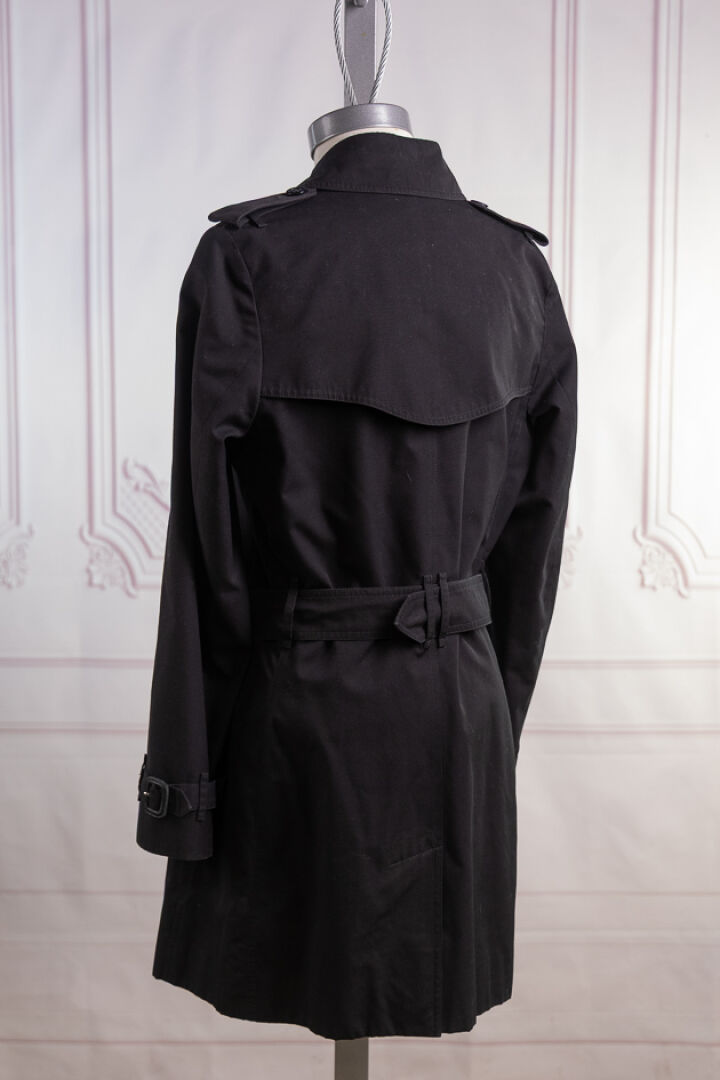 BURBERRY - Trench coat en gabardine de coton noir, petit col sur double boutonnage, manches longues, ceinture, doublure tartan beige. Taille supposée 36 Déjà porté, bon état général