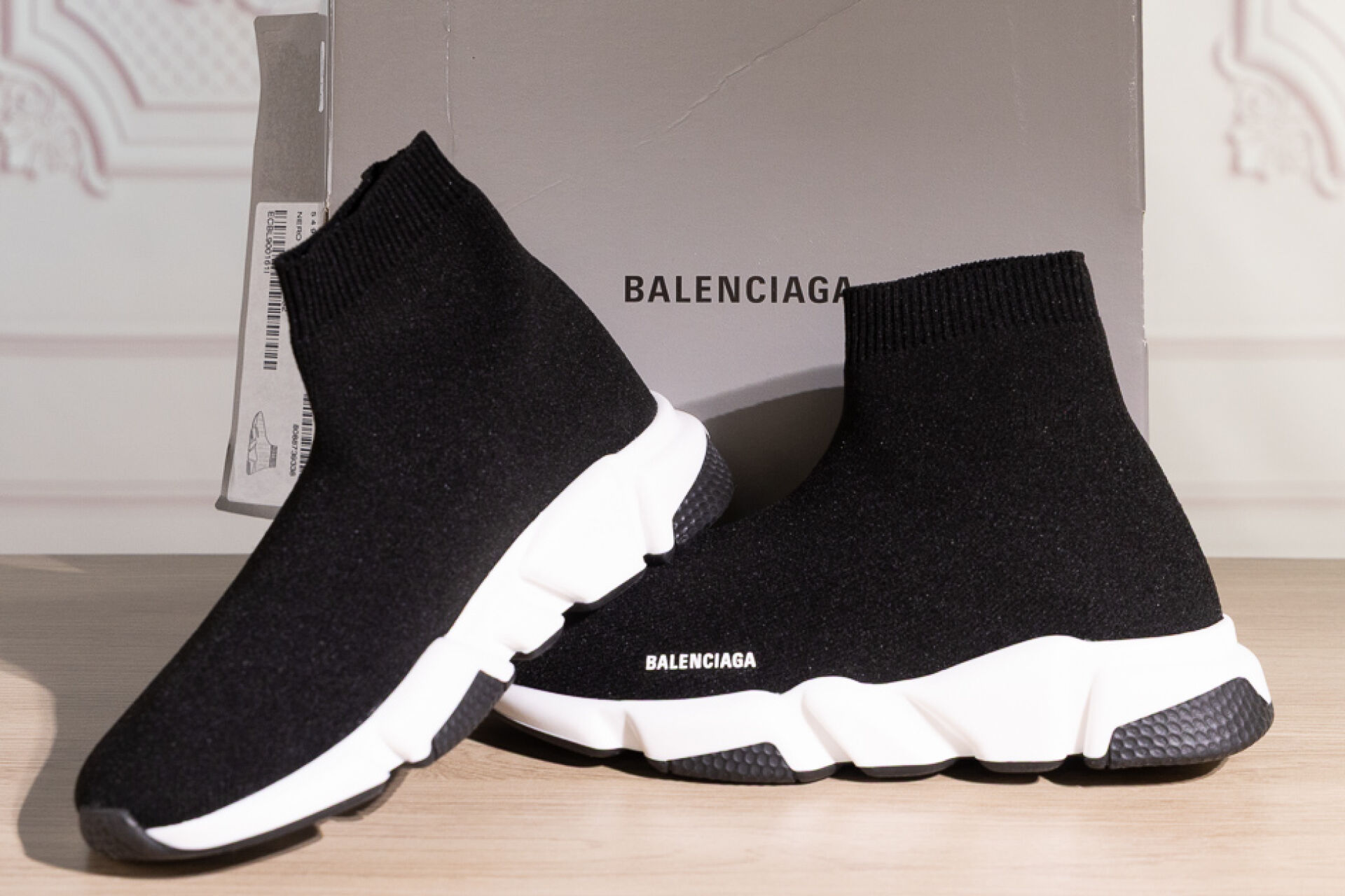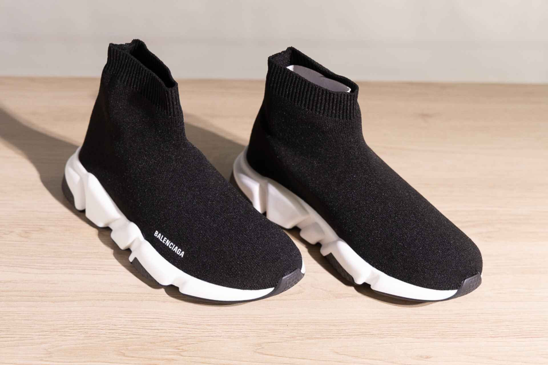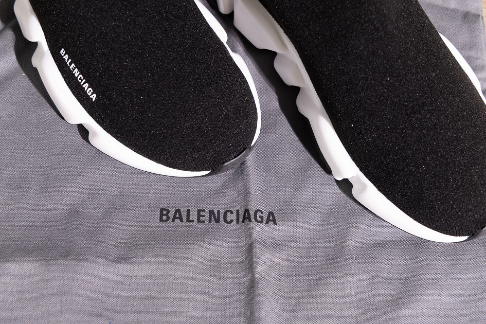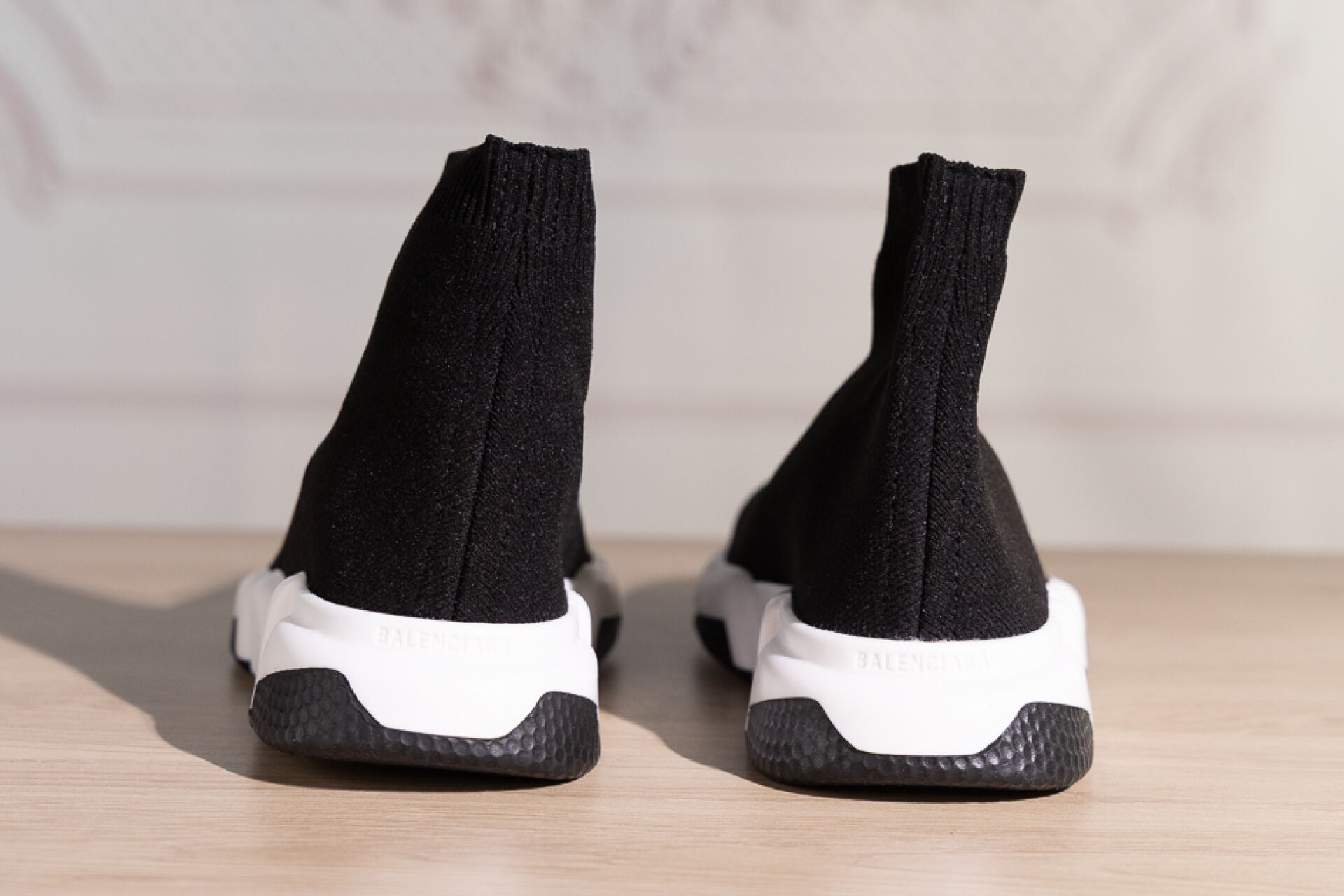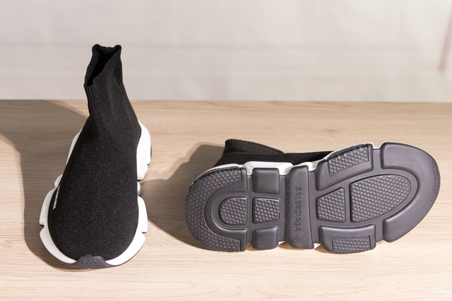 BALENCIAGA - Paire de chaussures-chaussettes montantes noires, semelles bicolore blanc-noir. Pointure indiquée 31-32 Non portées, housse, boite
