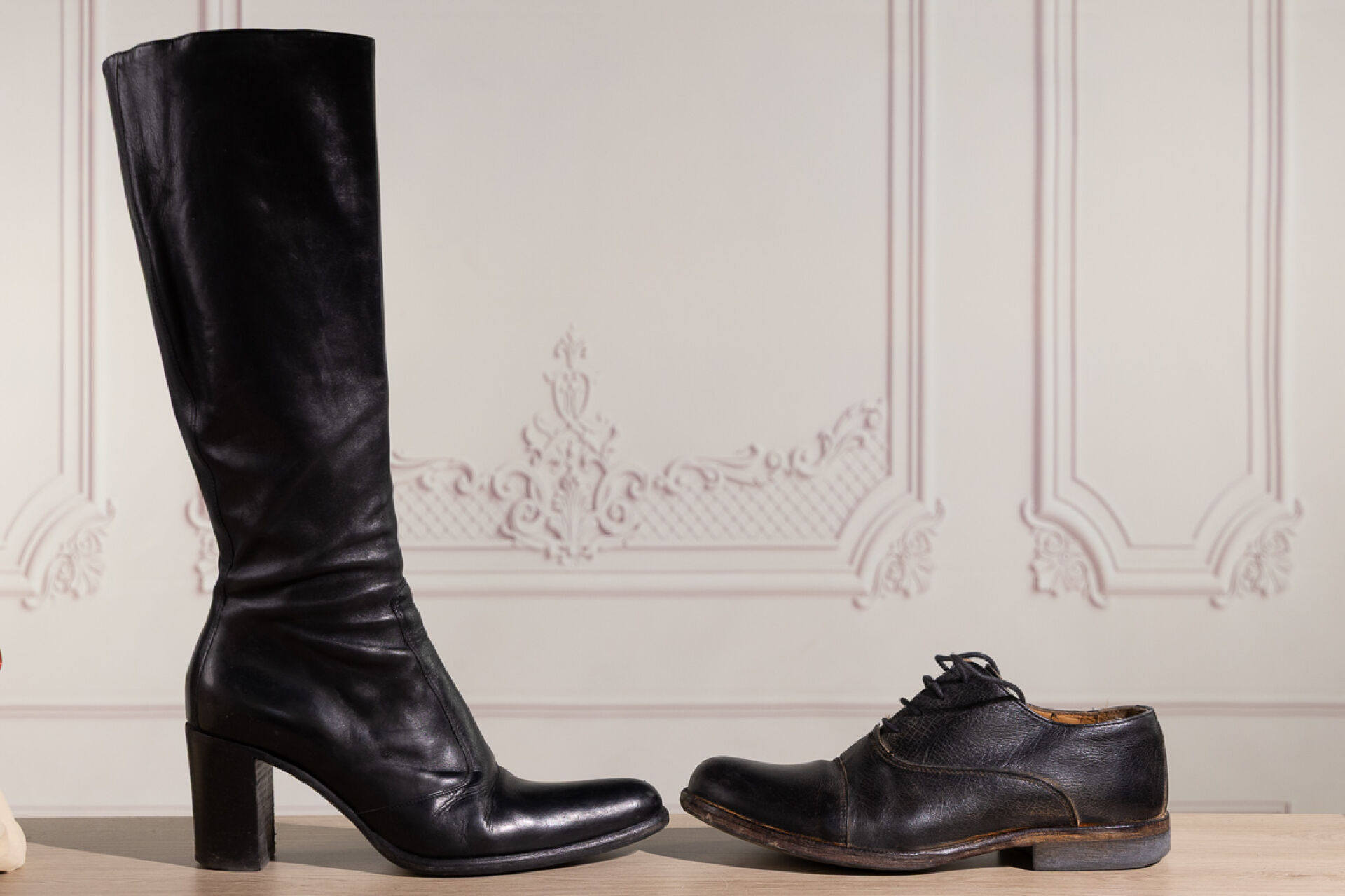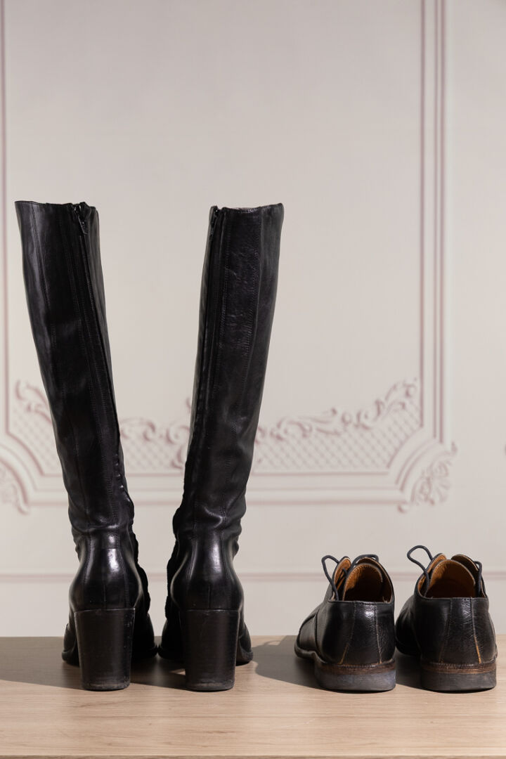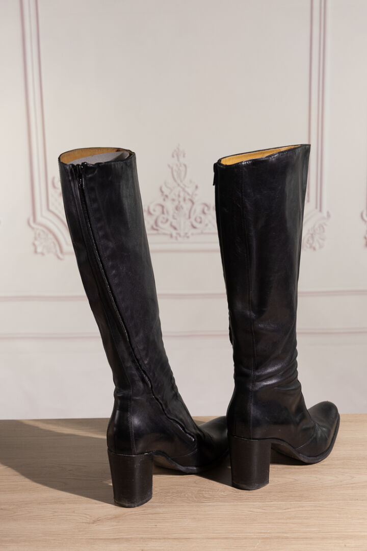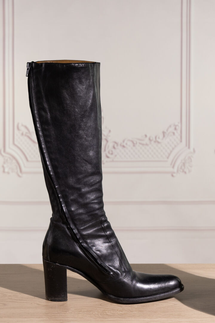 FREE LANCE - Paire de bottes en cuir noir, zippée. Pointure 38,5 - Haut du talon : 6.5 cm Nous joignons une paire de derbies en cuir anthracite à lacets. Pointure 40 Déjà portées.